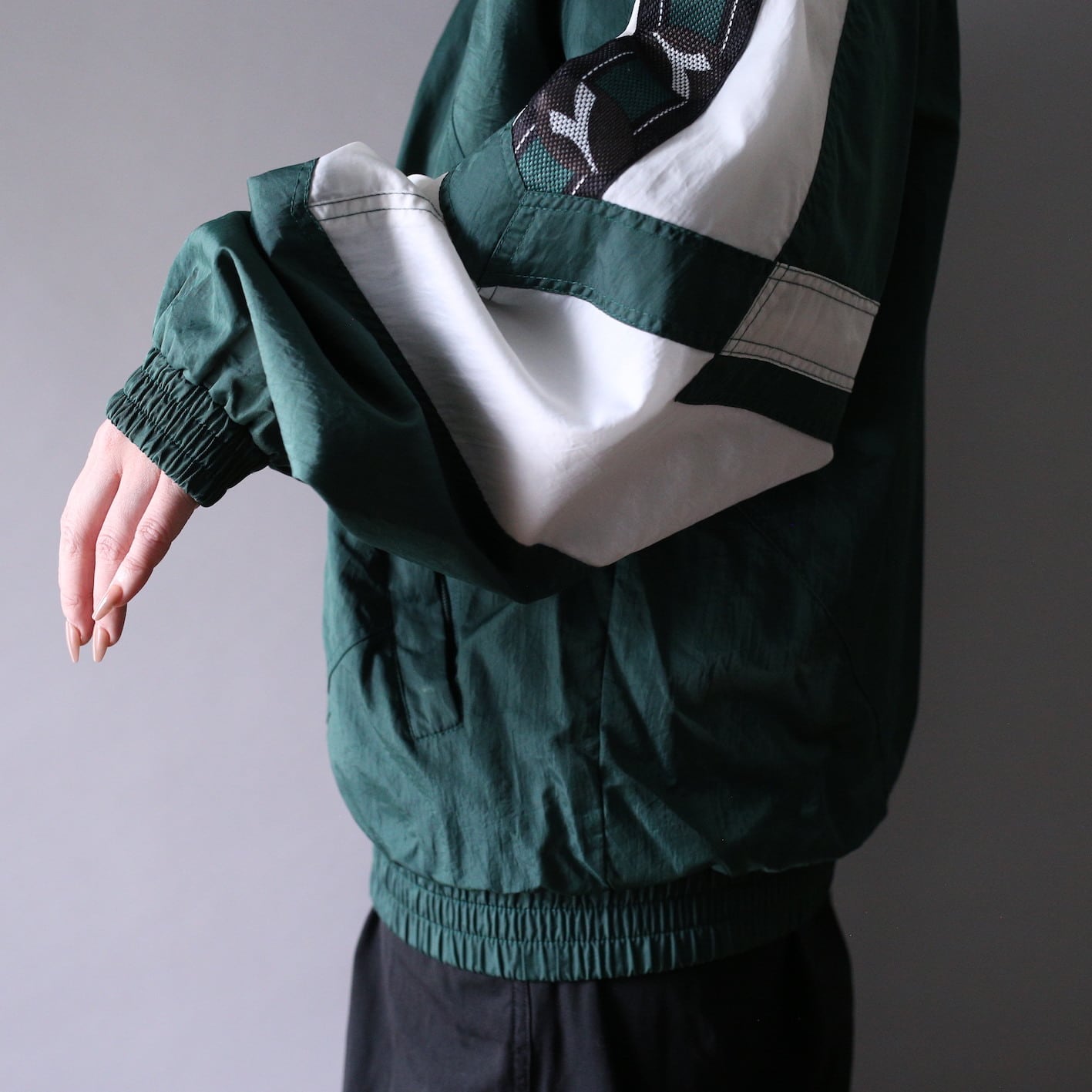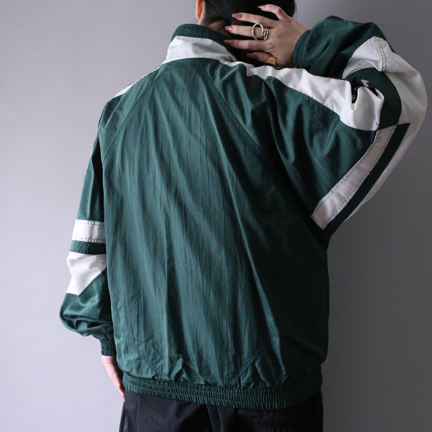 カラーは色物の中でも使いやすくかなりオススメな”深緑"をベースに白を加えた超良配色、襟や袖を中心に幾何学的な切り替えを施しサイバーライクな仕上がりに◎