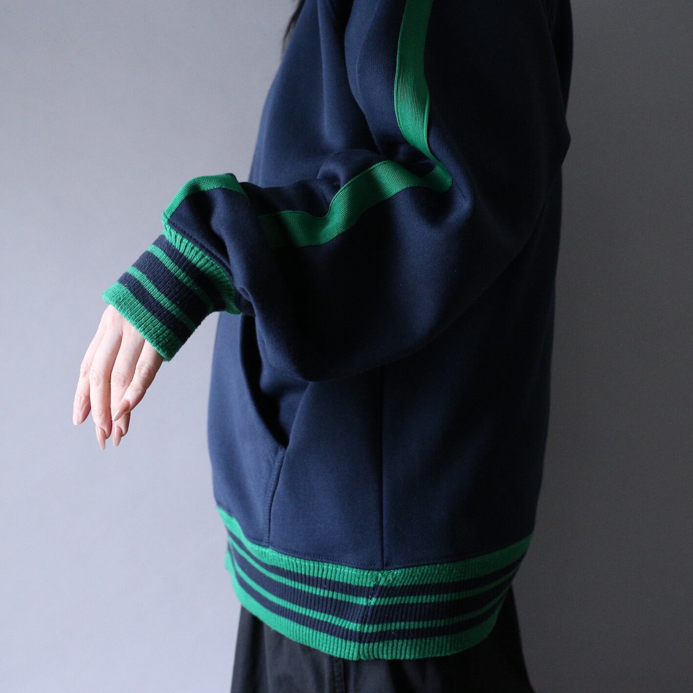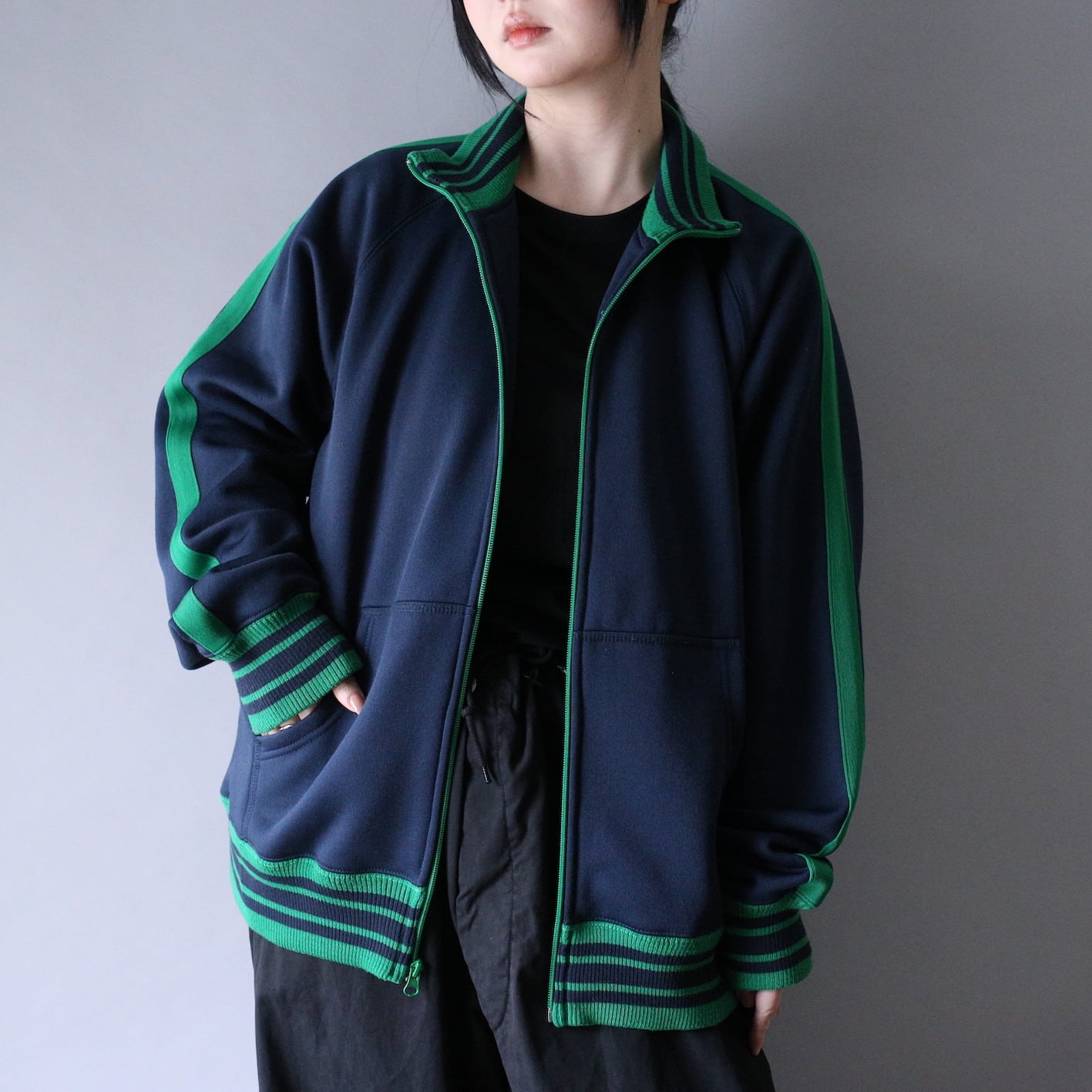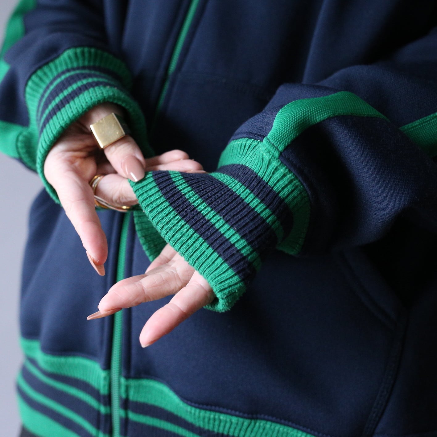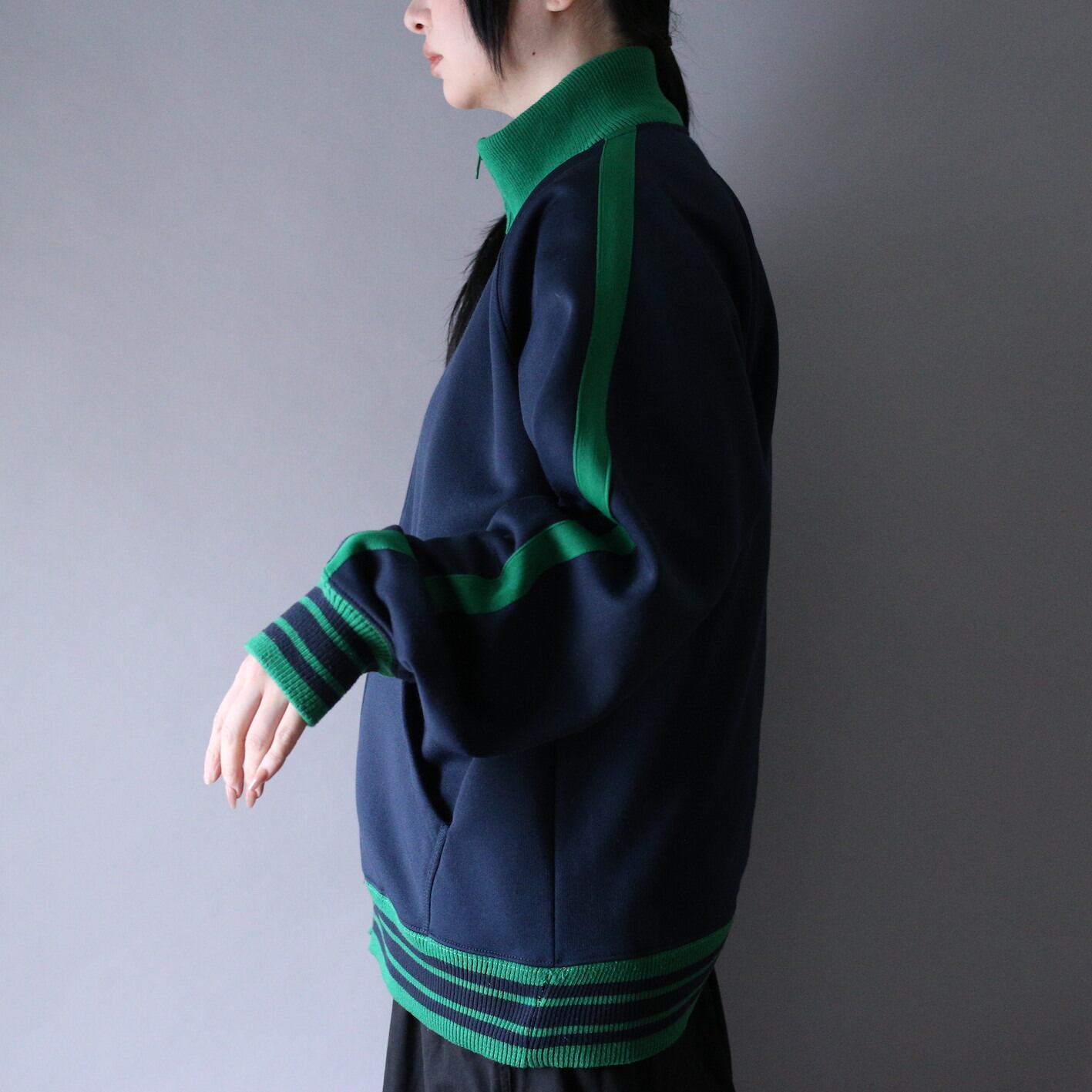 ネイビーをベースに色鮮やかな”緑”がアクセントとなった良配色、リブやサイドラインなどシルエットを引き立たせる色の配置もめちゃくちゃ良いです◎