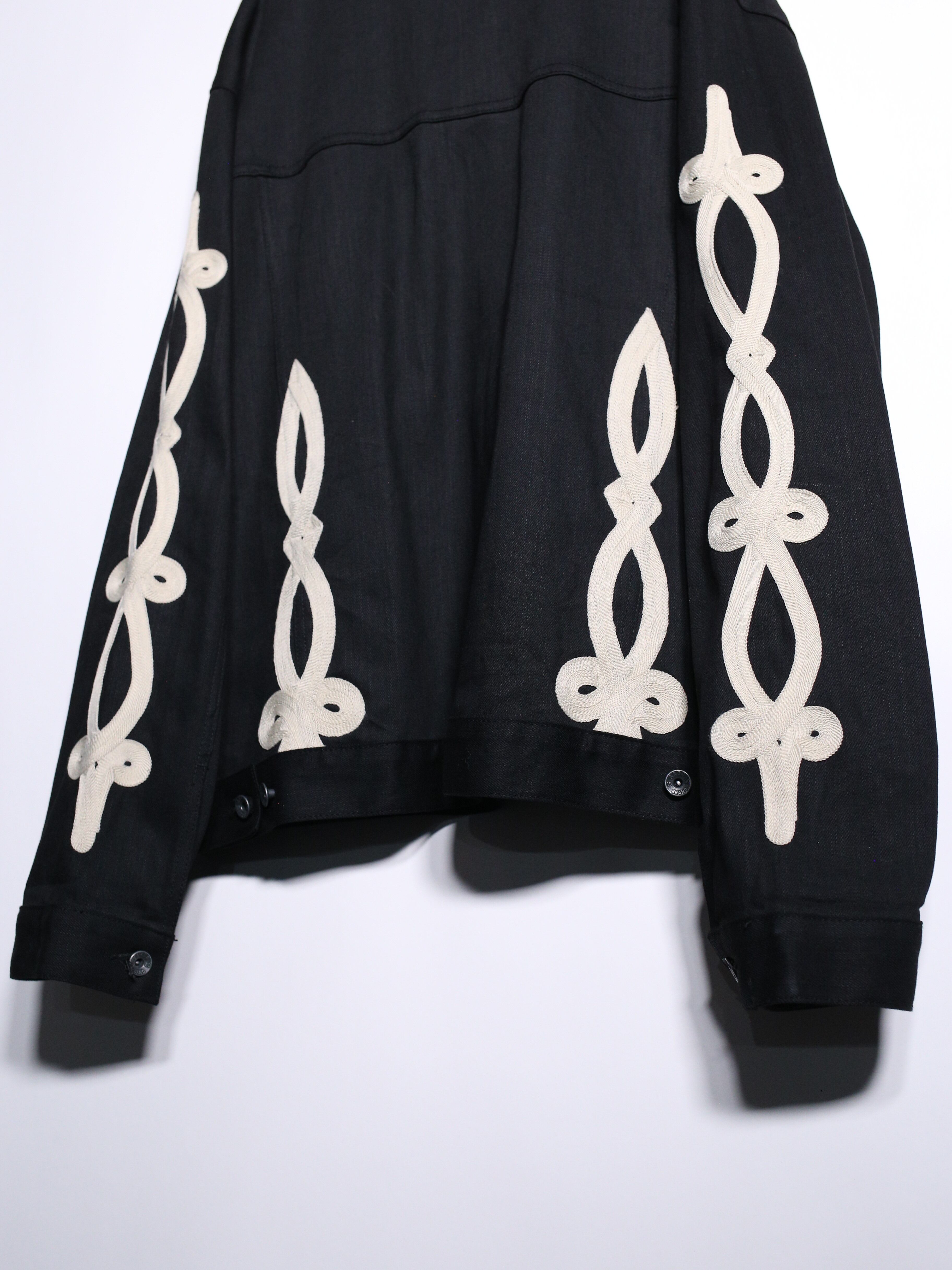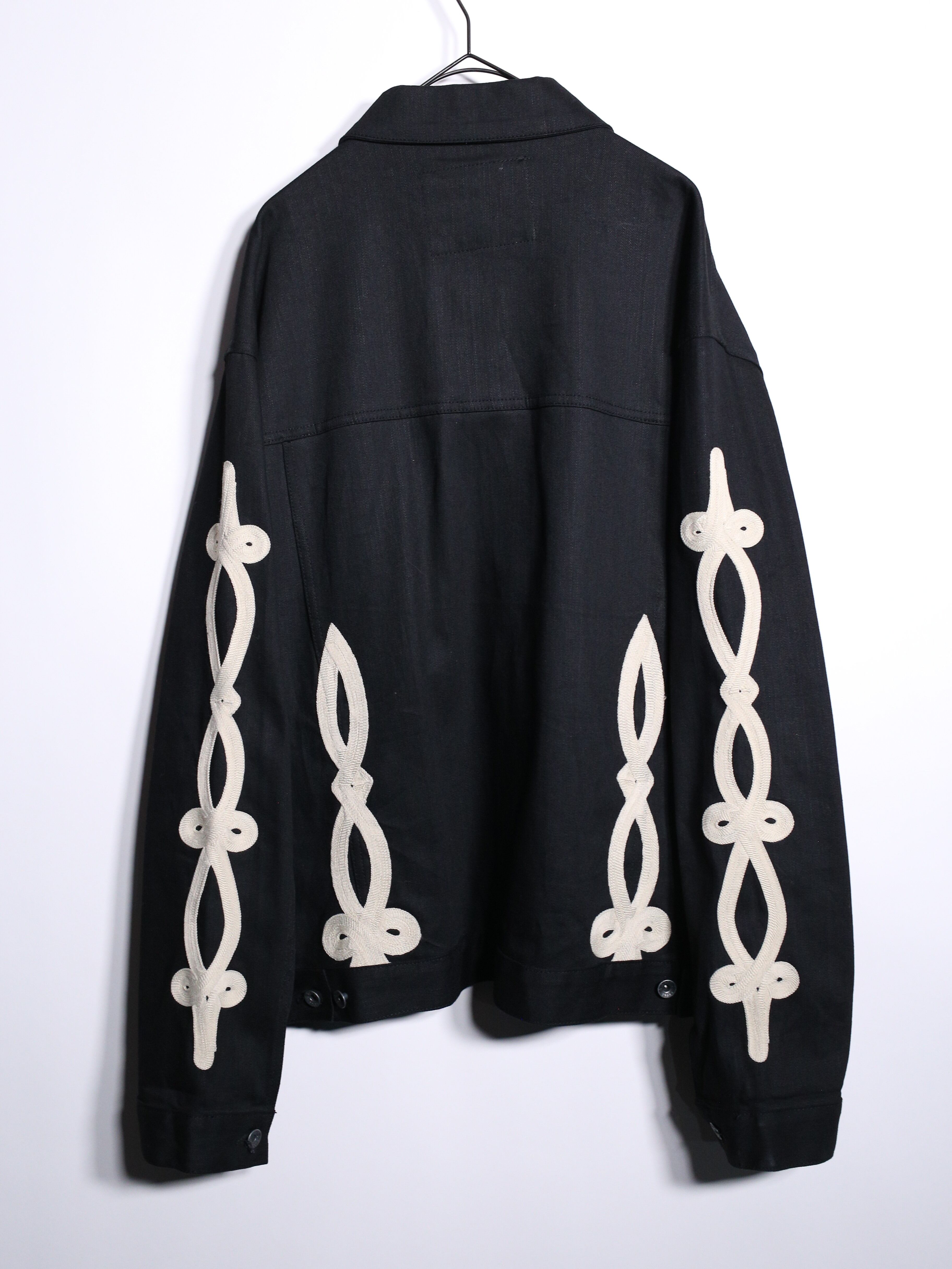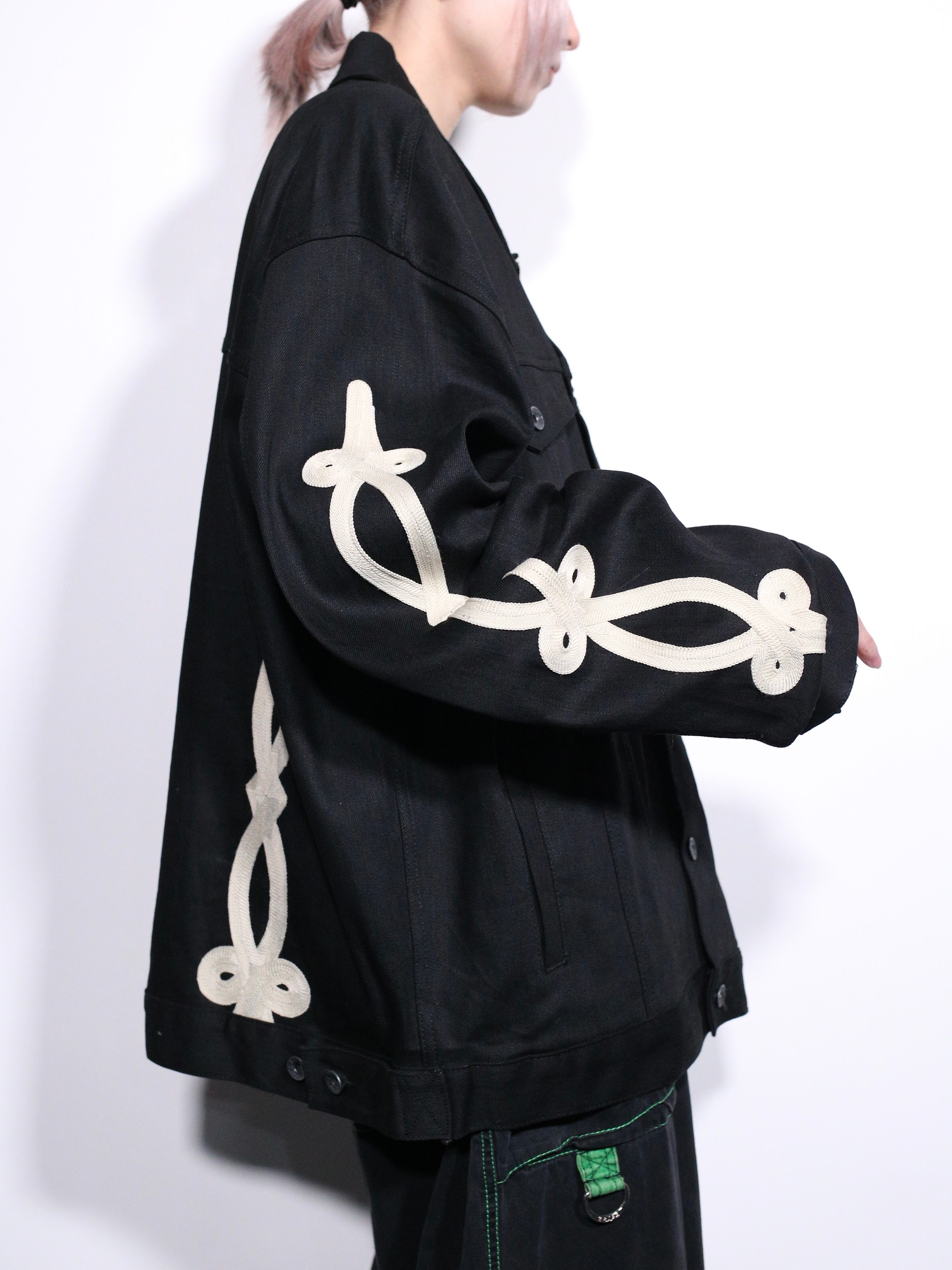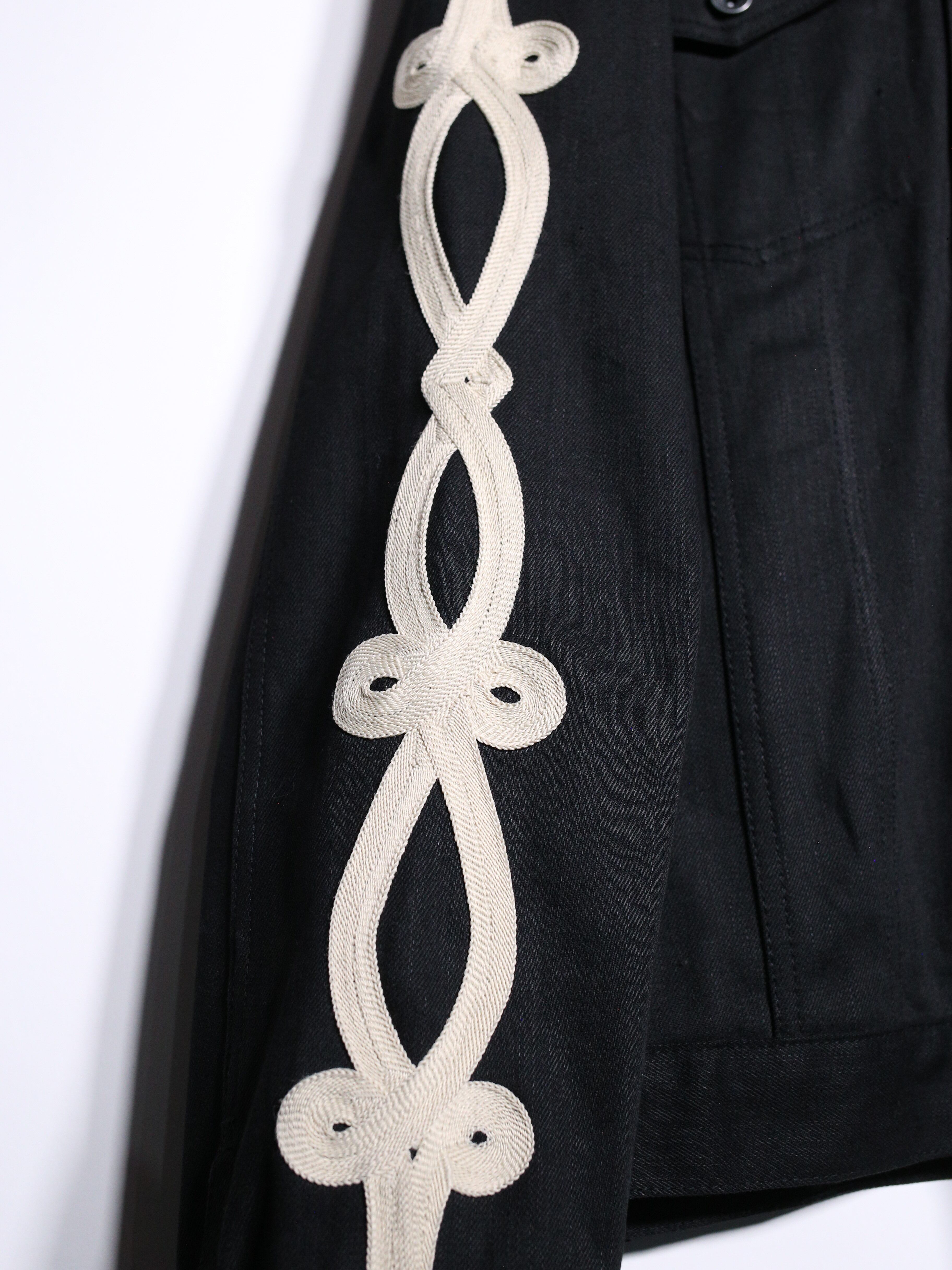 上品な艶を放つブラックデニムに両袖と背中に結び込まれたロープディテールがハイセンスな逸品。