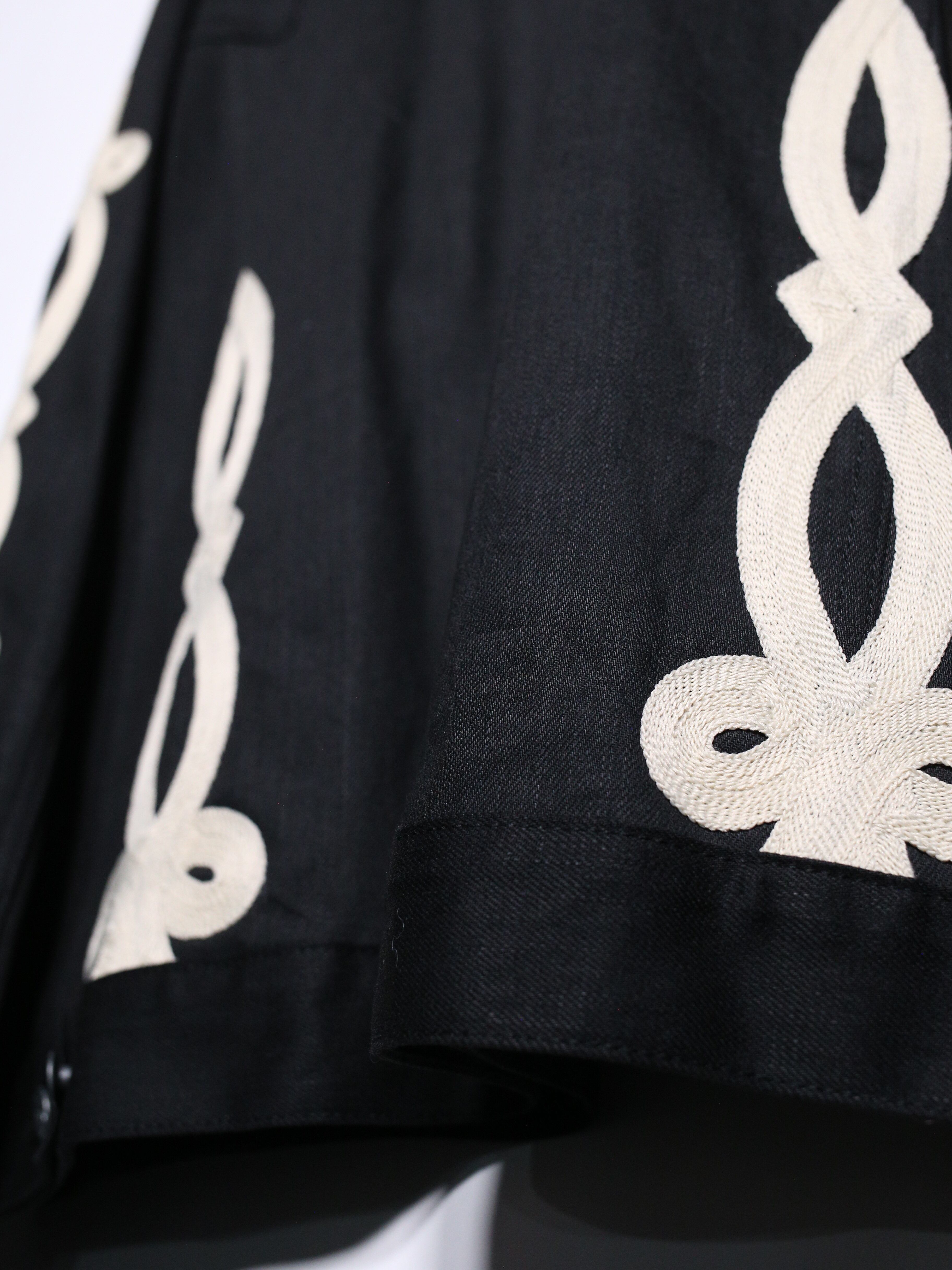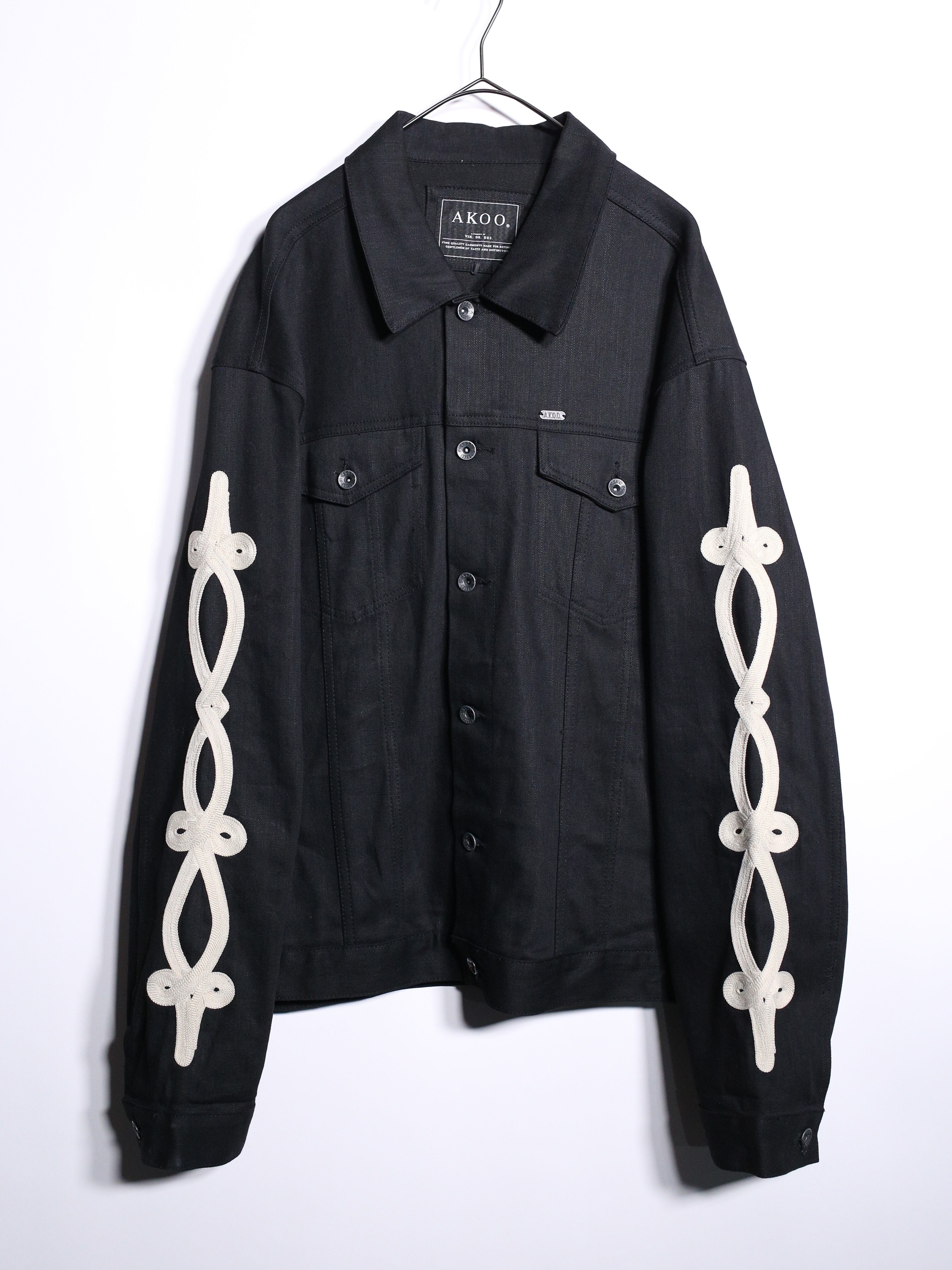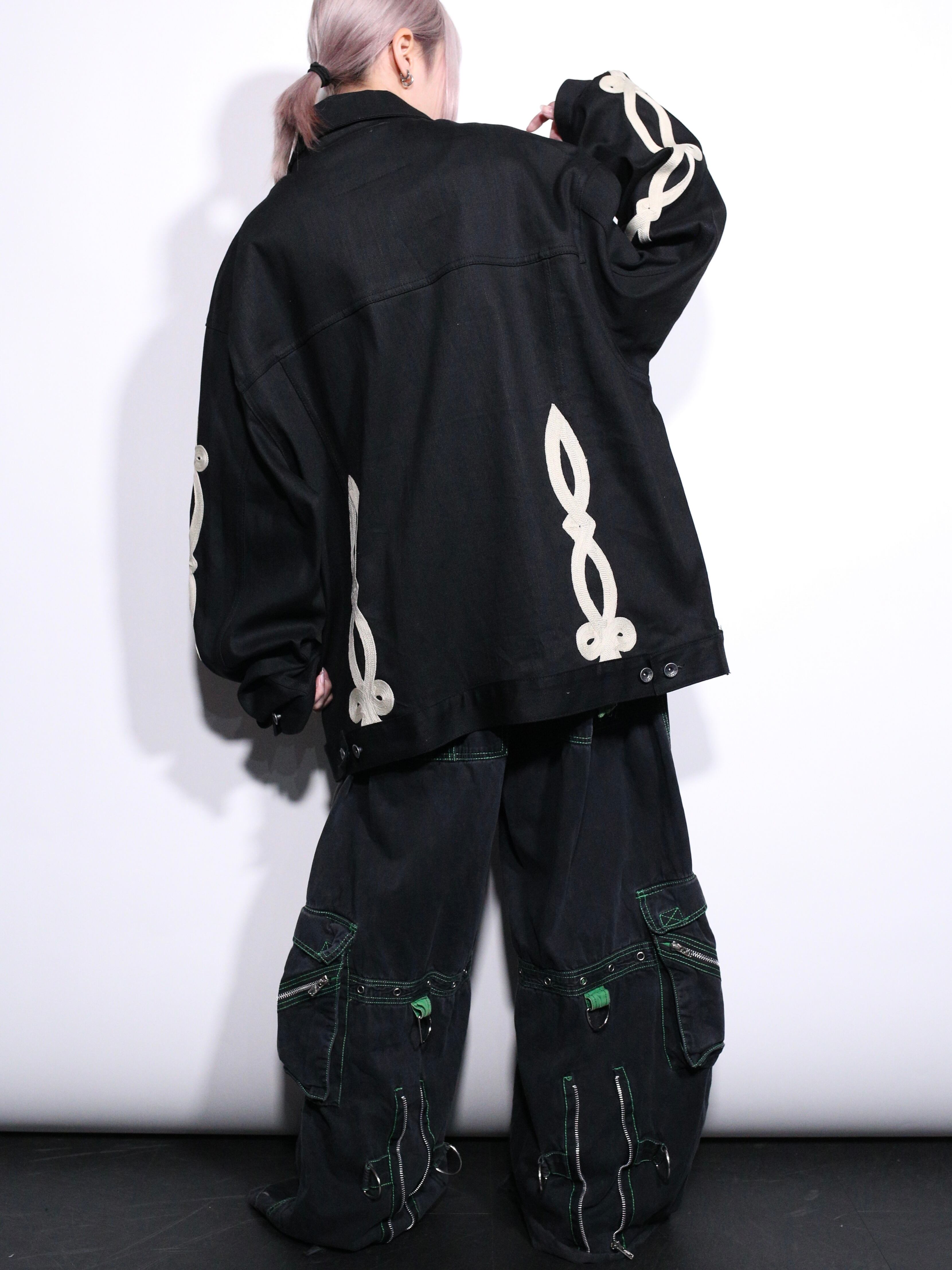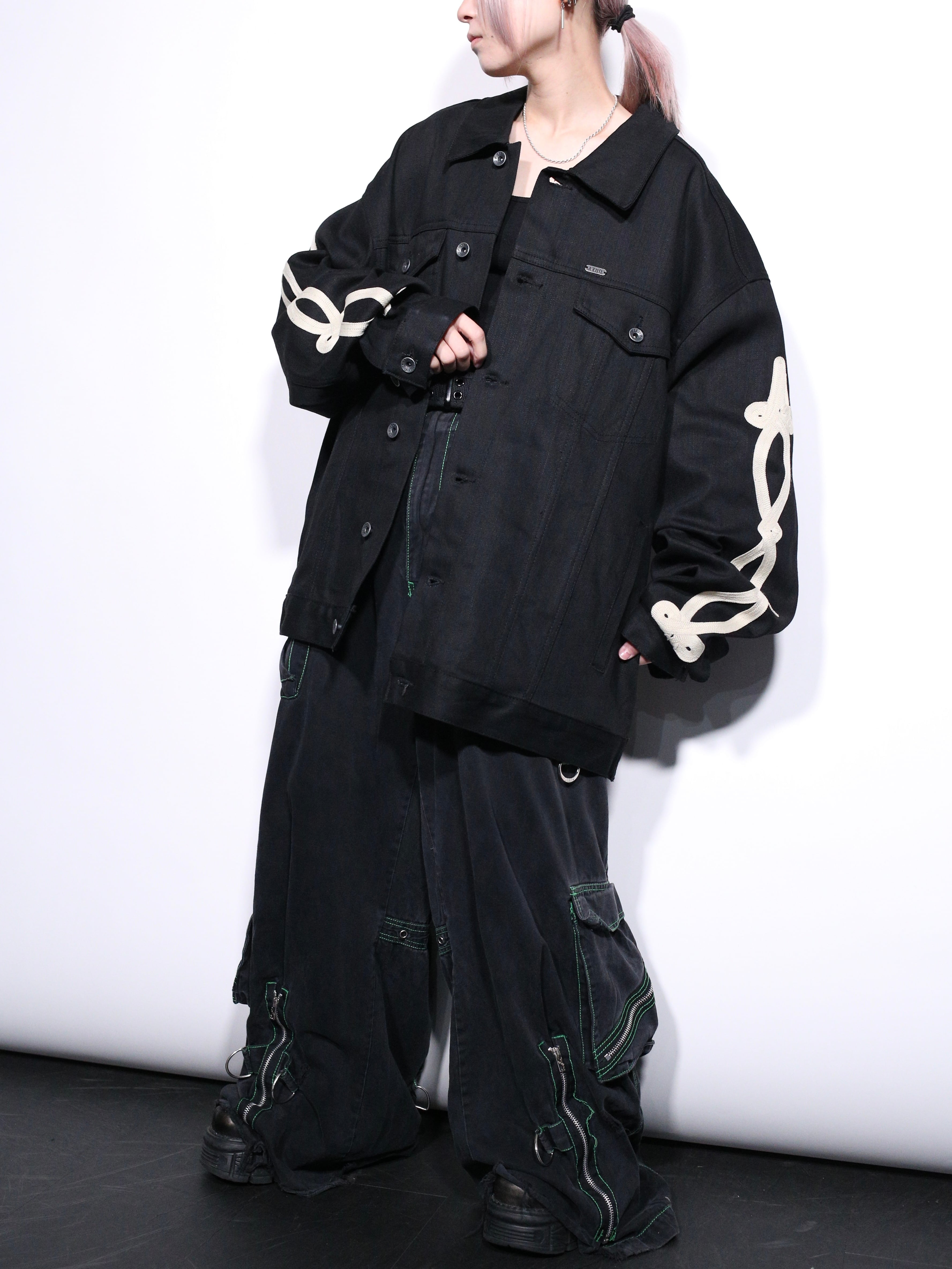 上品な艶を放つブラックデニムに両袖と背中に結び込まれたロープディテールがハイセンスな逸品。