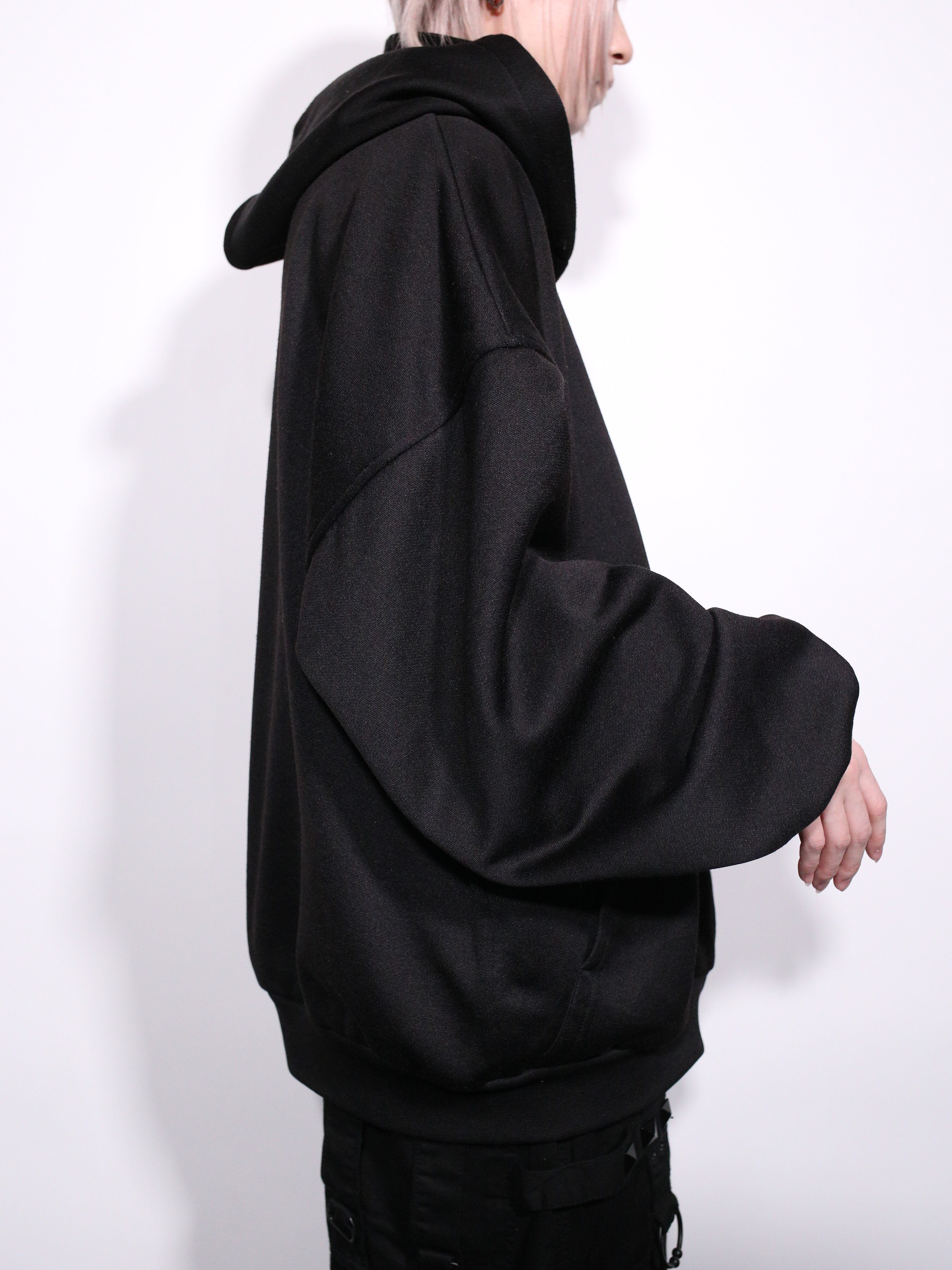 フードも立つほどの肉厚なコットンポリを使用し艶感たっぷり、テックやモードにもバッチリはまります。