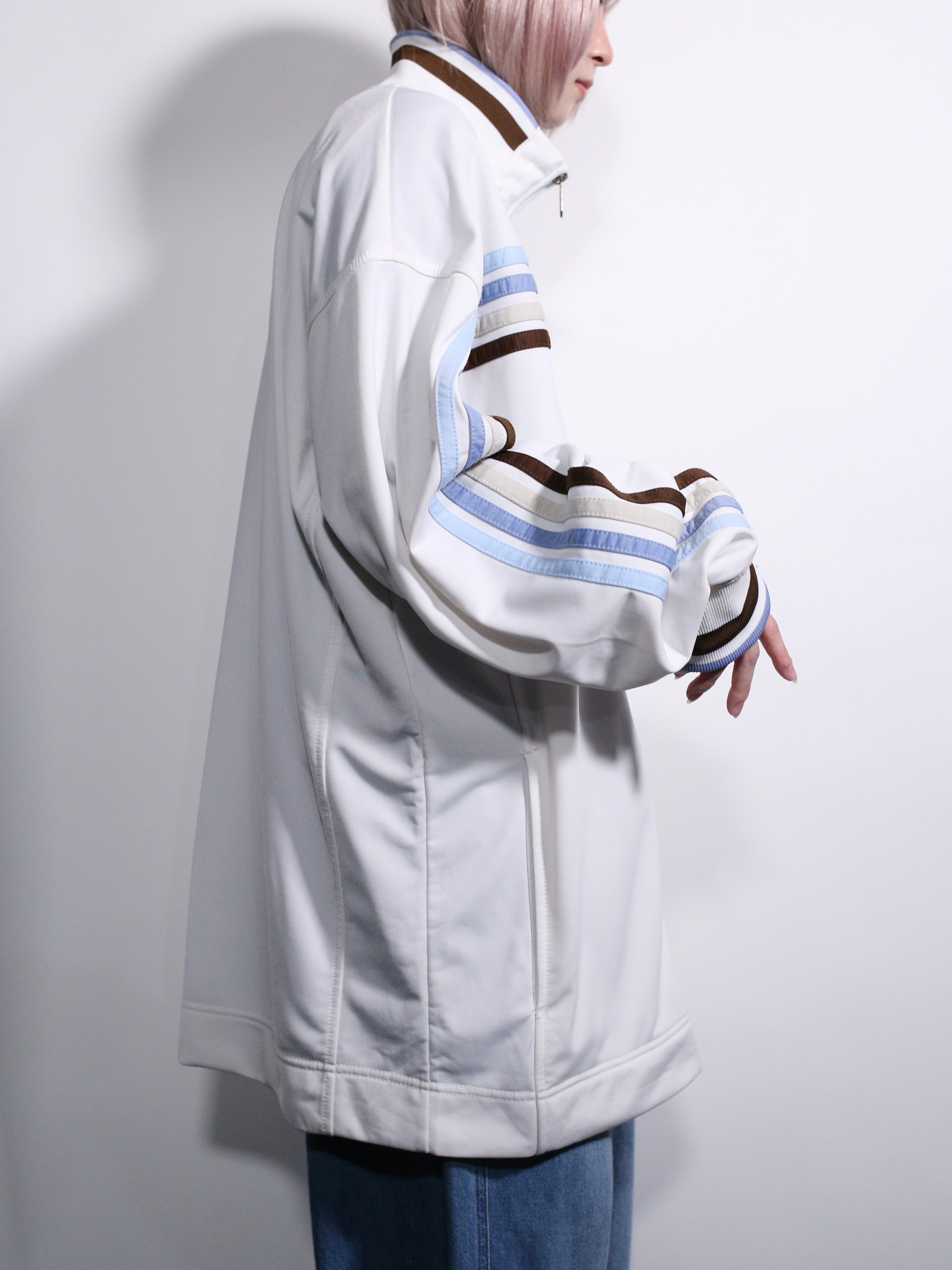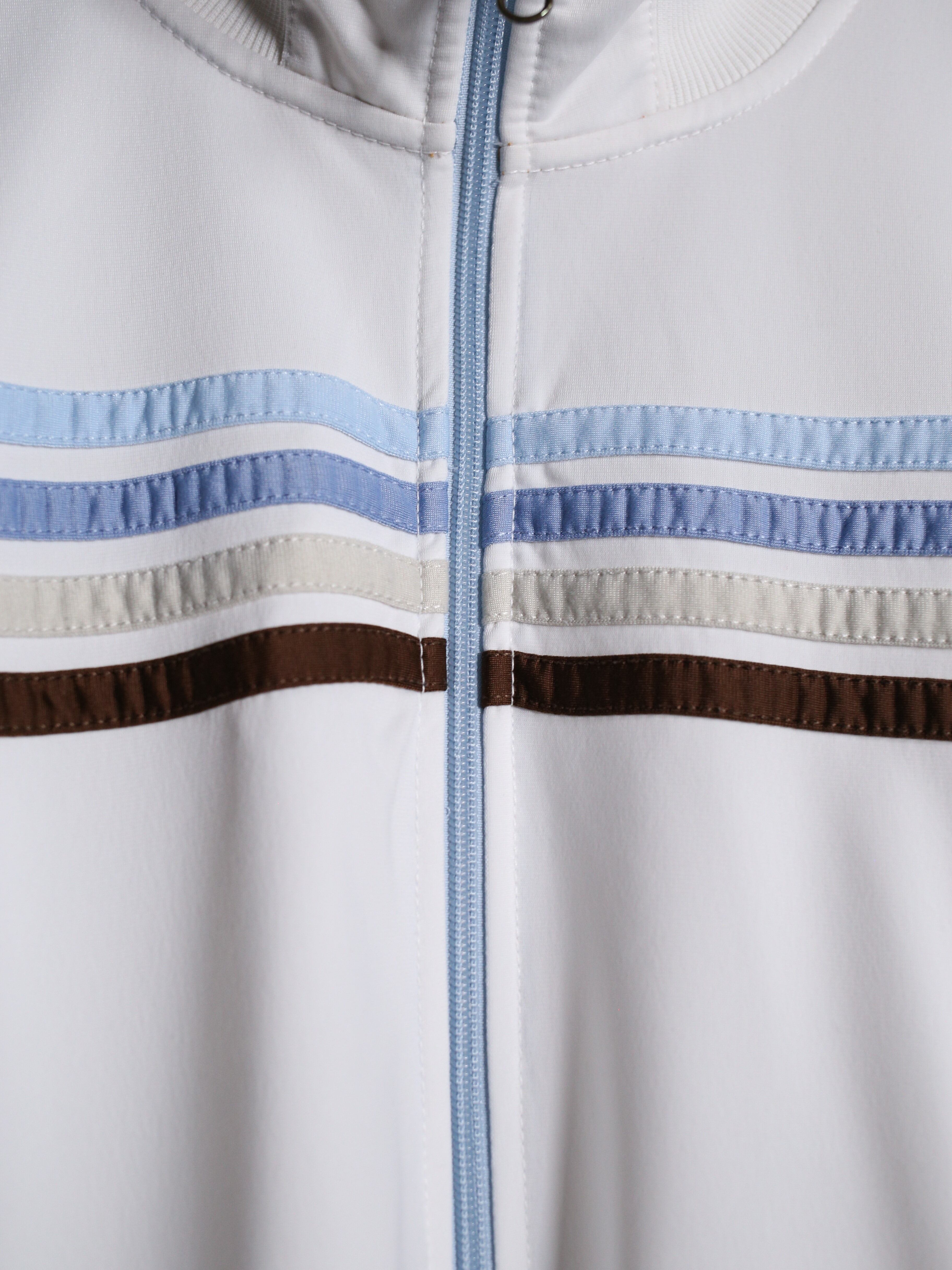 美しく艶のある白ボディにブルーやブラウンの寒色系マルチラインがテック感と遊び心を両立。