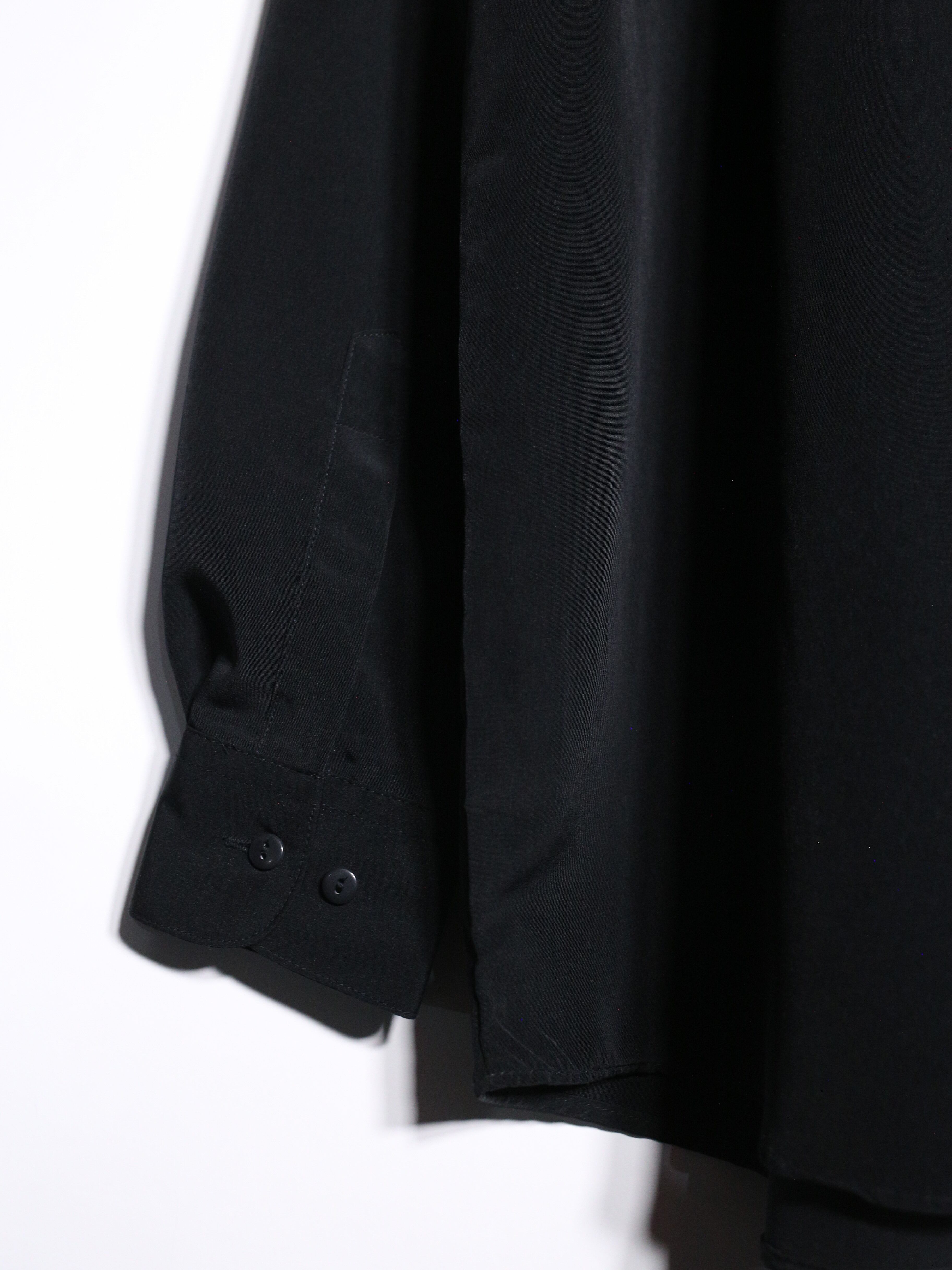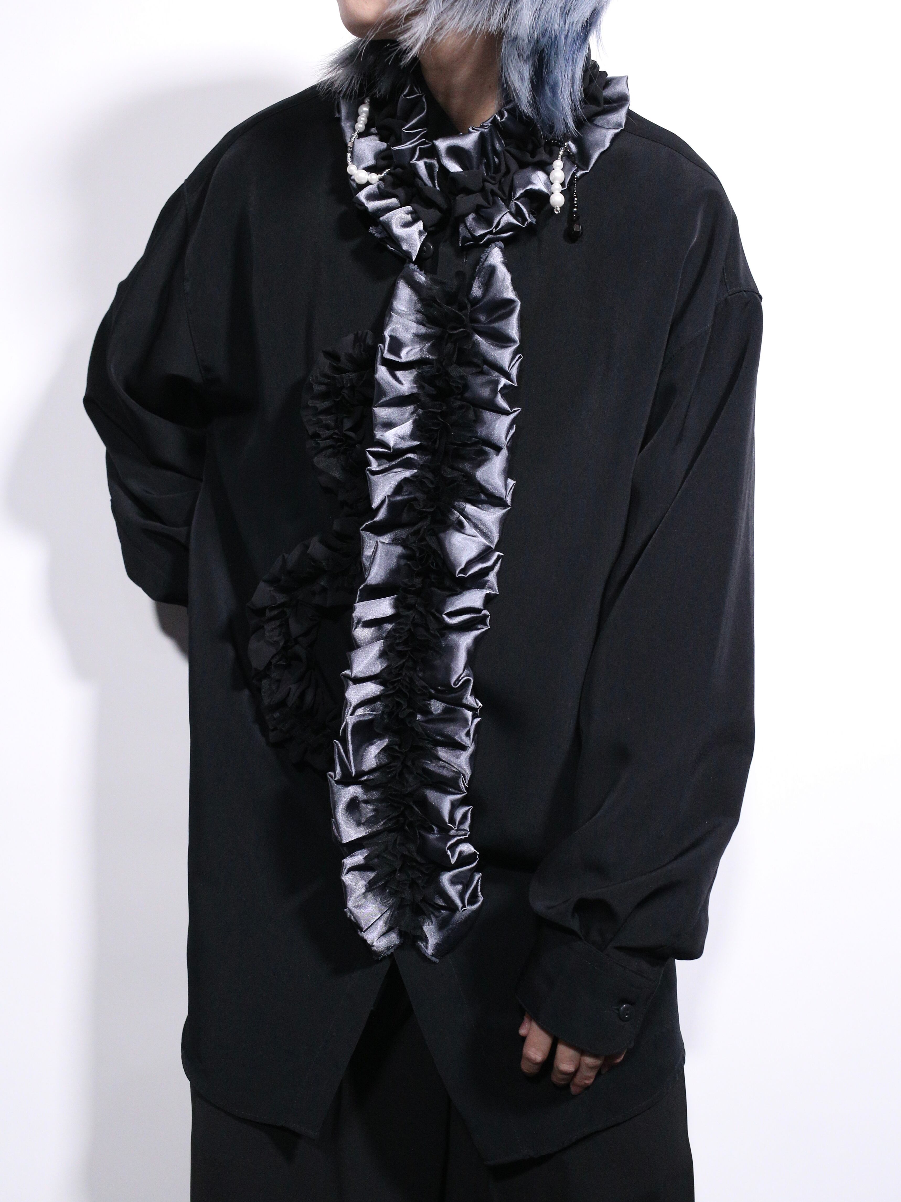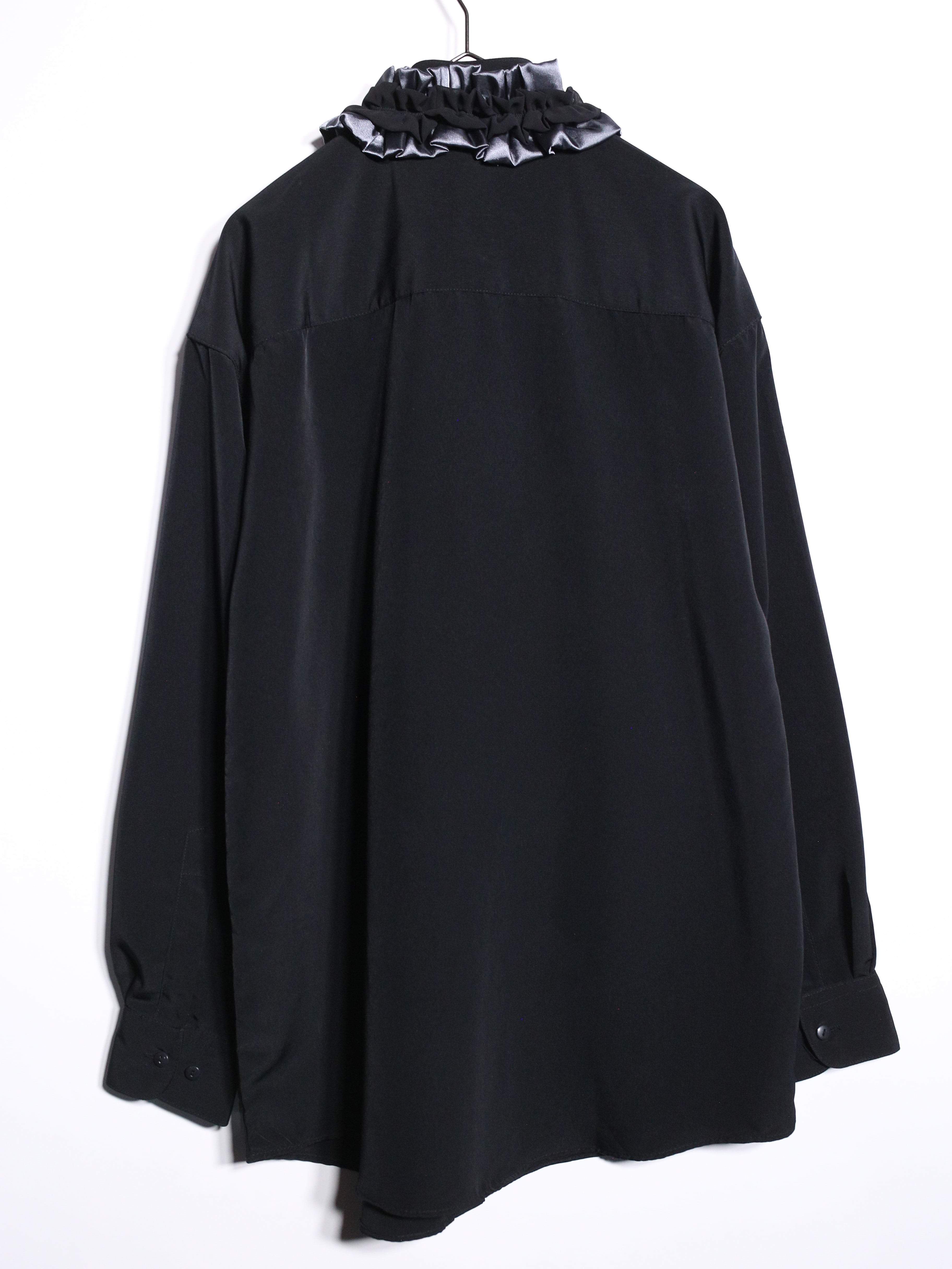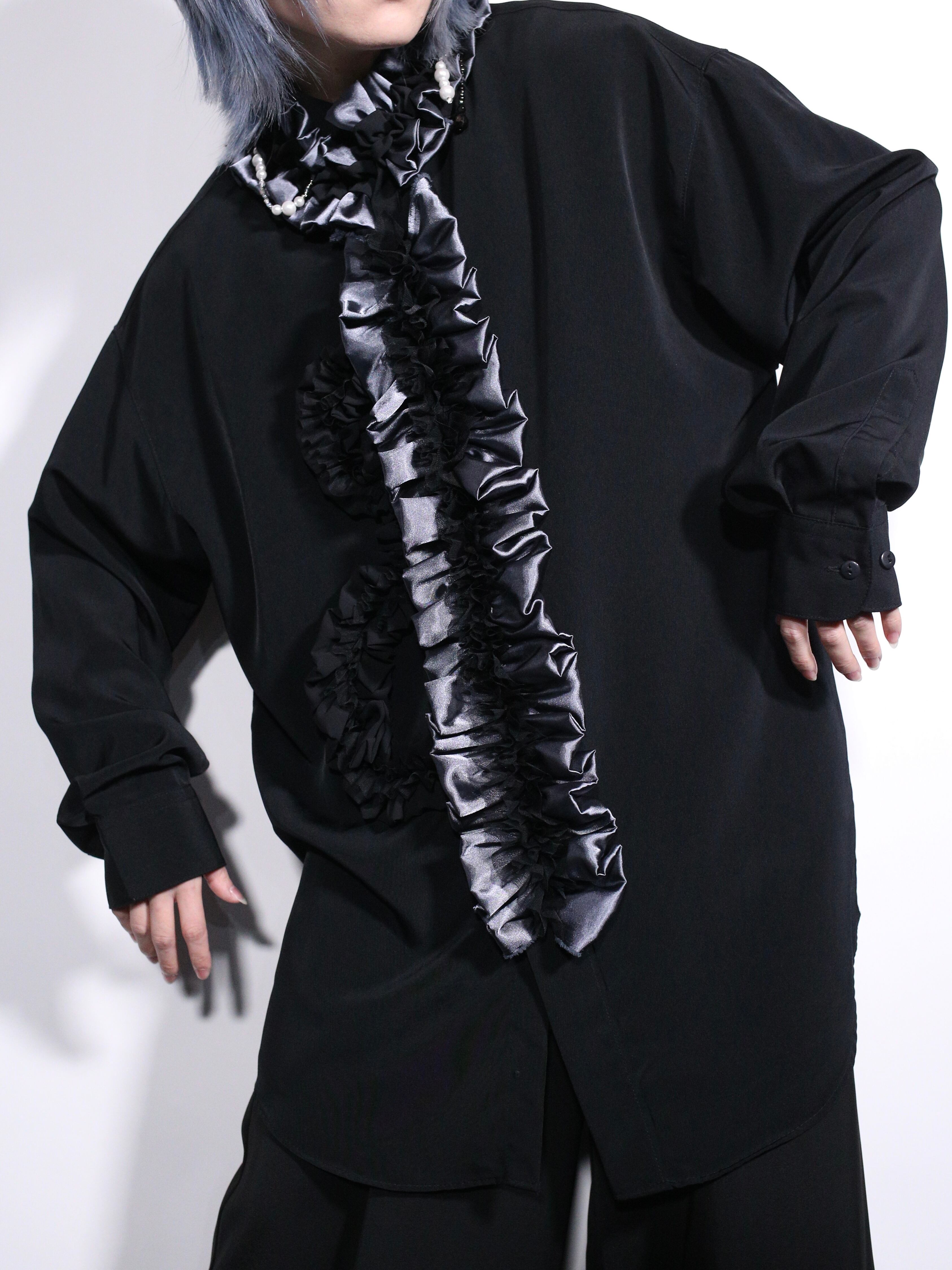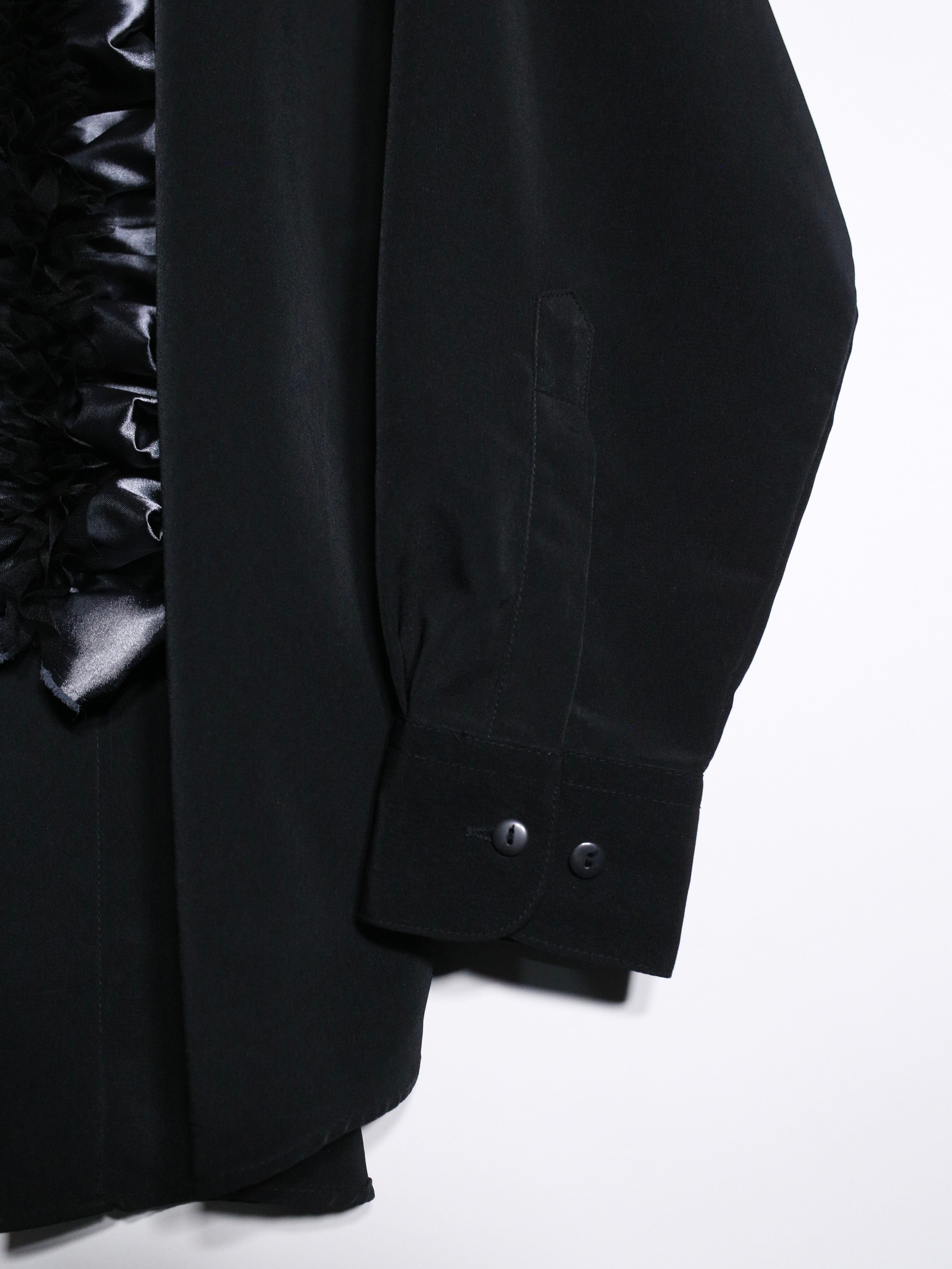 ブラックサテンの比翼シャツにラグジュアリーなエレガンスを加えた唯一無二なリメイクピース。