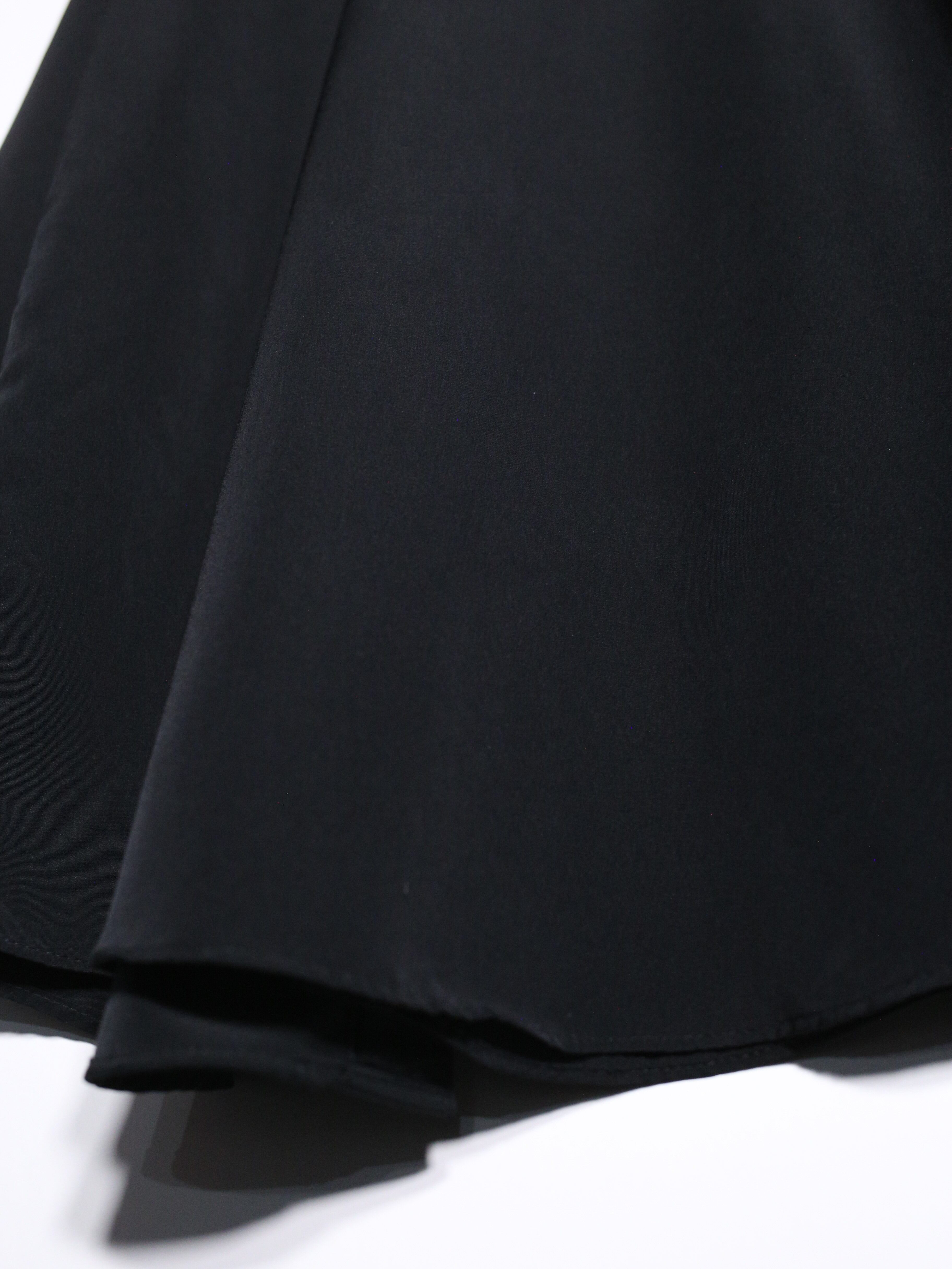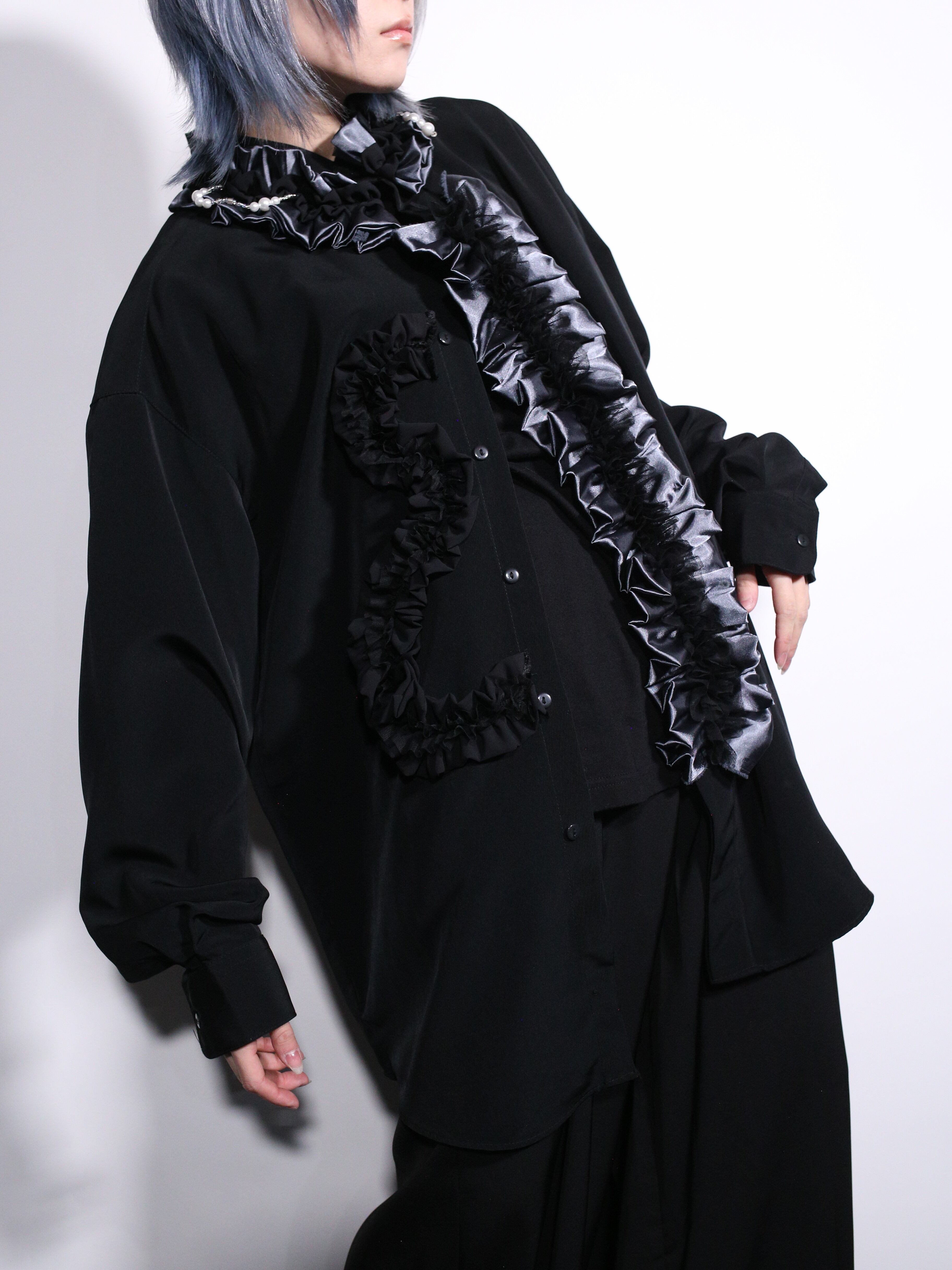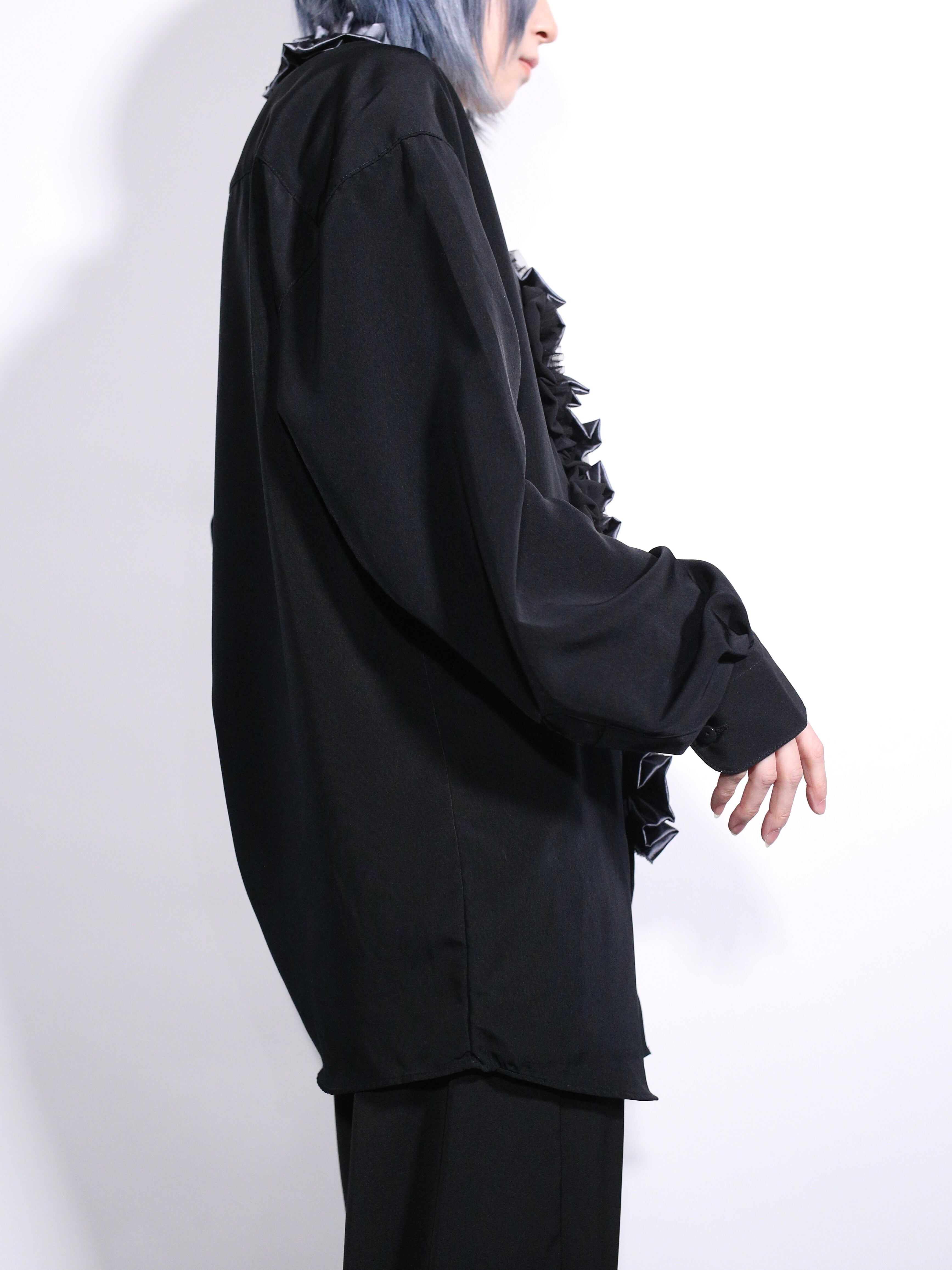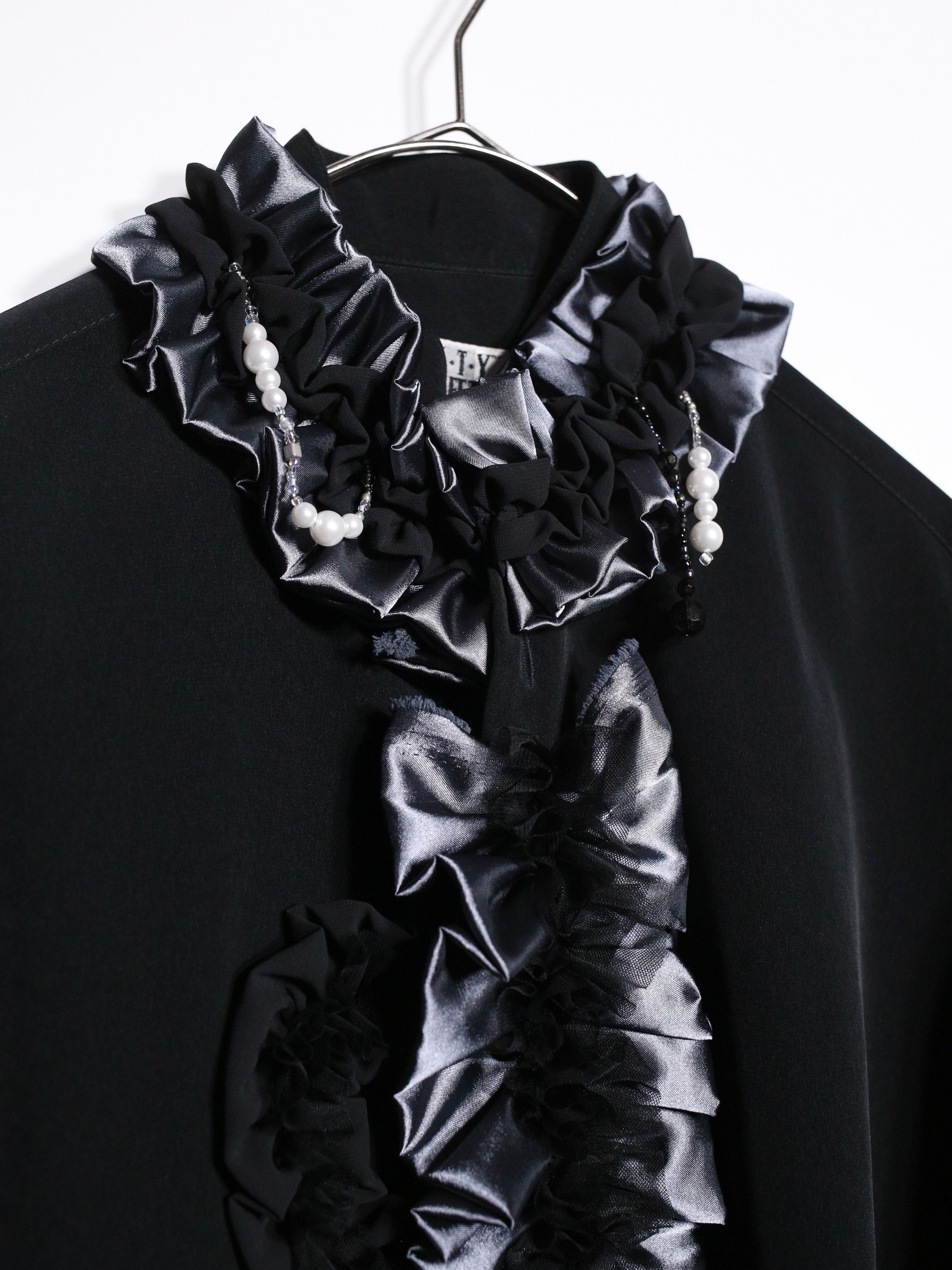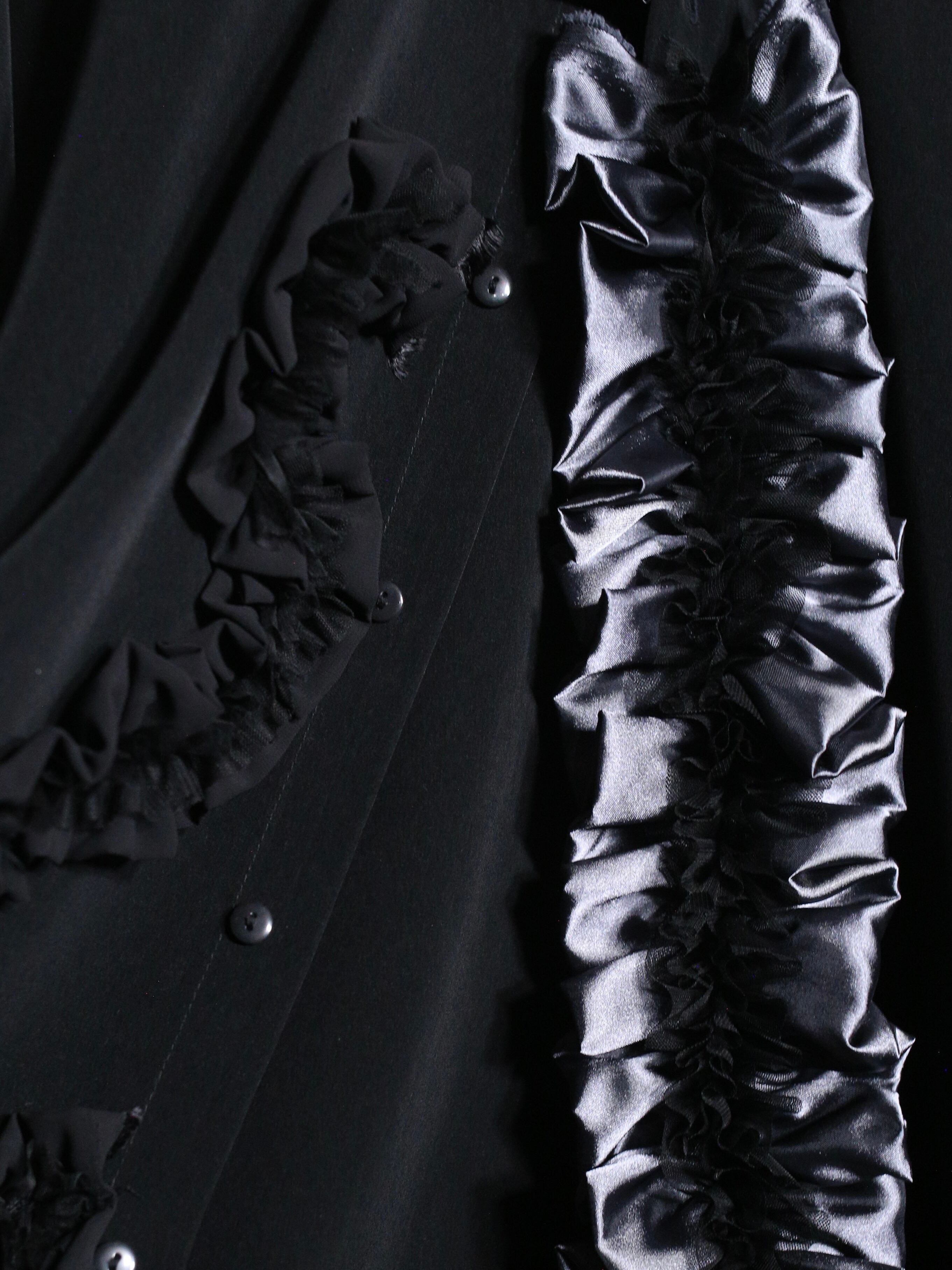 比翼部分からアシンメトリーに配されたブラックフリルが芸術性を加速させてくれる良いアクセントに。