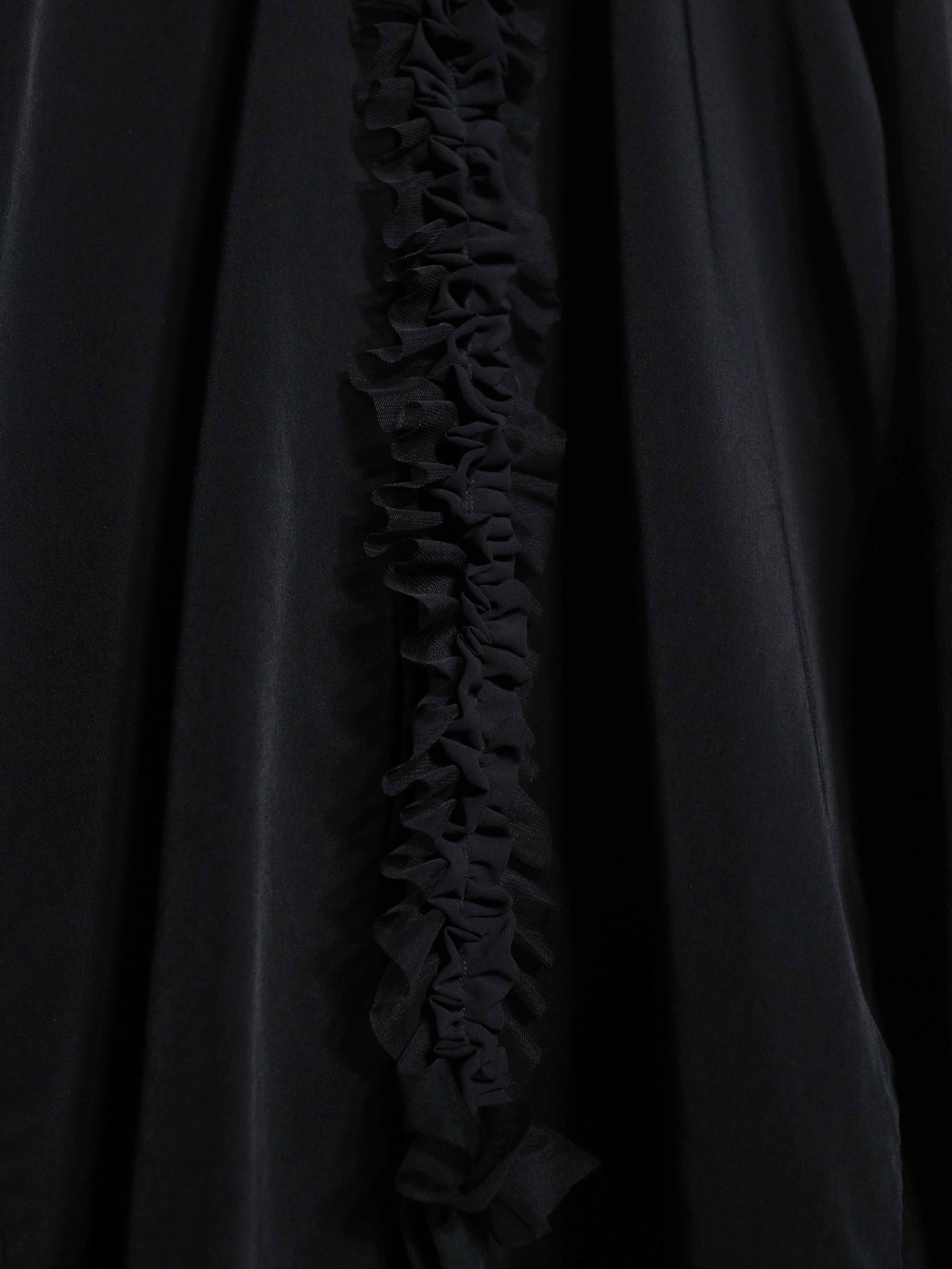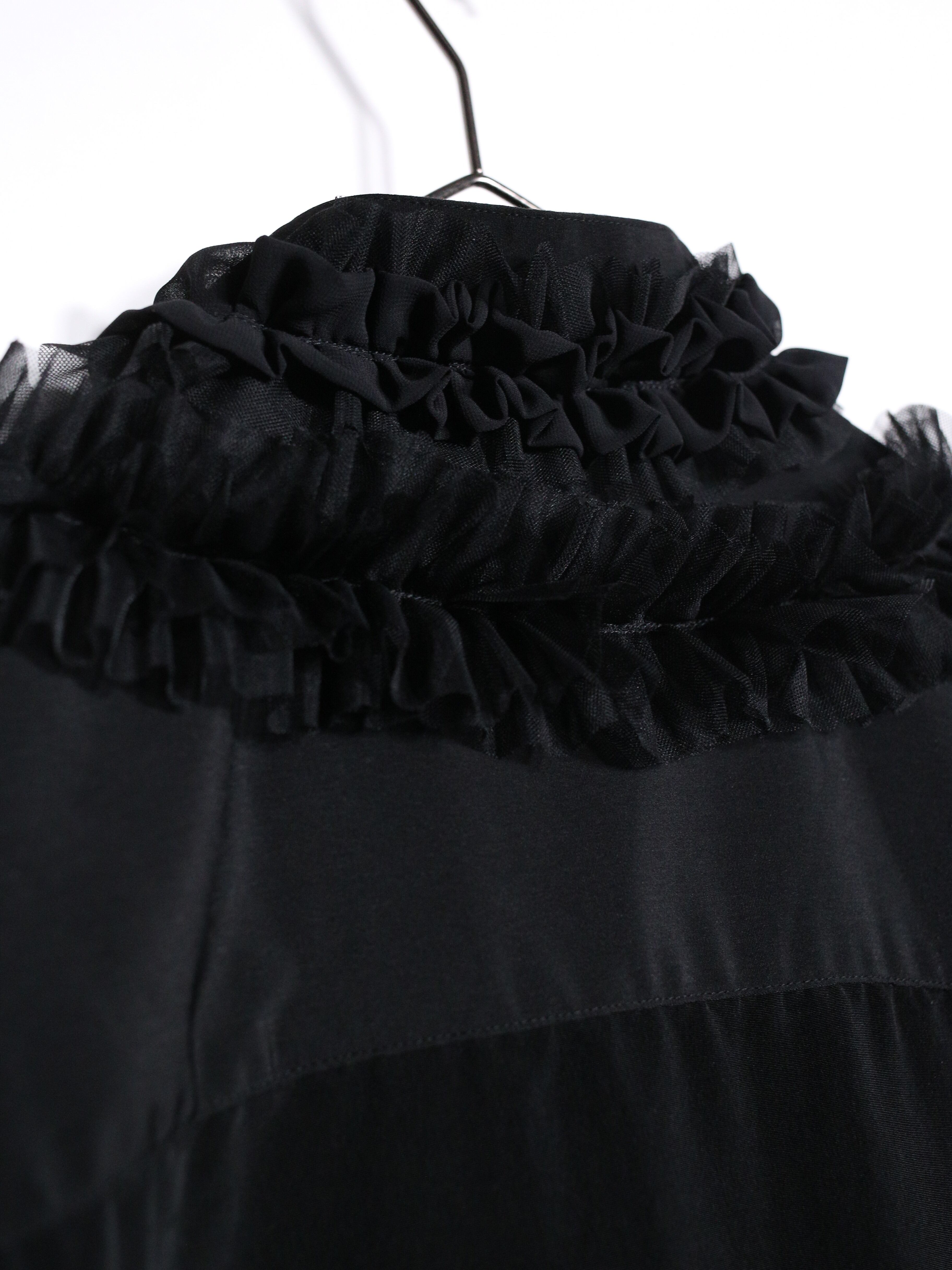 襟からフロントにかけてシアー素材の黒フリルを惜しみなく重ね、黒単色ながらも異なる素材の質感が奥行きのあるデザインに◎