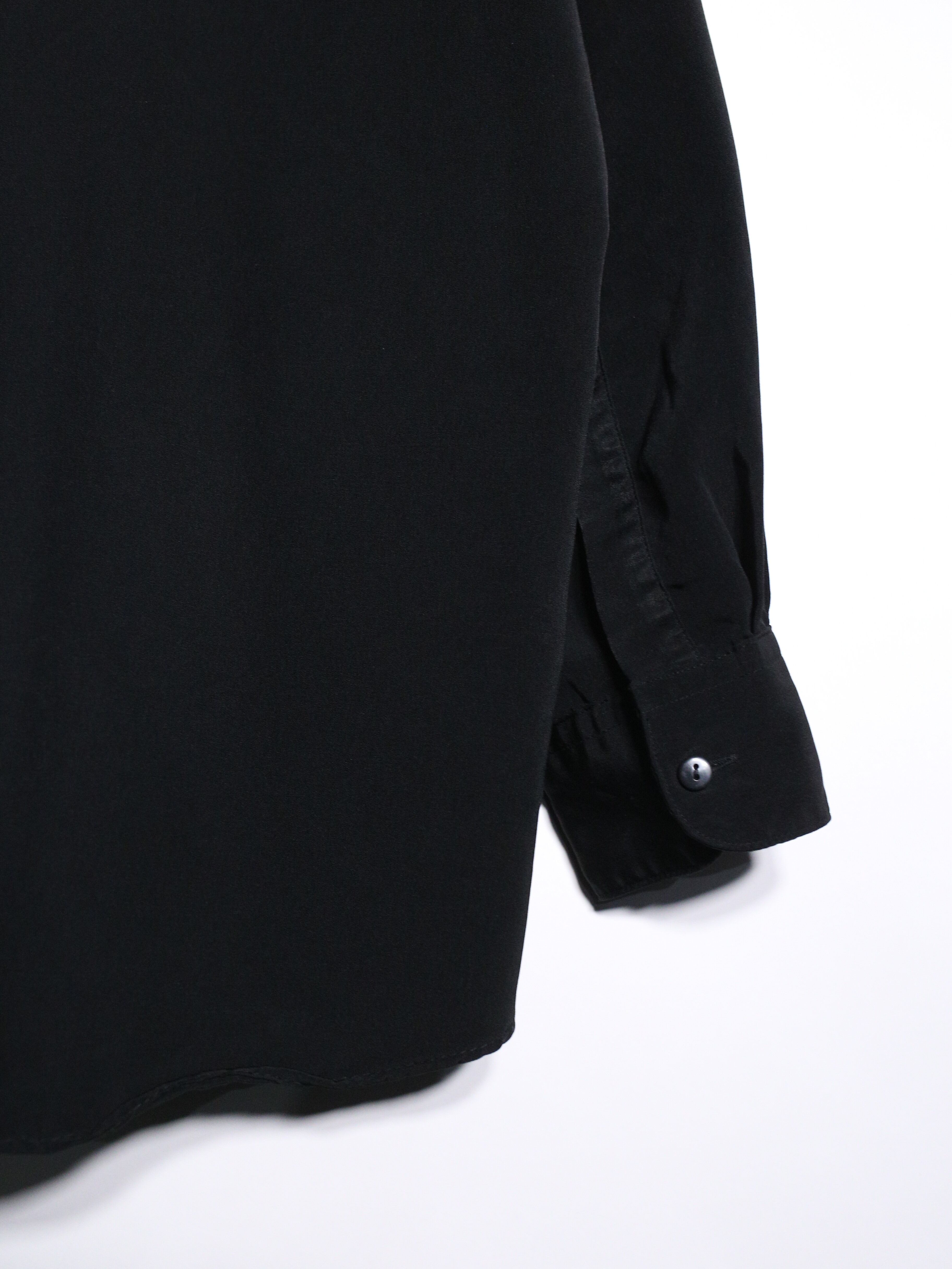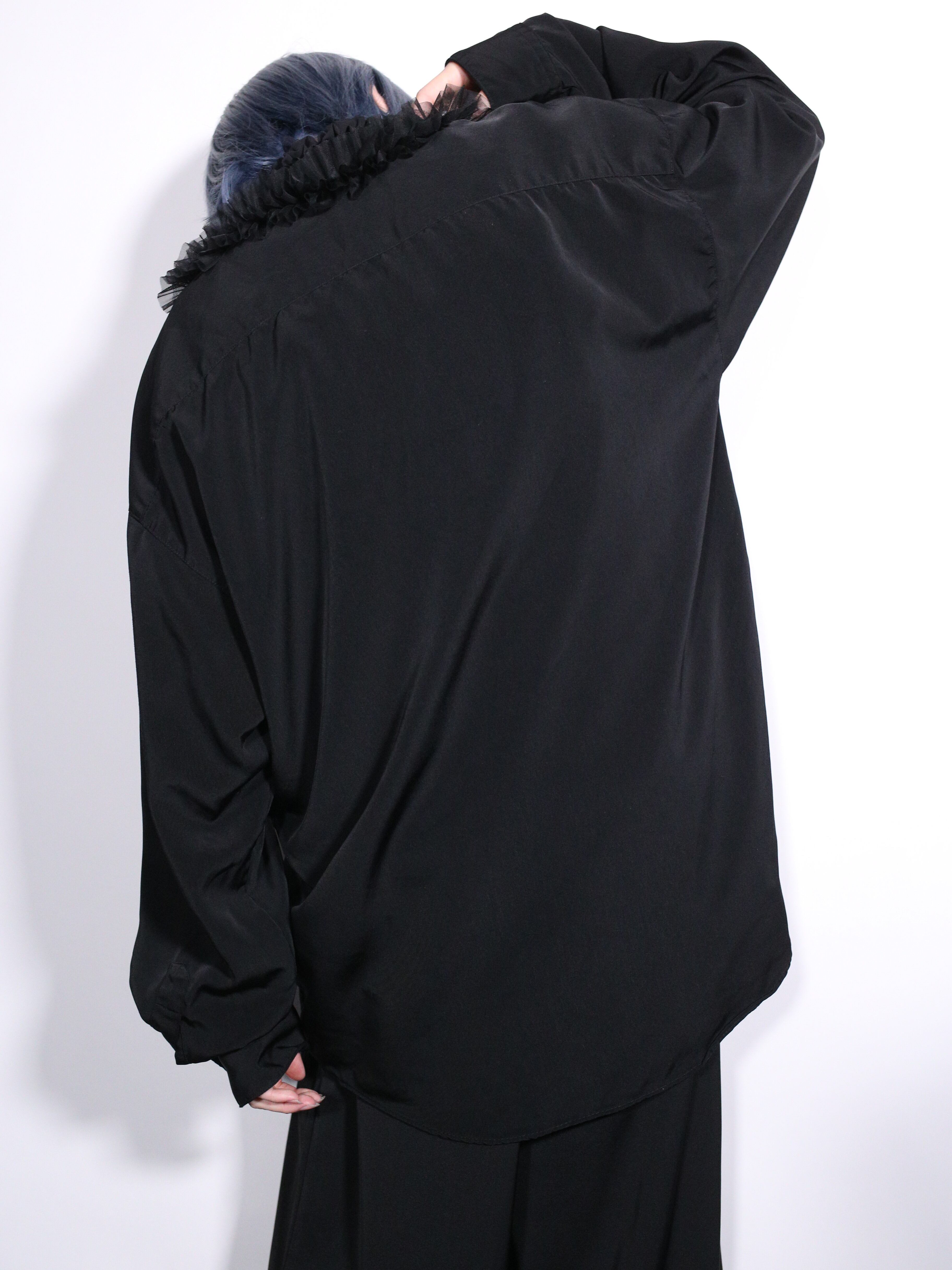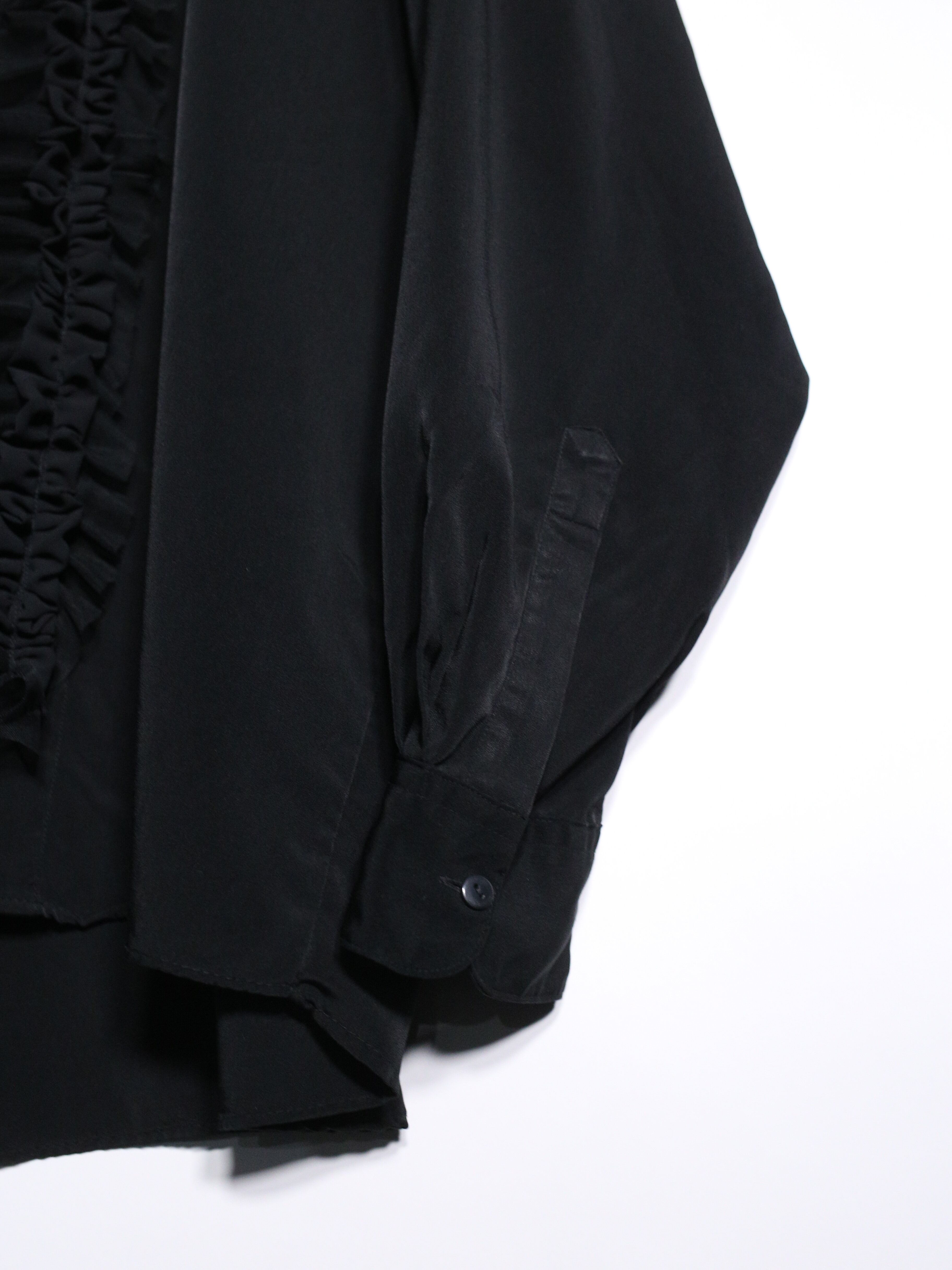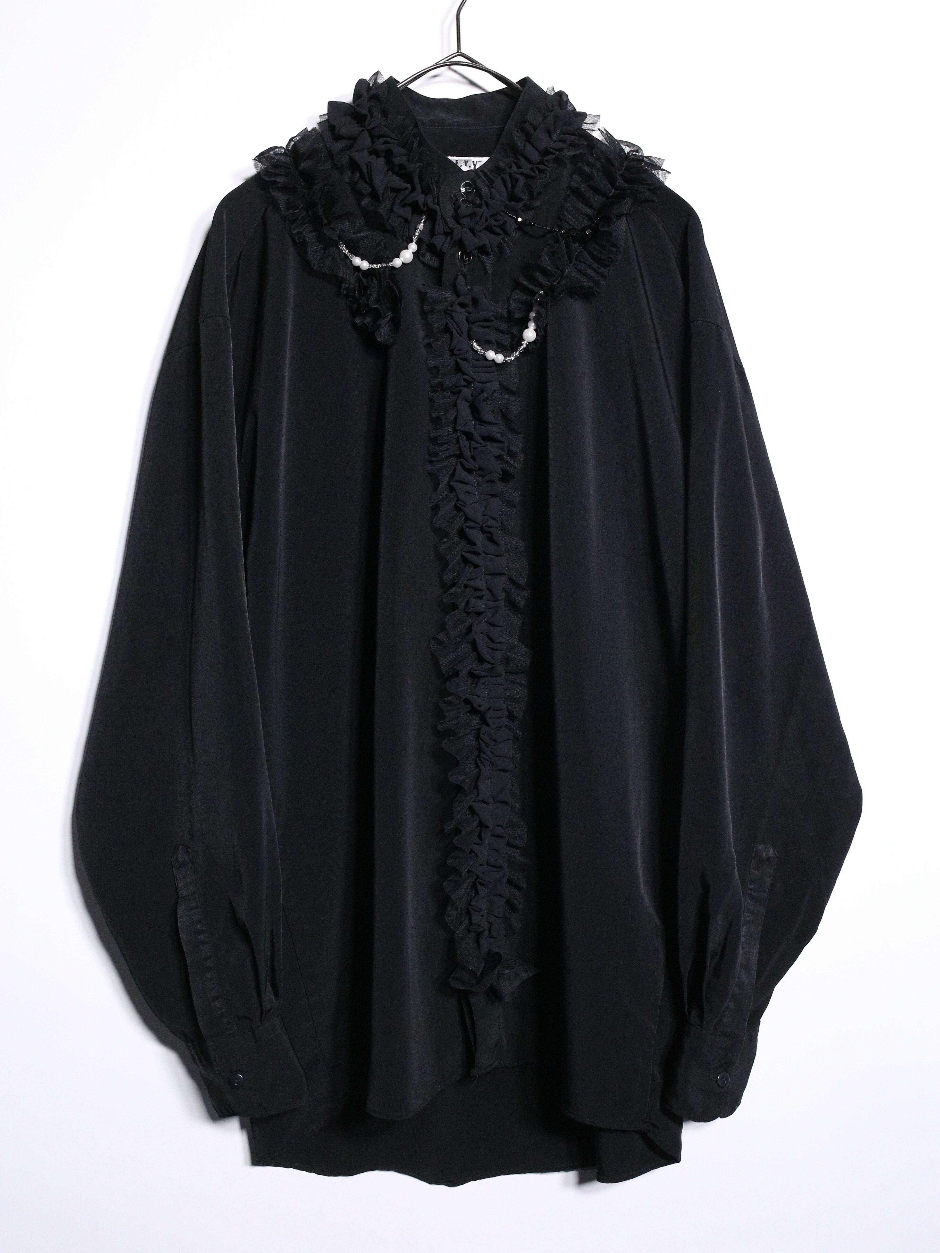 ブラックベースのミニマルシャツにフリルとビーズカスタムを施しエレガントに再構築したラグジュアリーシャツをご紹介。