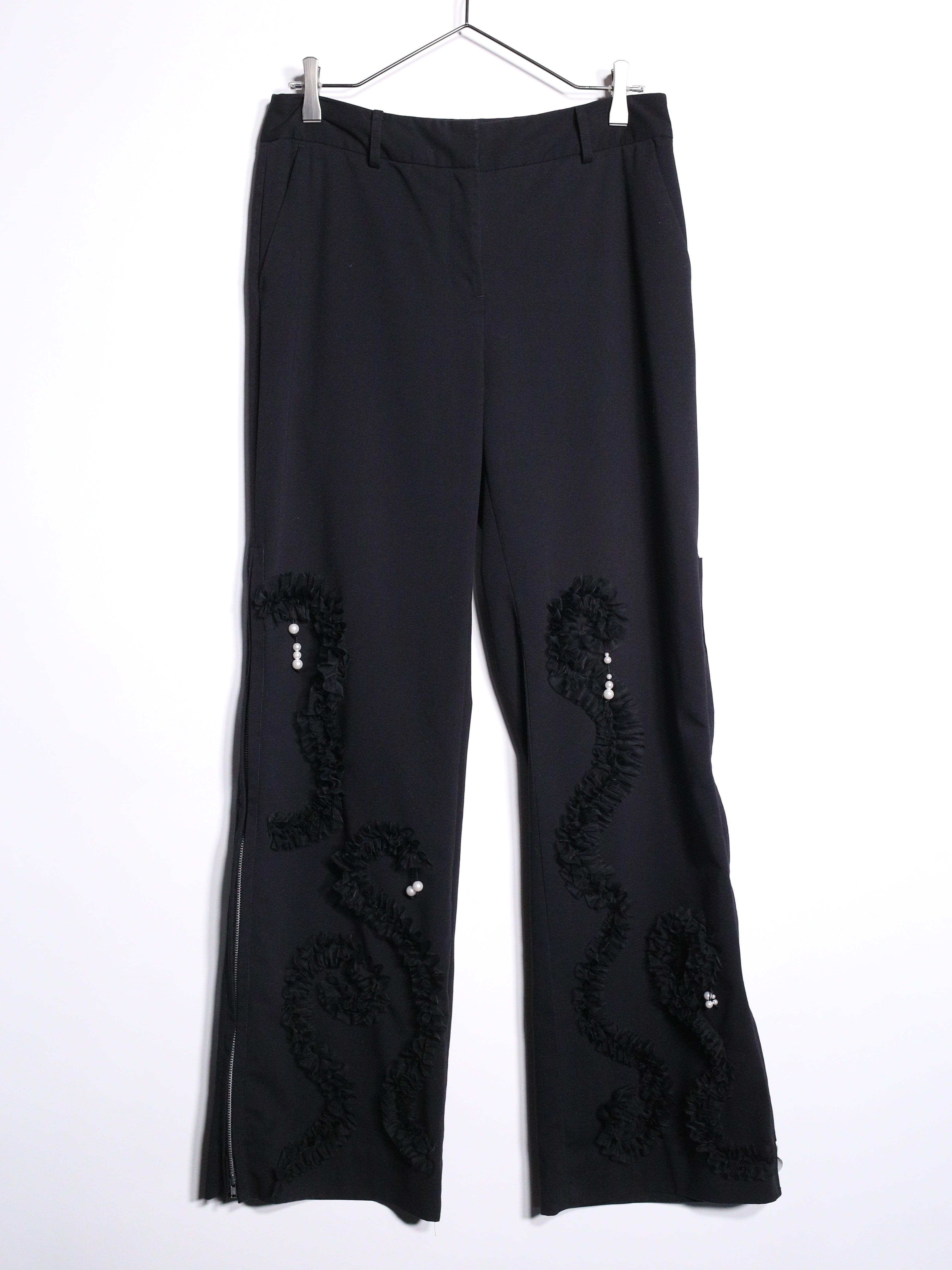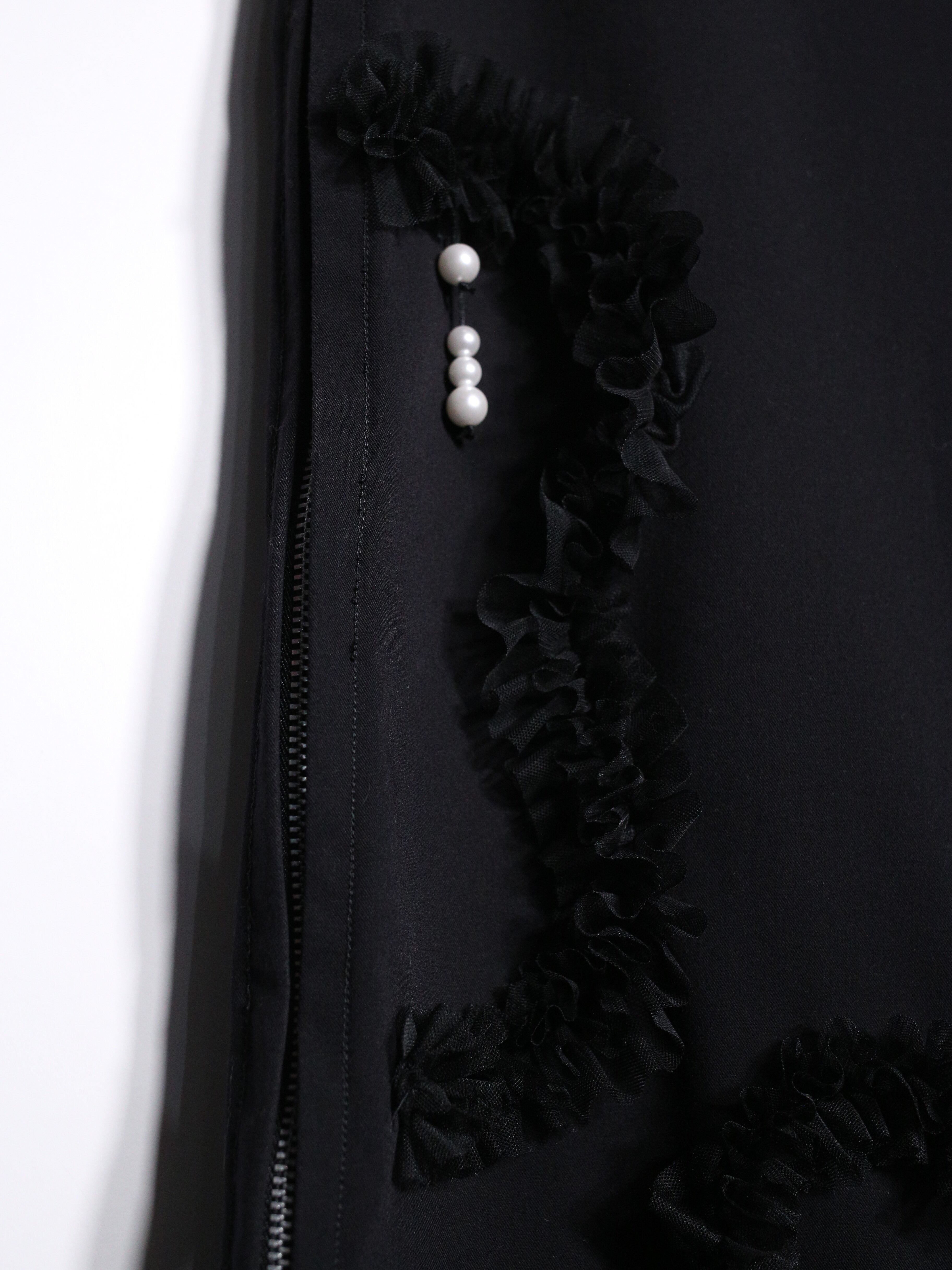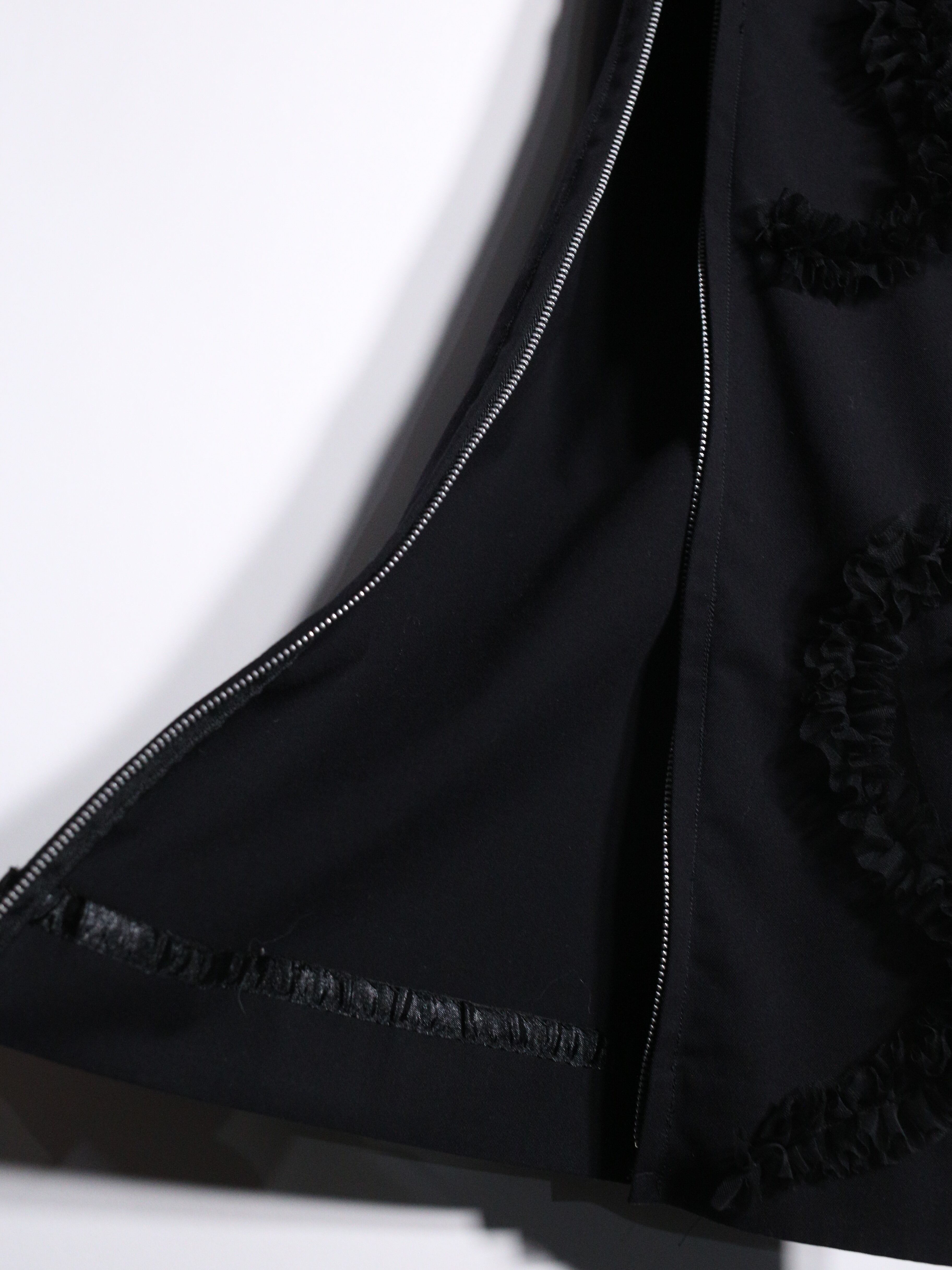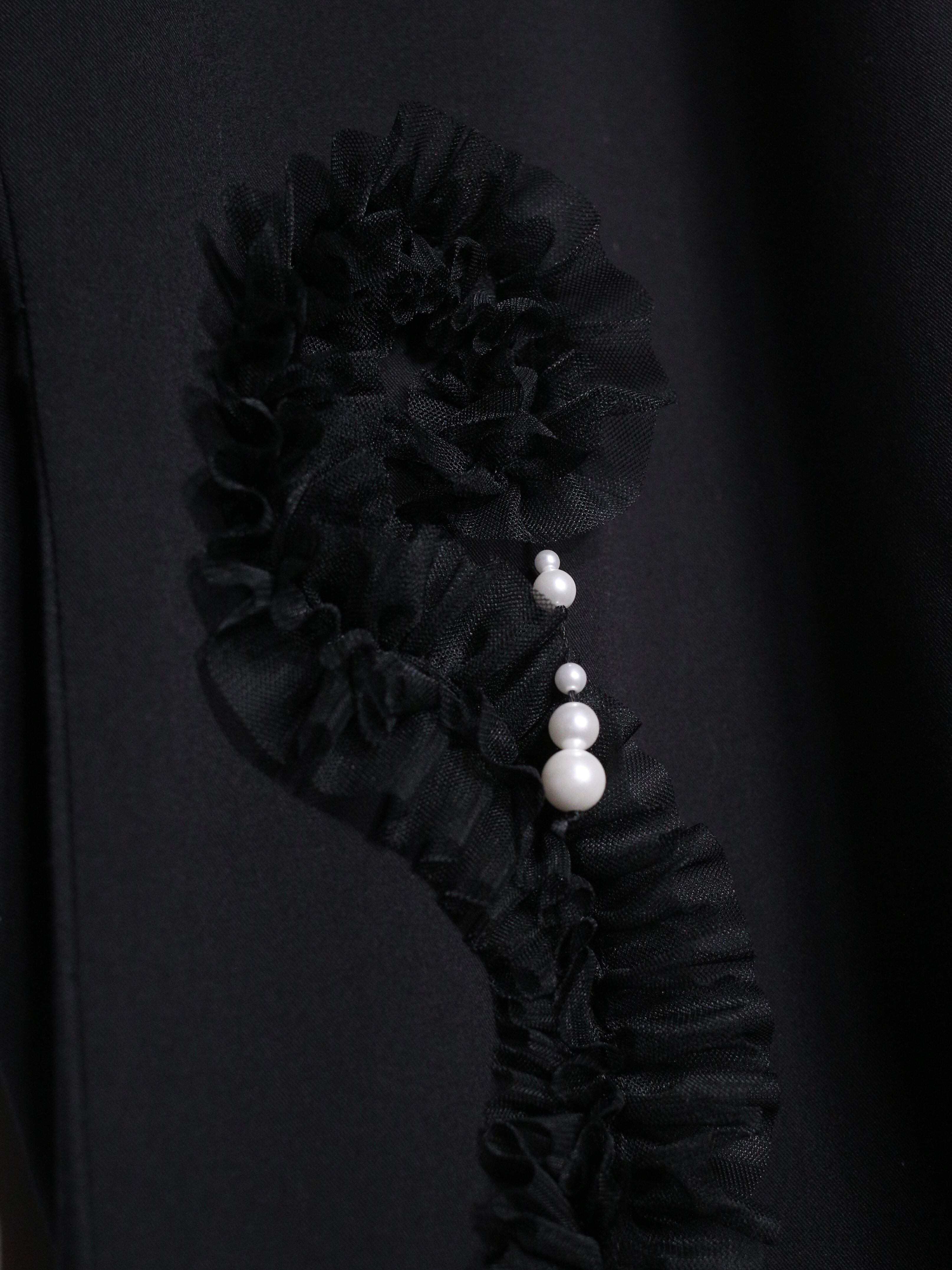 裾から伸びるウネウネとしたフリルの曲線と、そこに添えられたパールのコントラストが独創的な存在感を発揮。