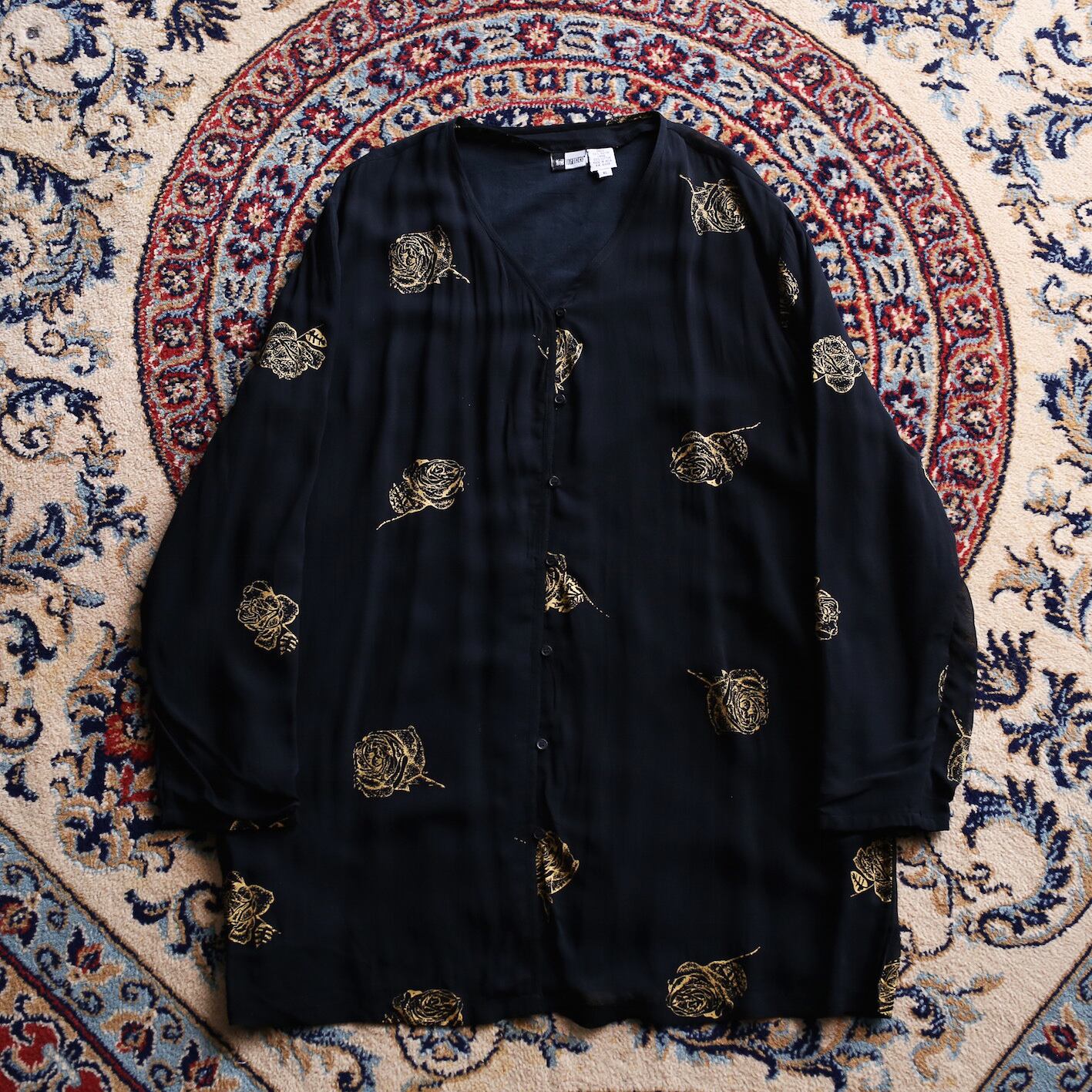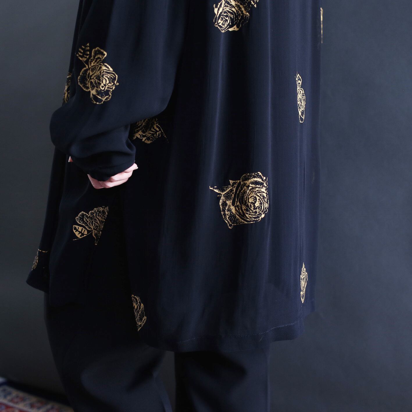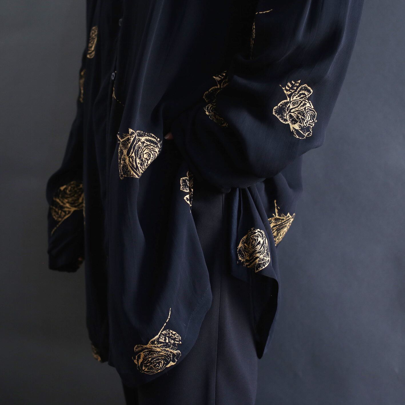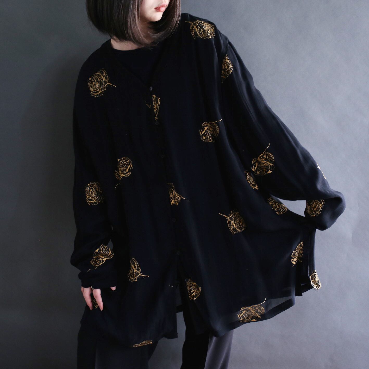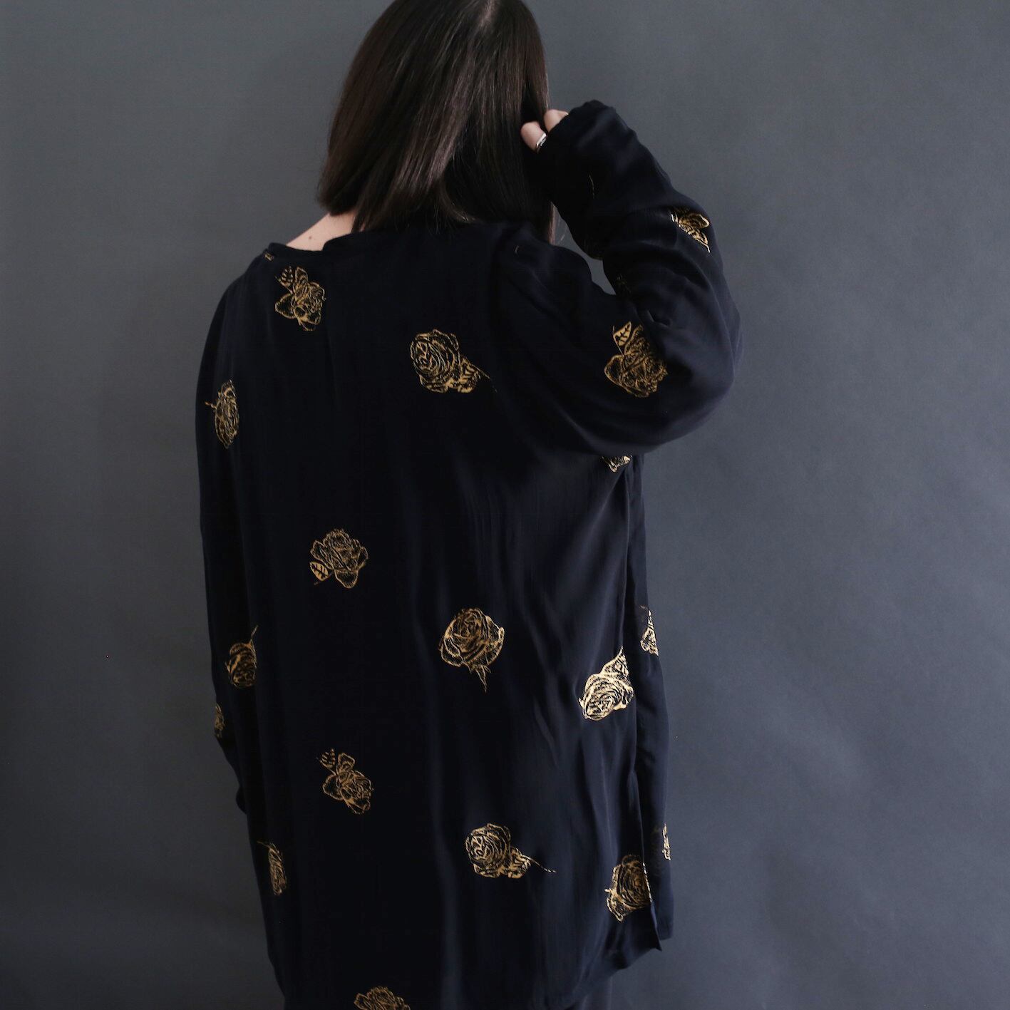 rose art pattern loop button l/s black mode no-collar shirt