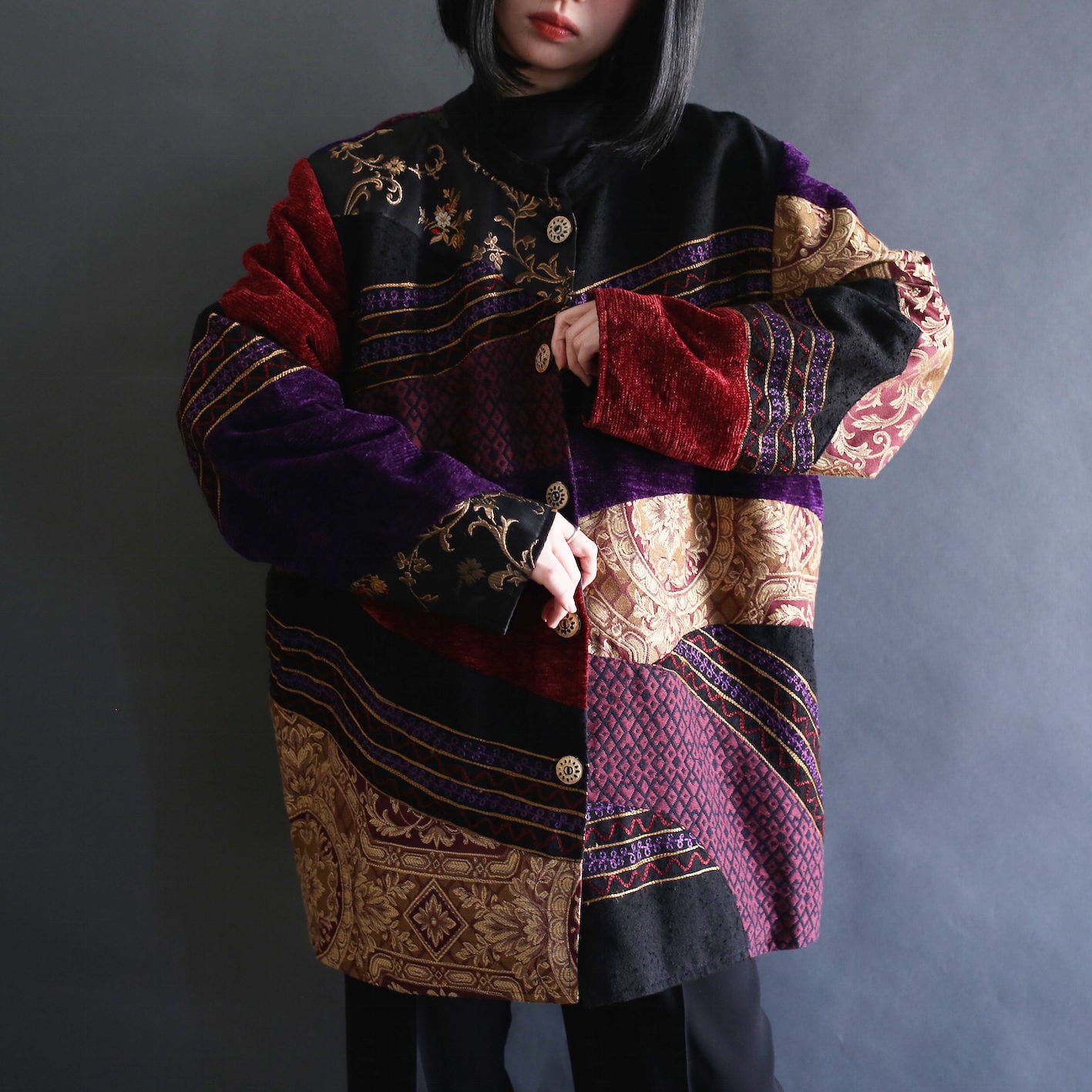 multi fabric switching pattern l/s band collar jacket