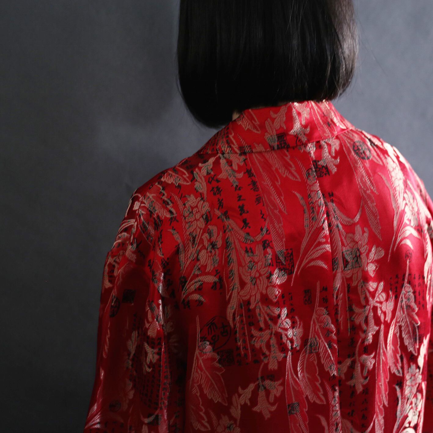 "漢字” and leaf pattern china motif l/s open collar shirt