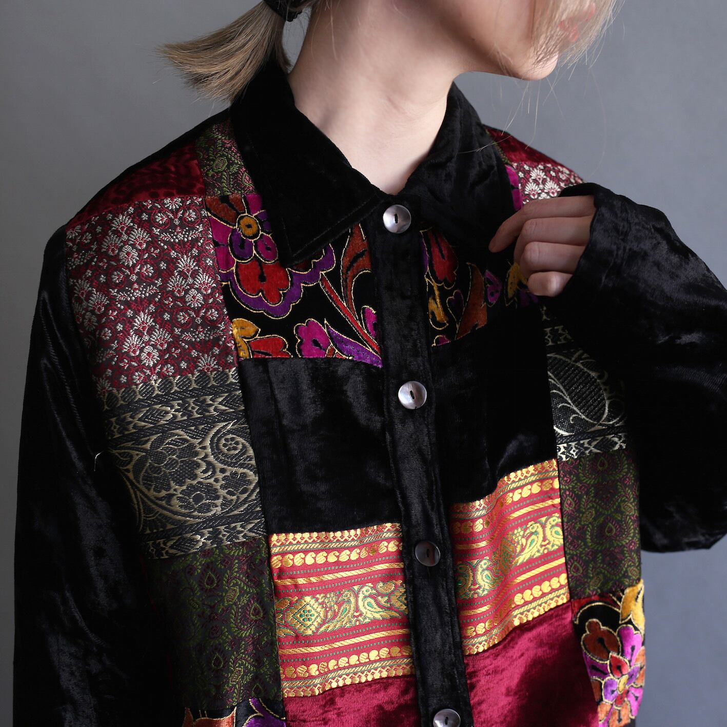 multi fabric pattern velours shirt jacket