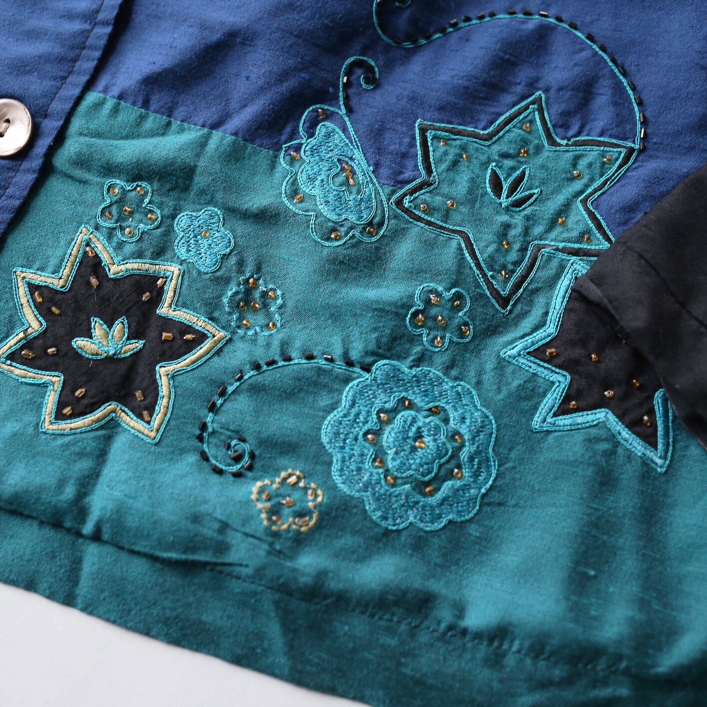 パネルの切り替えパターンに花の刺繍が施されたデザインシャツジャケット