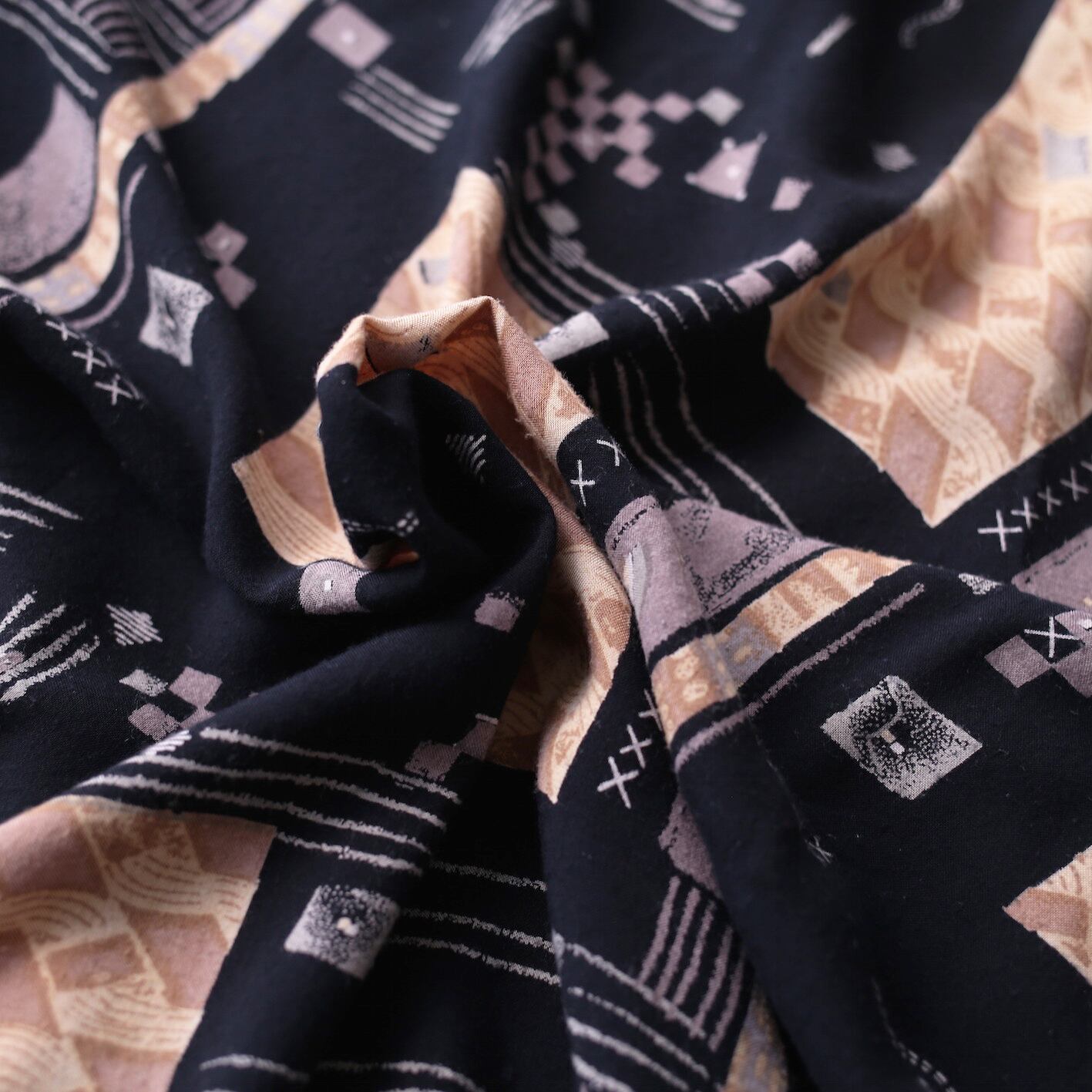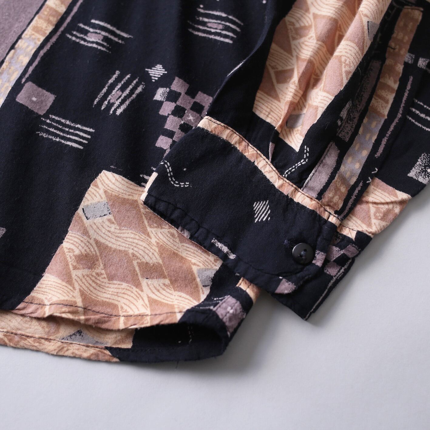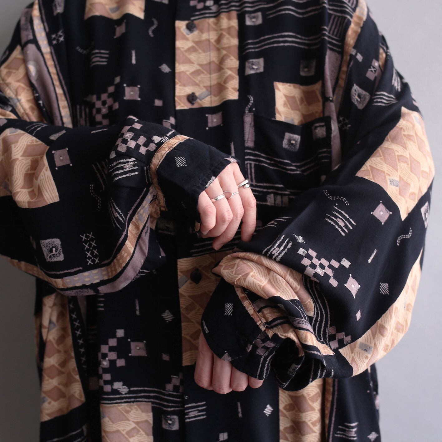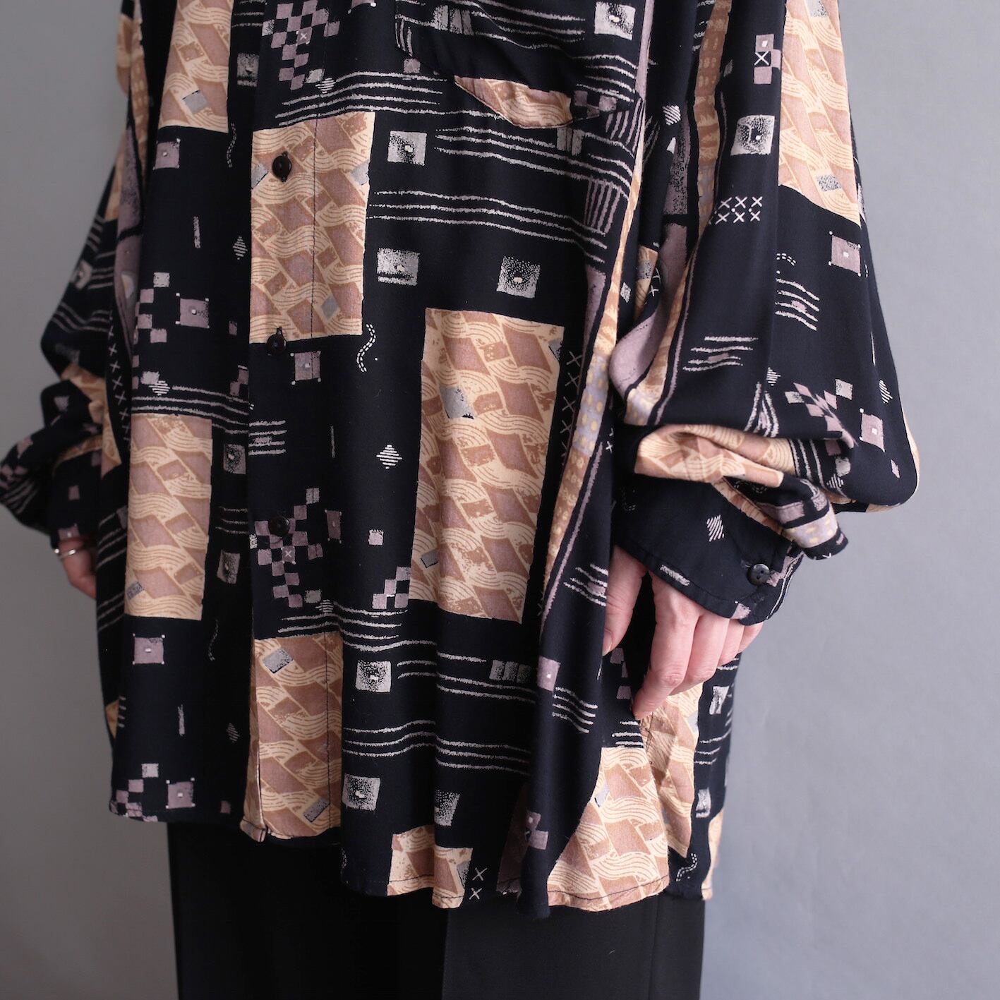 四角をモチーフとした幾何学的なグラフィックが全体に施されたオーバーサイズアート柄シャツ