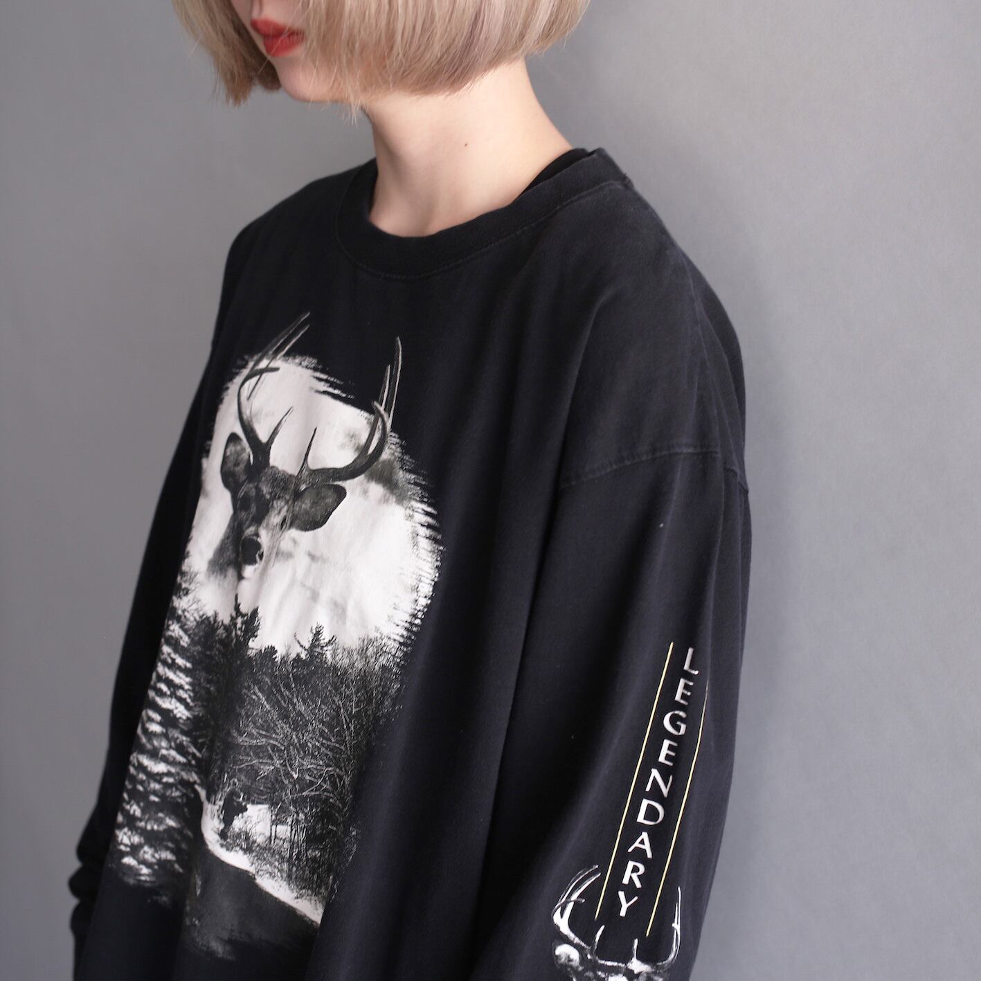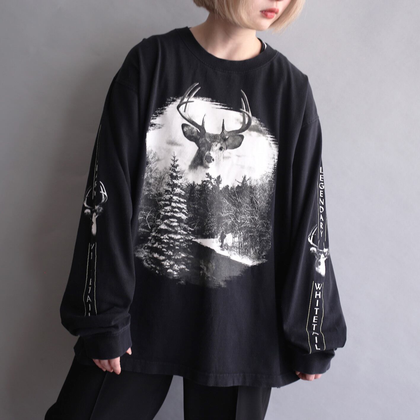 ダークな雰囲気を醸し出す"鹿"のプリントがフロントと袖に施されたアニマルプリントロンTEE