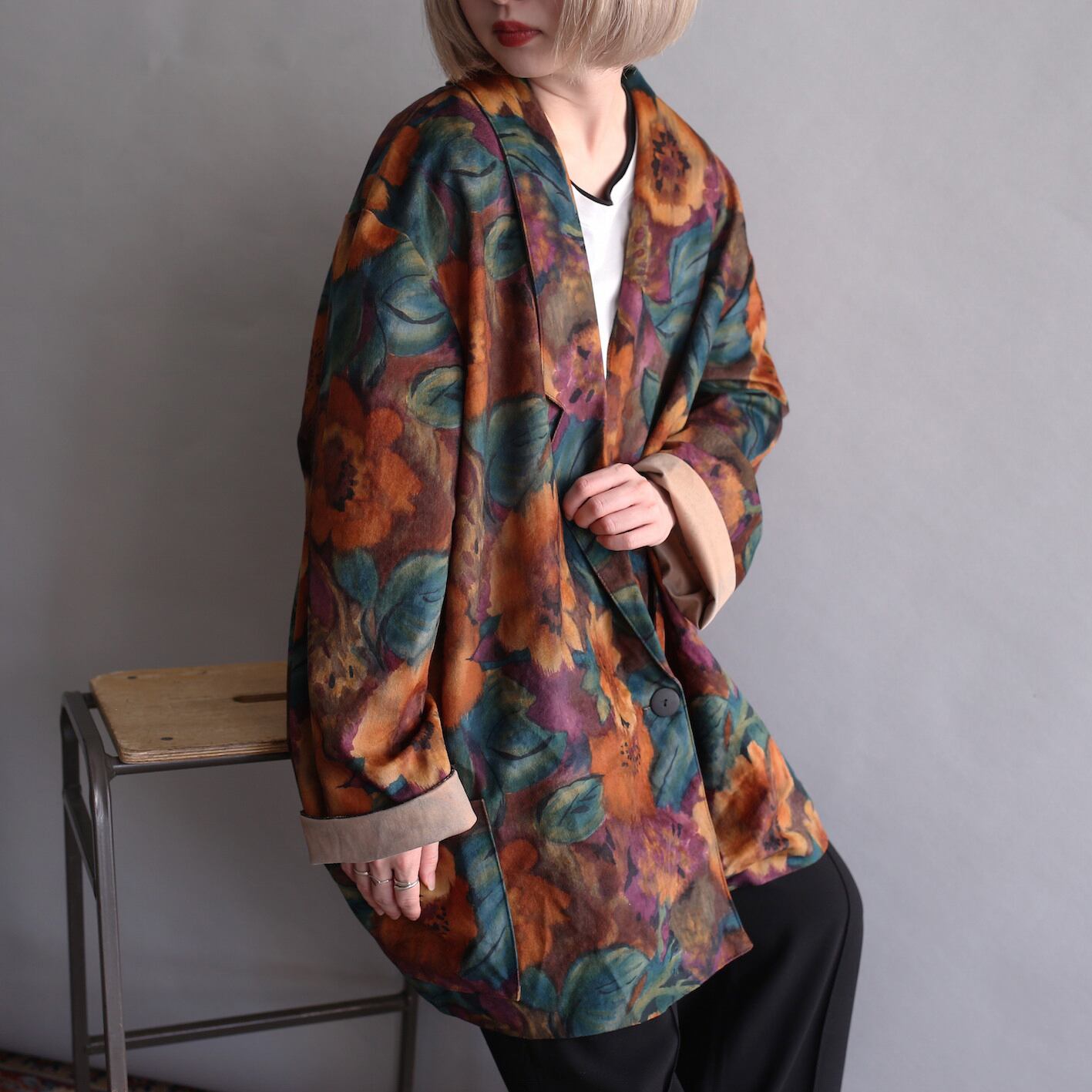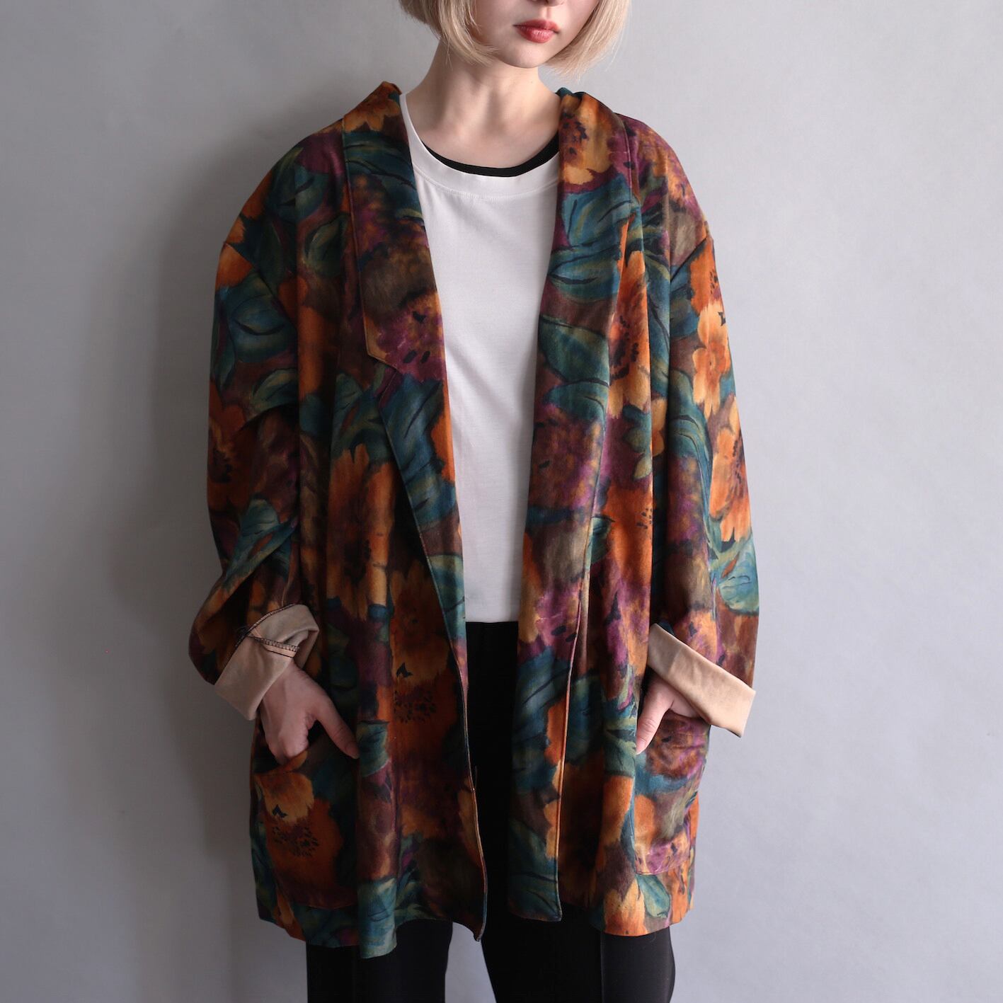 どこかダーク感の漂うアーティスティックな花 花柄が全体を覆うイージーテーラードジャケット