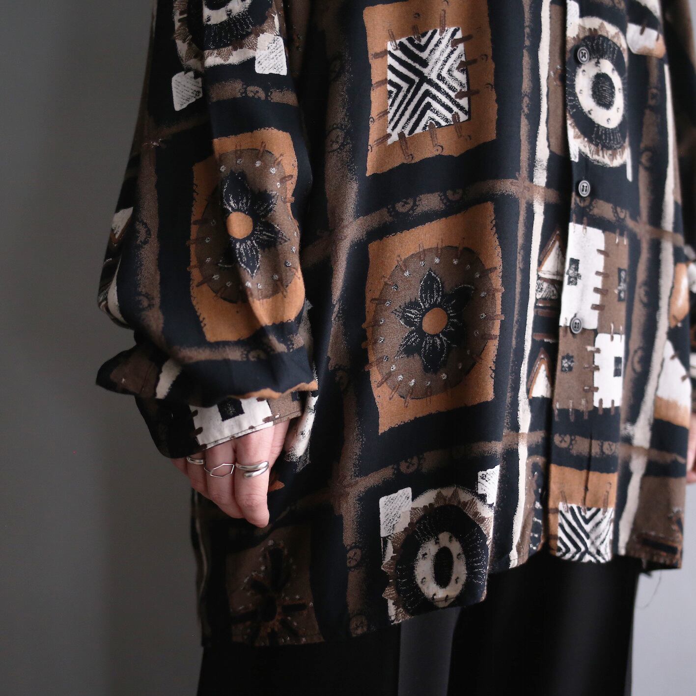 "ダーク×モダン"幾何学模様と花柄が施されたデザイン柄シャツ