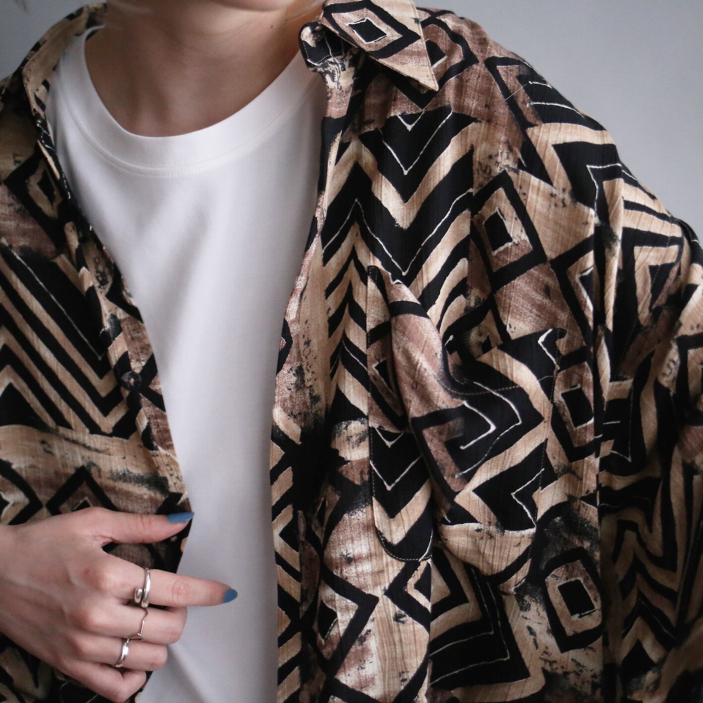 シック且つモダンな幾何学柄がダークな世界観を生み出すオーバーサイズシャツ