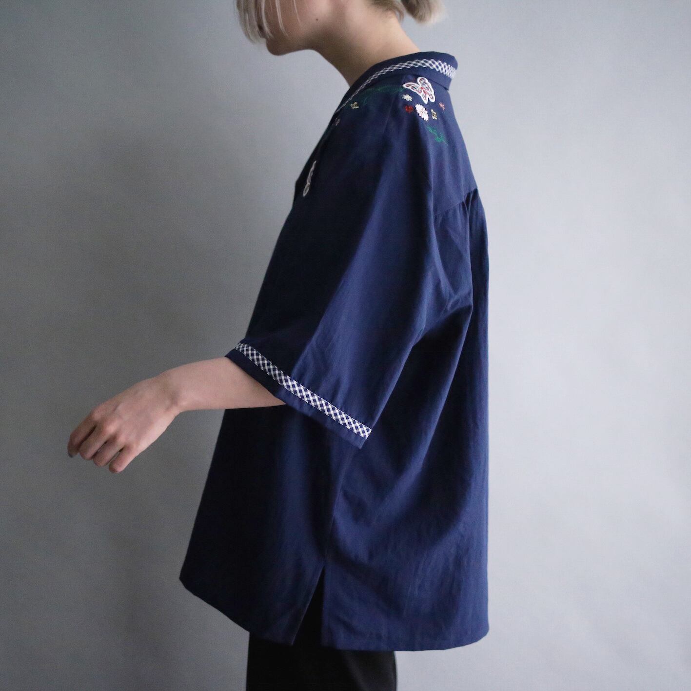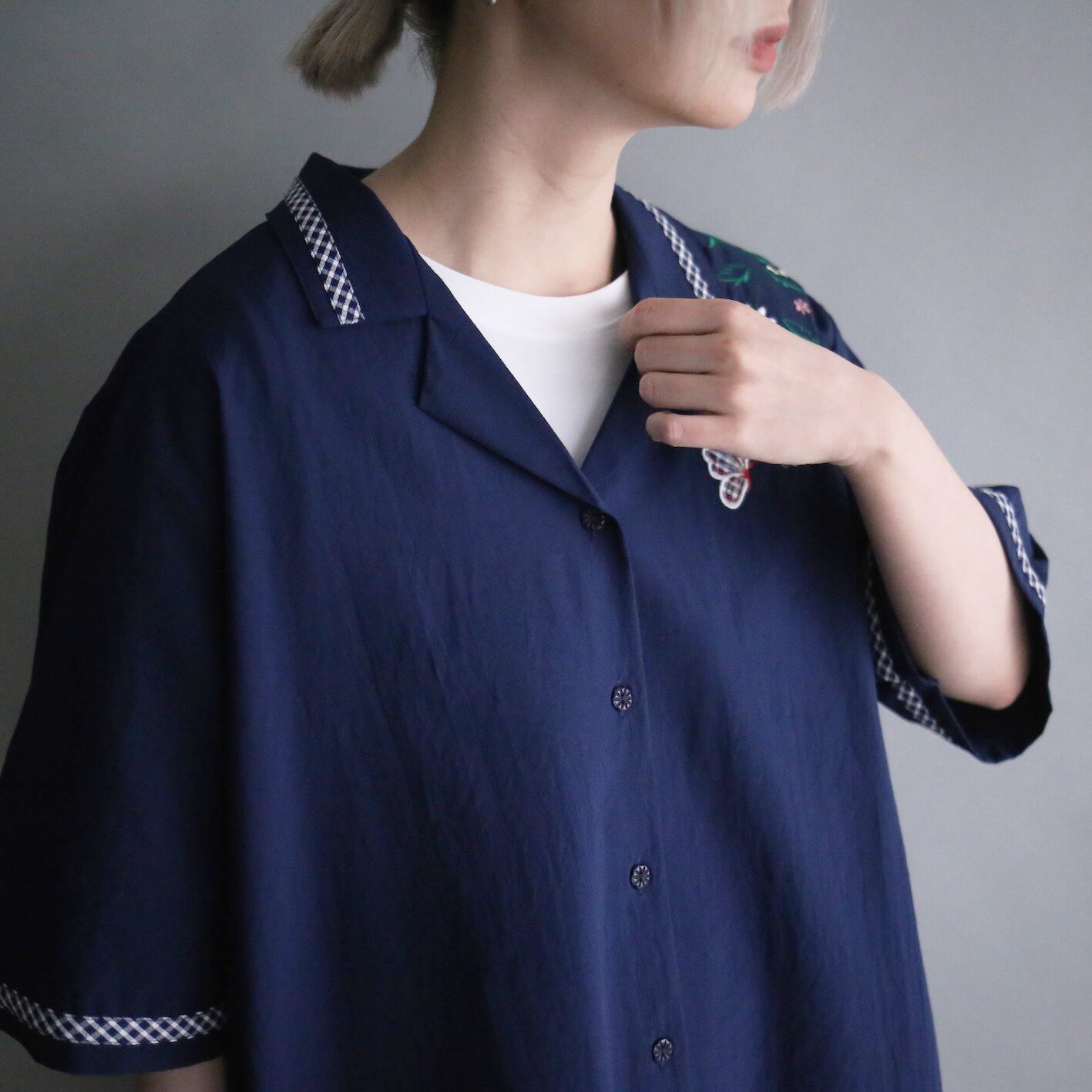チェックのラインと花や蝶々の刺繍が施されたデザインシャツ