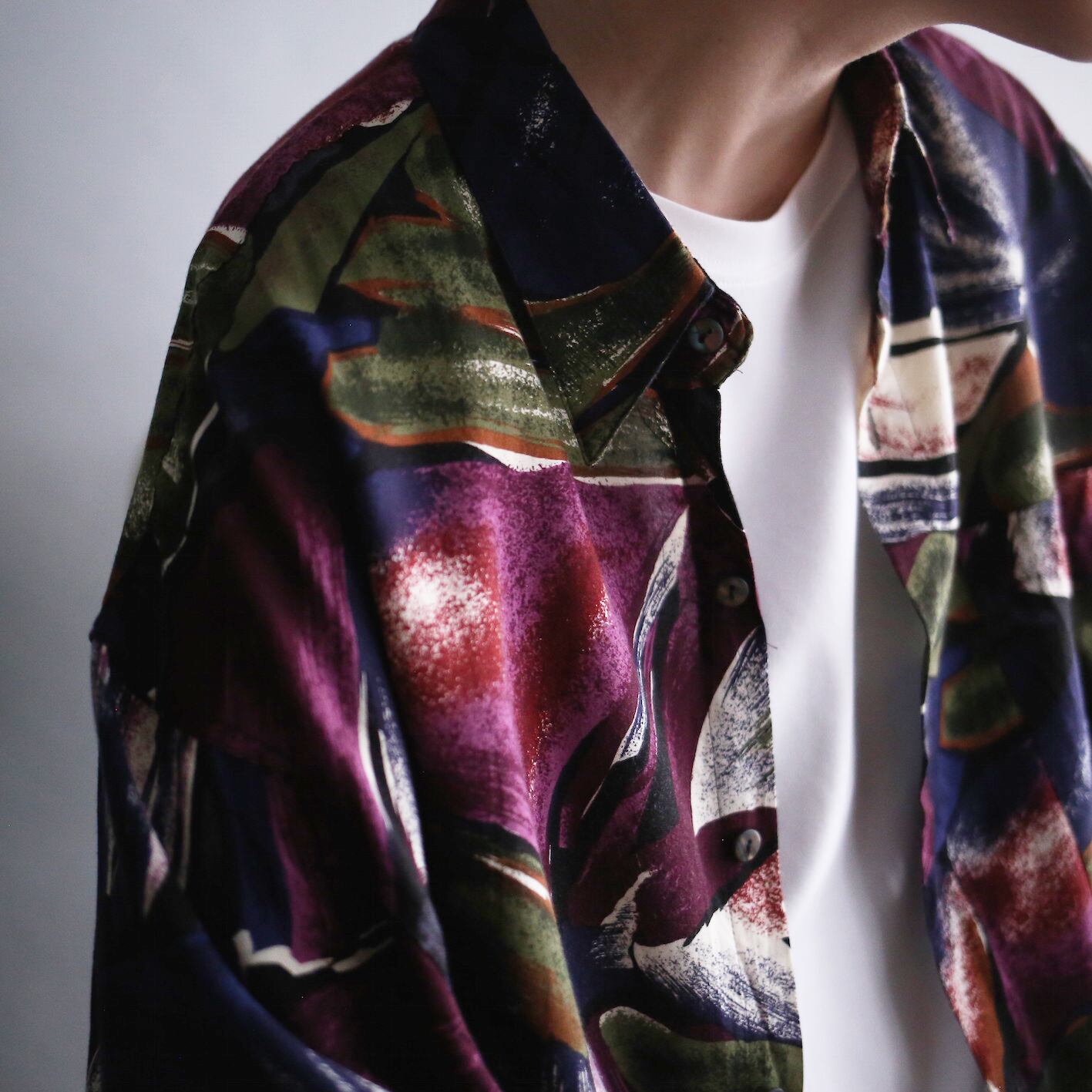 毒々しい色使いの抽象柄が独特の世界観を生み出すオーバーサイズ柄シャツ