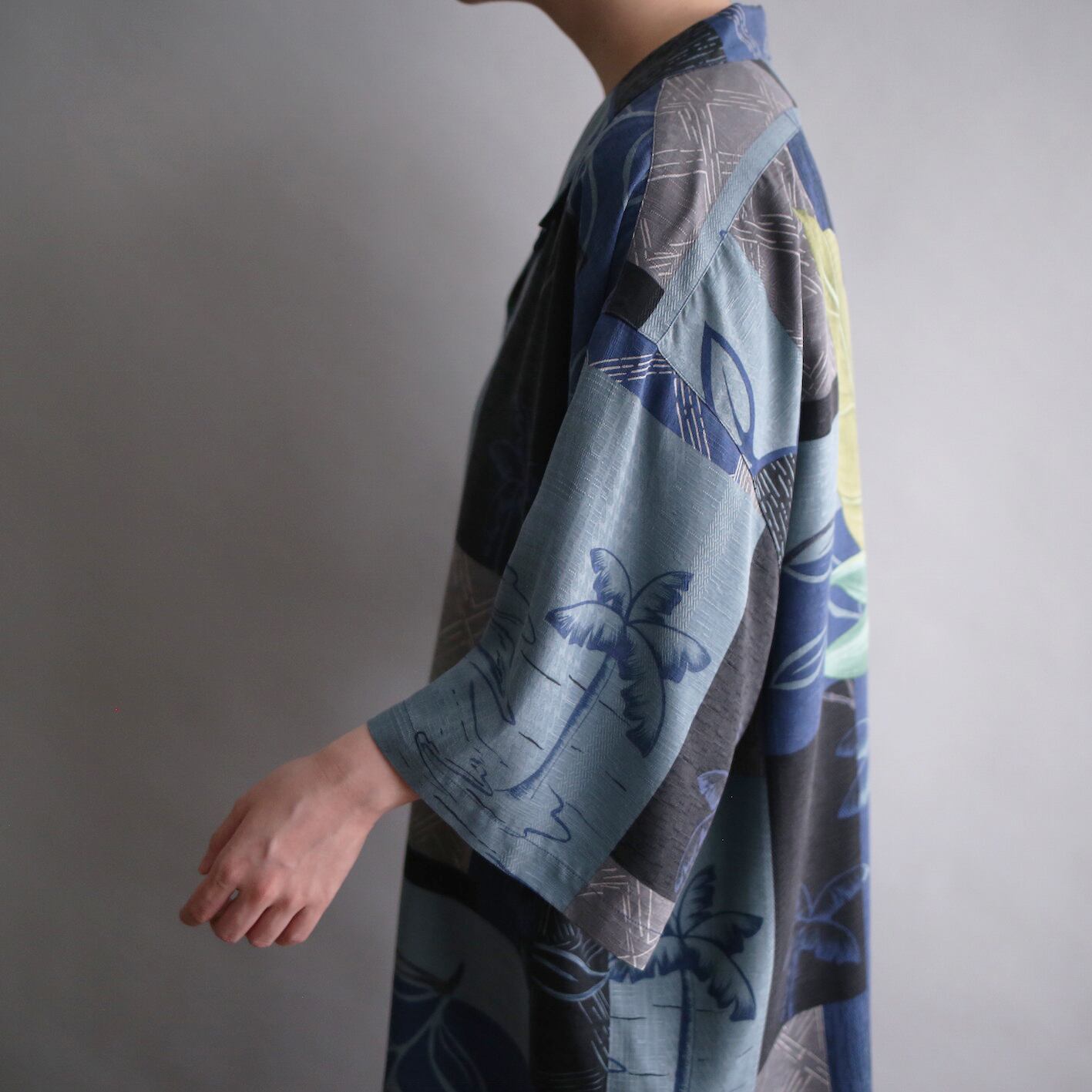寒色を基調とした美しい色合いに大きくバックプリントが施されたアートボタニカルシャツ