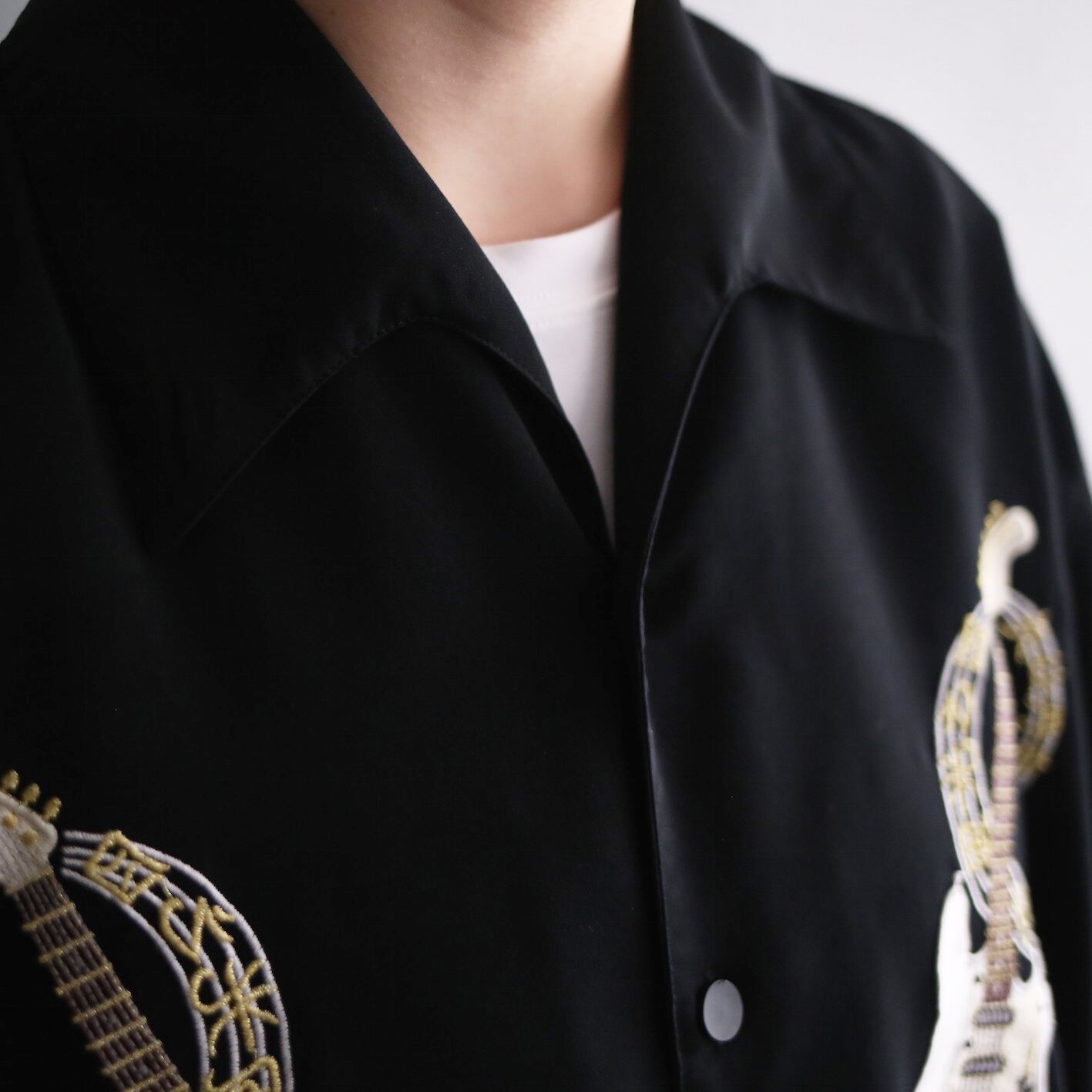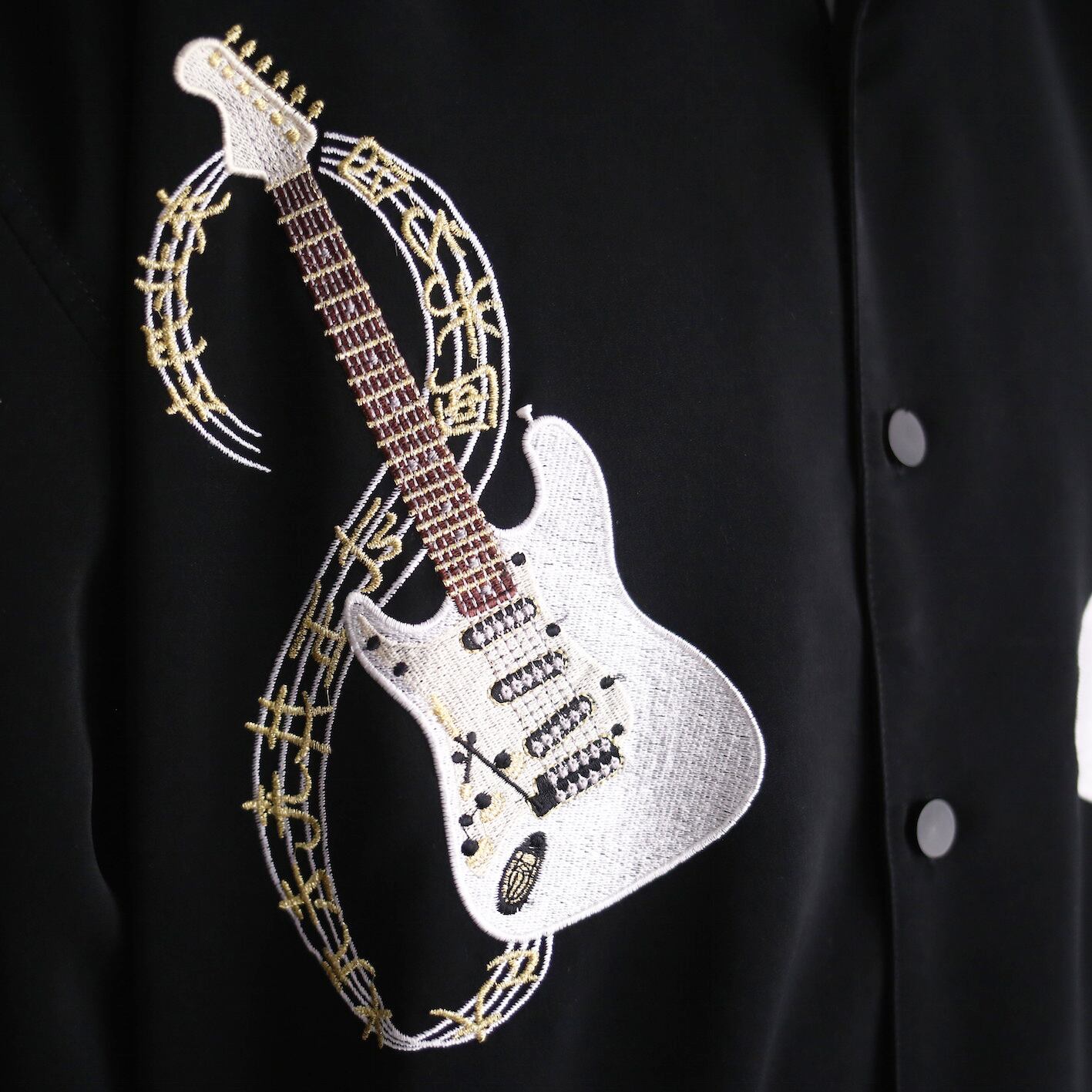 漆黒のシンプルなボディに2本のギターを刺繍で施した最高にcoolなデザインシャツ