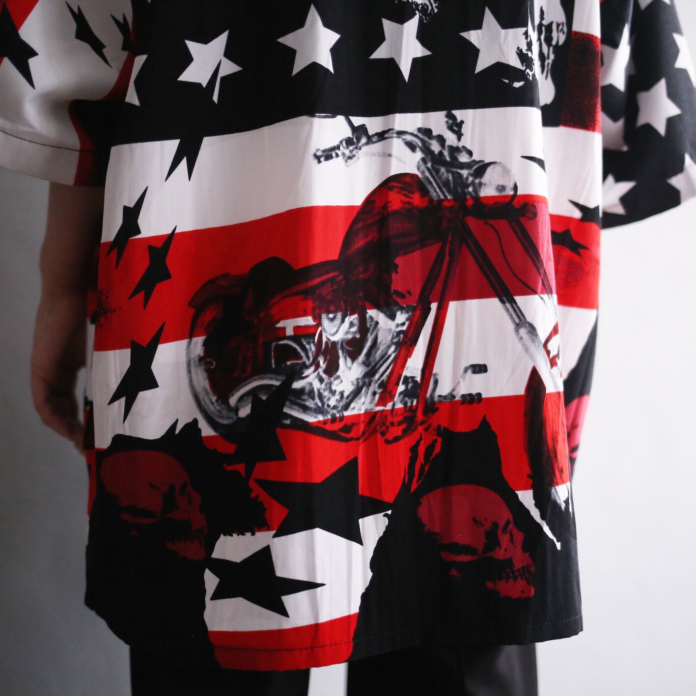 星条旗の上にバイクや骸骨のグラフィックをガツンと乗せたオーバーサイズシャツ
