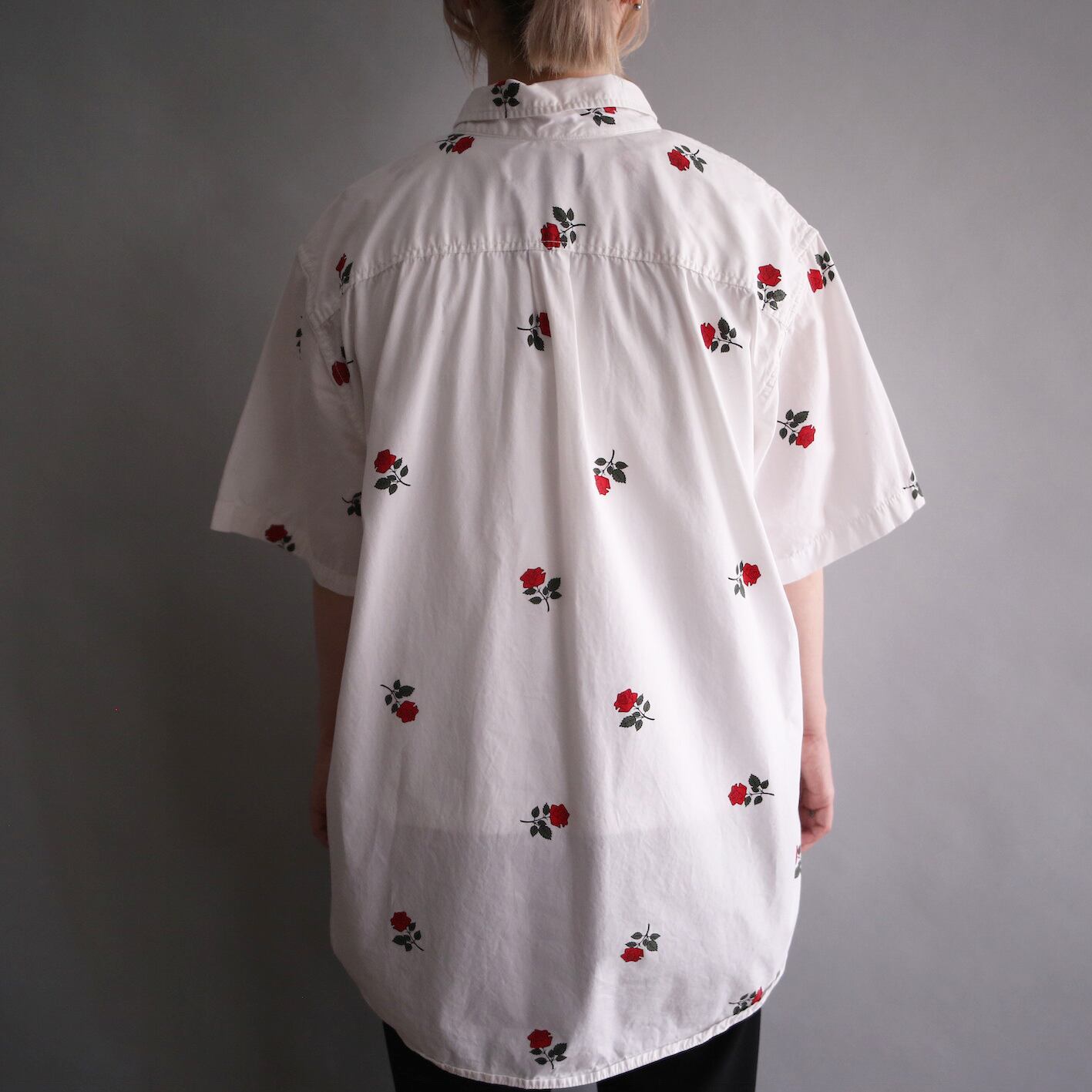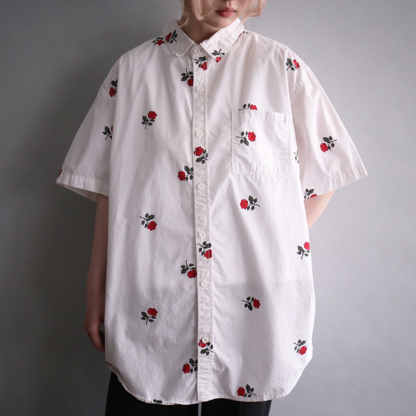 白地に赤く美しい薔薇を満遍なくに施したデザインシャツ