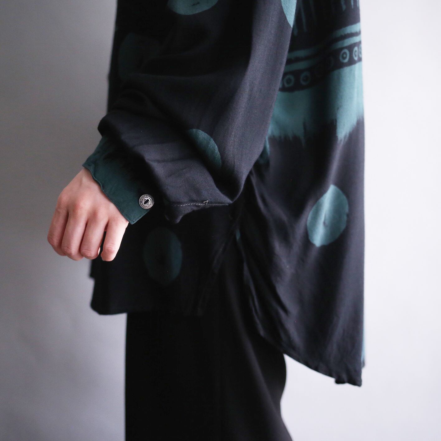 身頃の上半分には壁画のような幾何学的な模様が、下半分と両袖には大判な丸模様◎