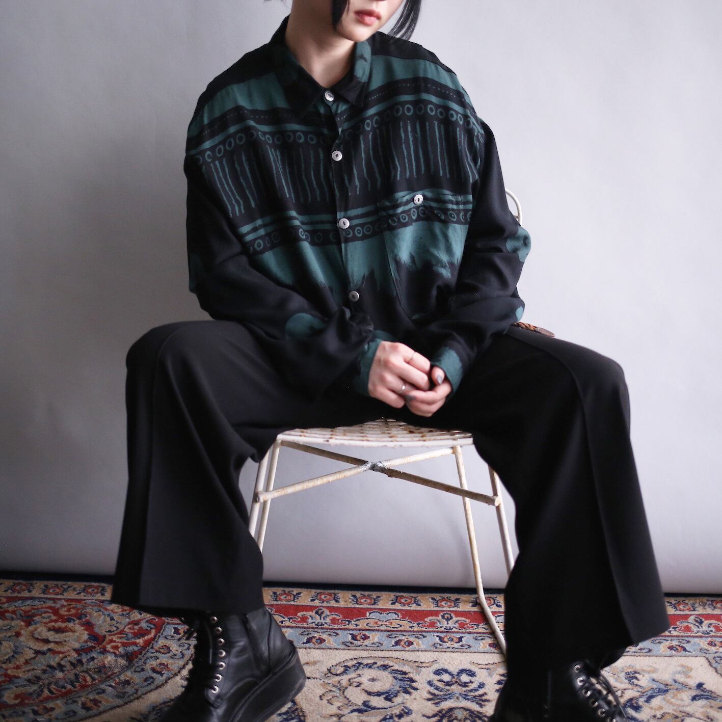 落ち着いたトーンの幾何学柄が施されたバイカラーアートデザインシャツ