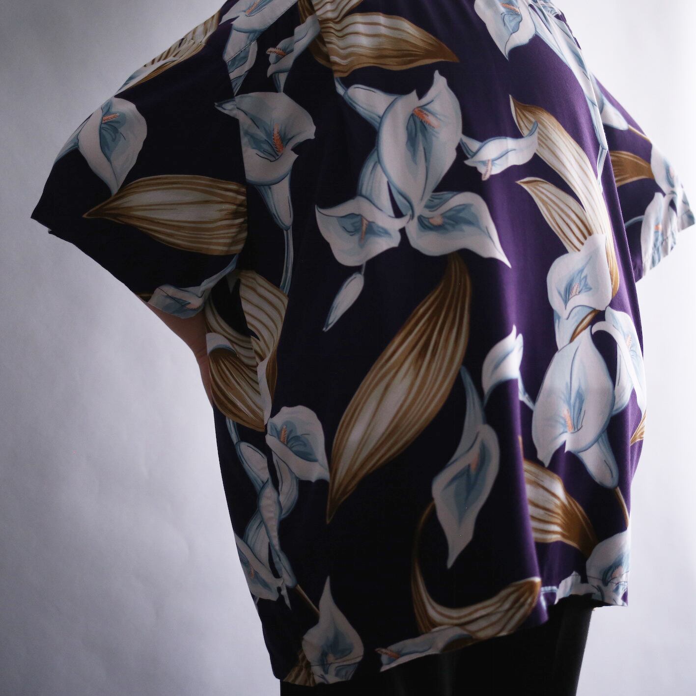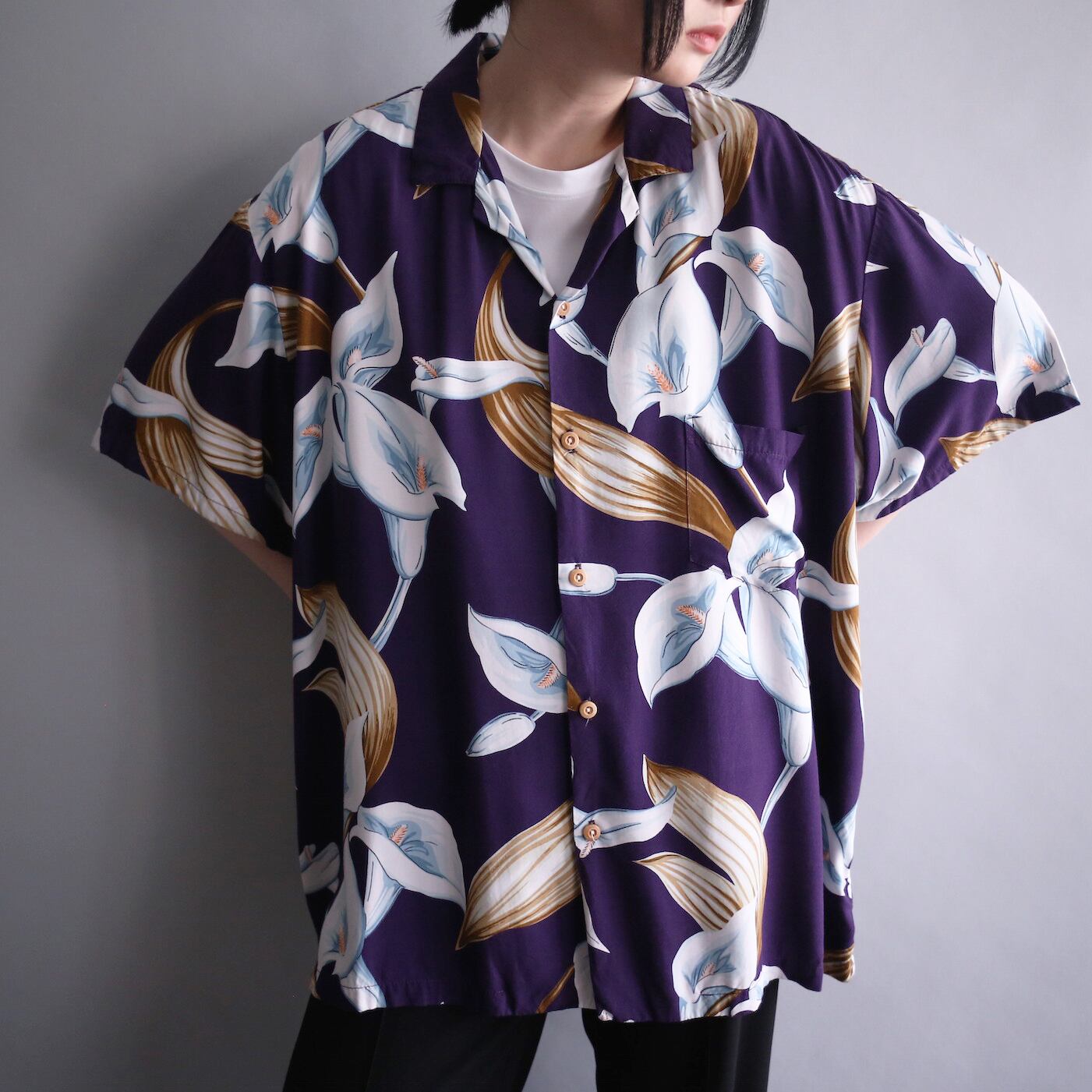 深い紫色に大判で美しい花々が満遍なく添えられたフラワーアートボタニカルシャツ