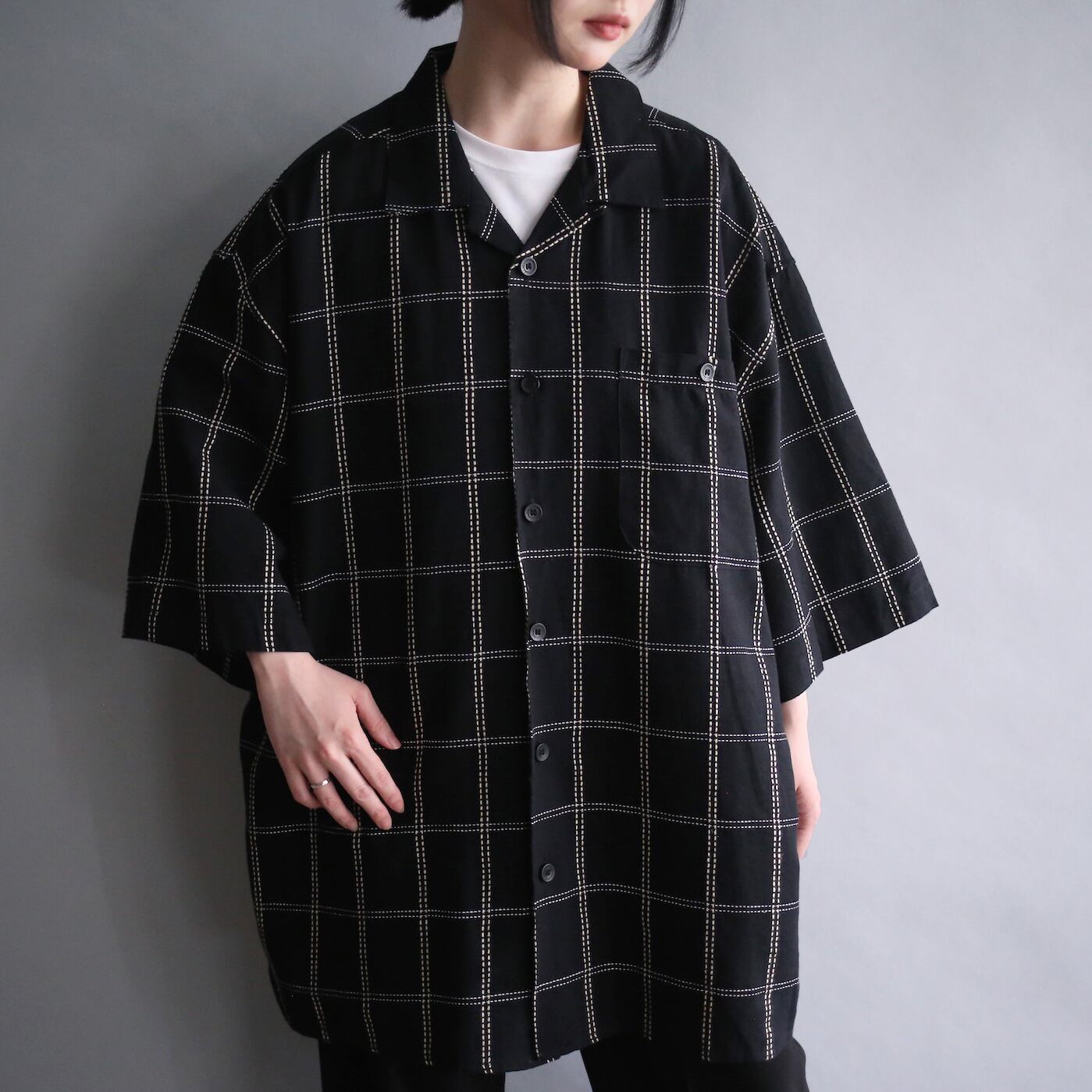黒ベースに格子柄のステッチ、コットン×リネンの生地が今にハマるビッグシャツ