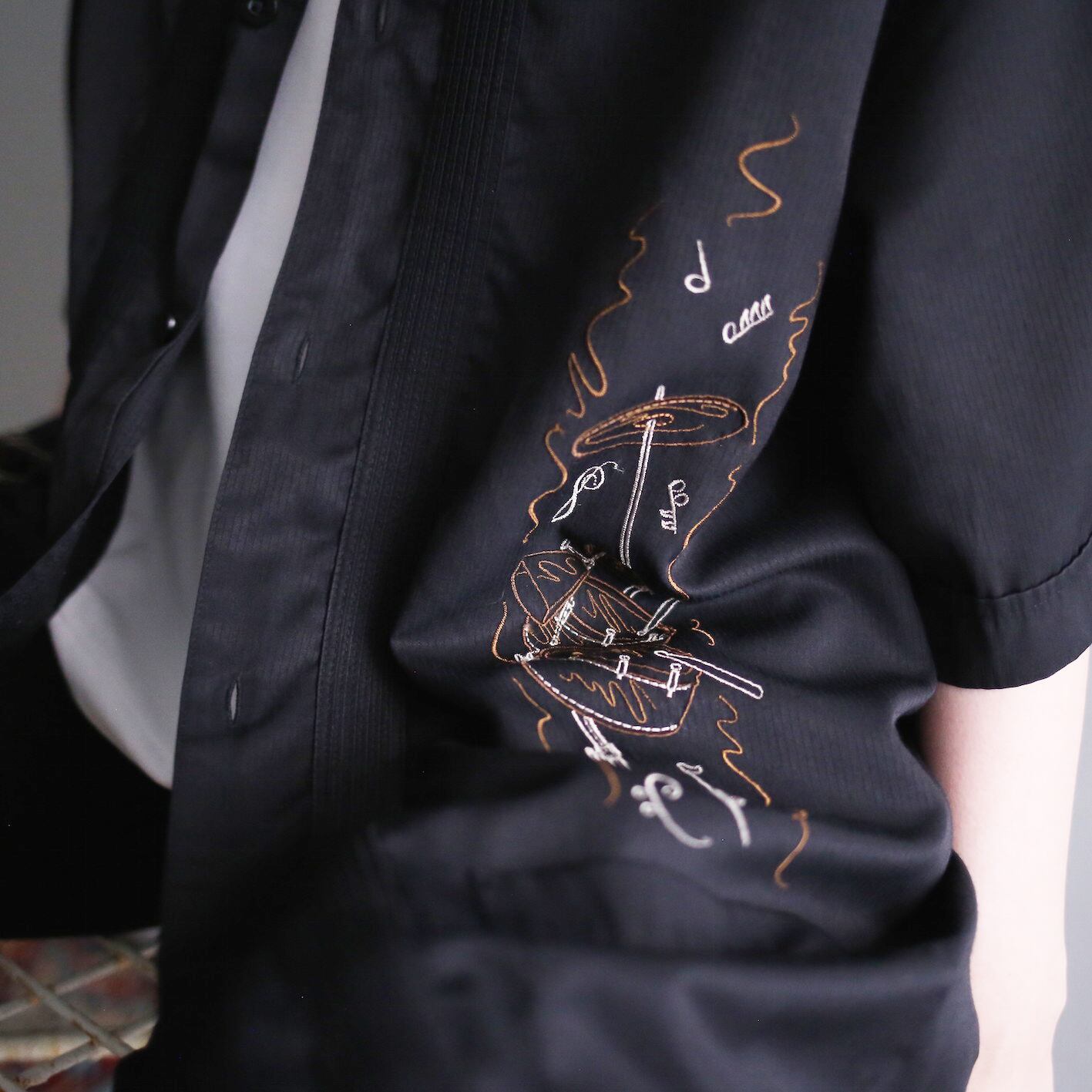 "楽器"の刺繍を左右に施し、裾にポケットを付けたシャツジャケット