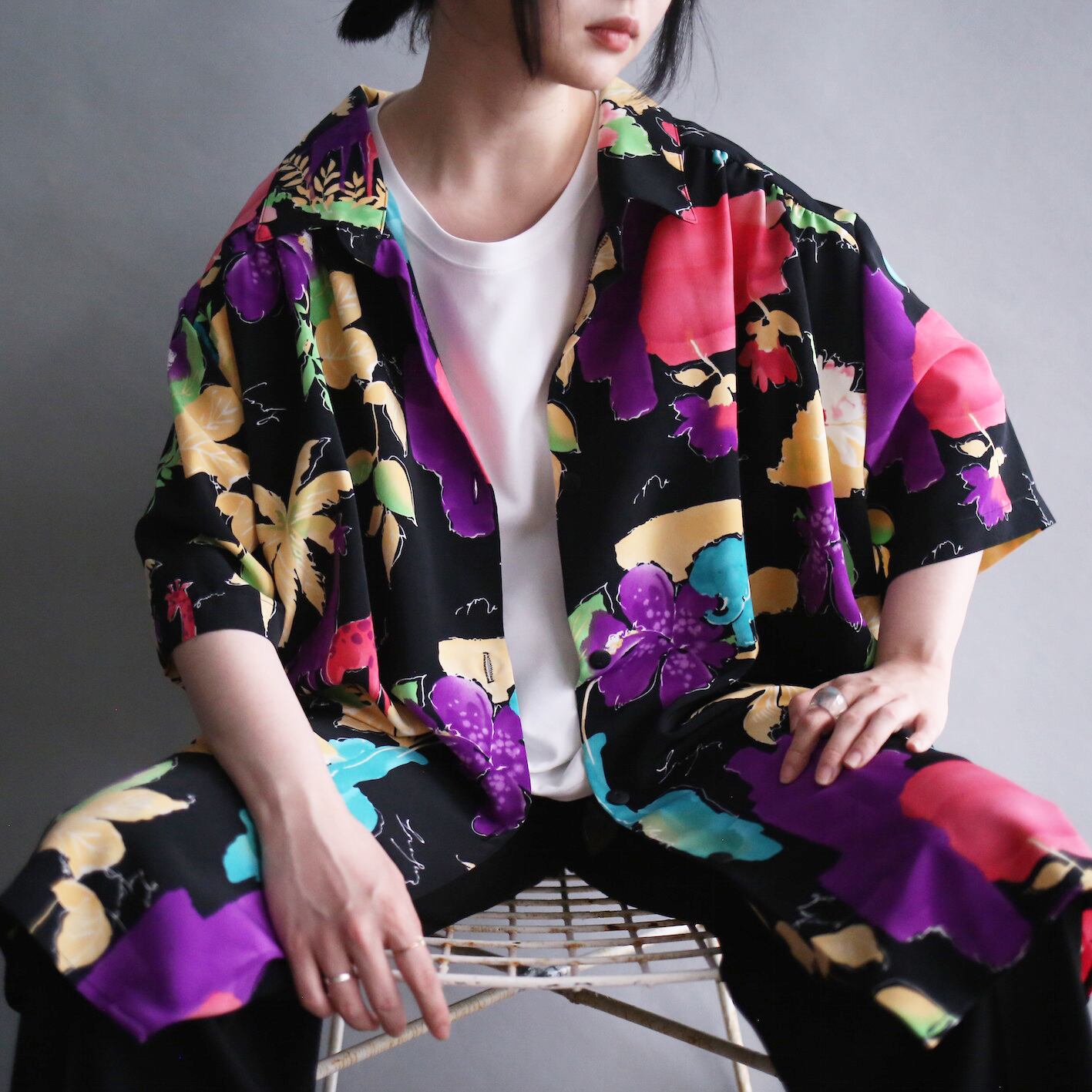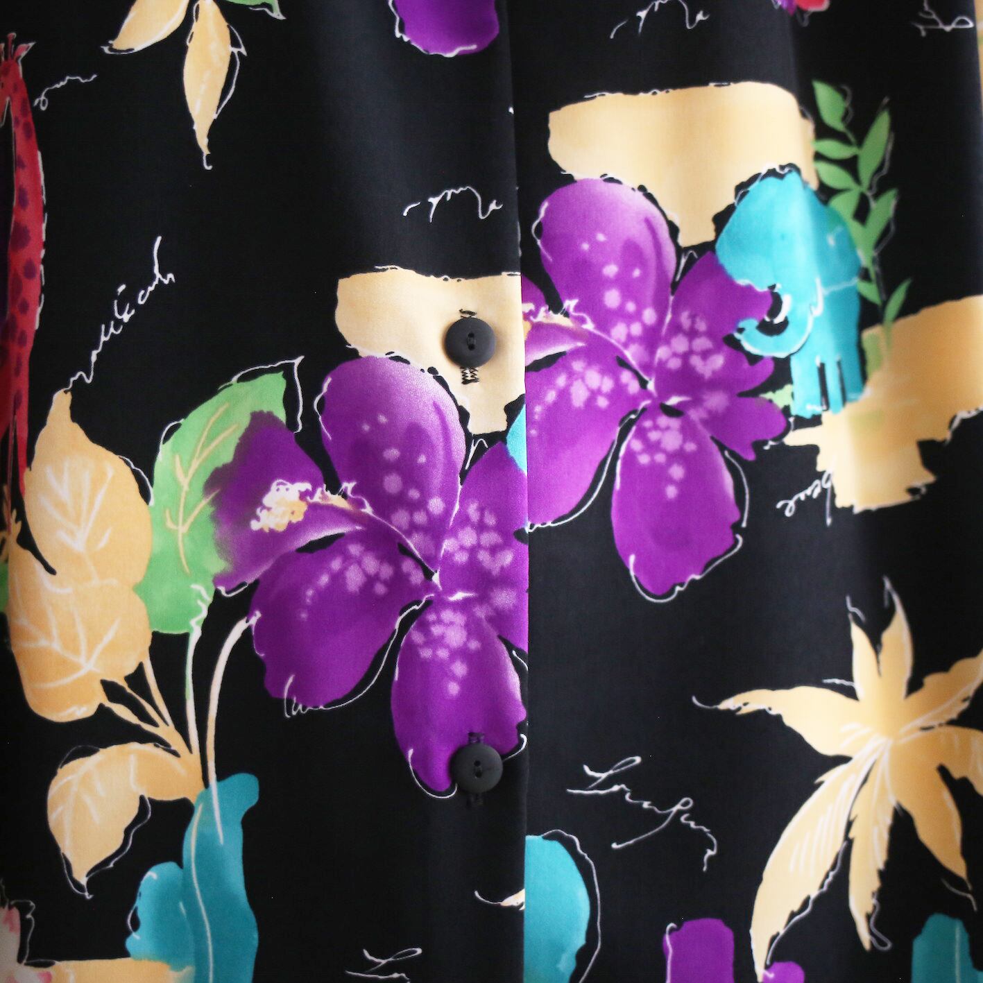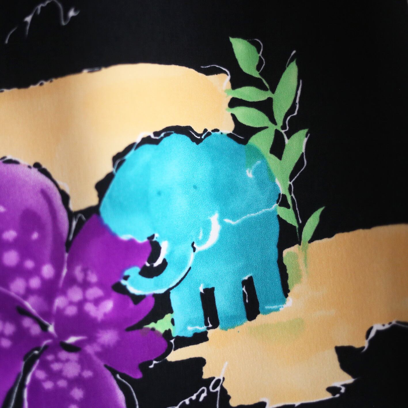 濃い黒地のモードな装いに"水彩絵の具"で描かれたような淡い濃淡を感じるアートに富んだ柄の数々、"ゾウ"や"キリン"などの動物や、大判な花柄の見事な調和を図ったグッドデザイン◎
