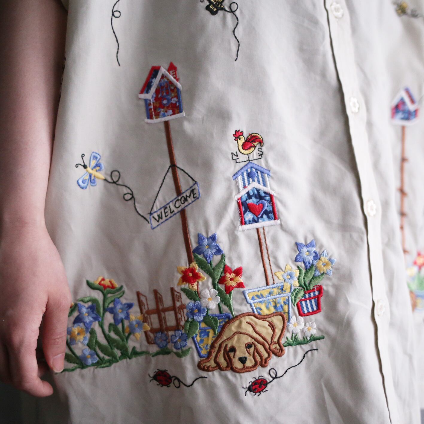 犬、てんとう虫、花、蝶々、郵便受け、平和で日常的なデザインの刺繍がカラフルな刺繍で施された贅沢かつポップなデザイン◎これ全部刺繍ってほんとにやばいですよね。