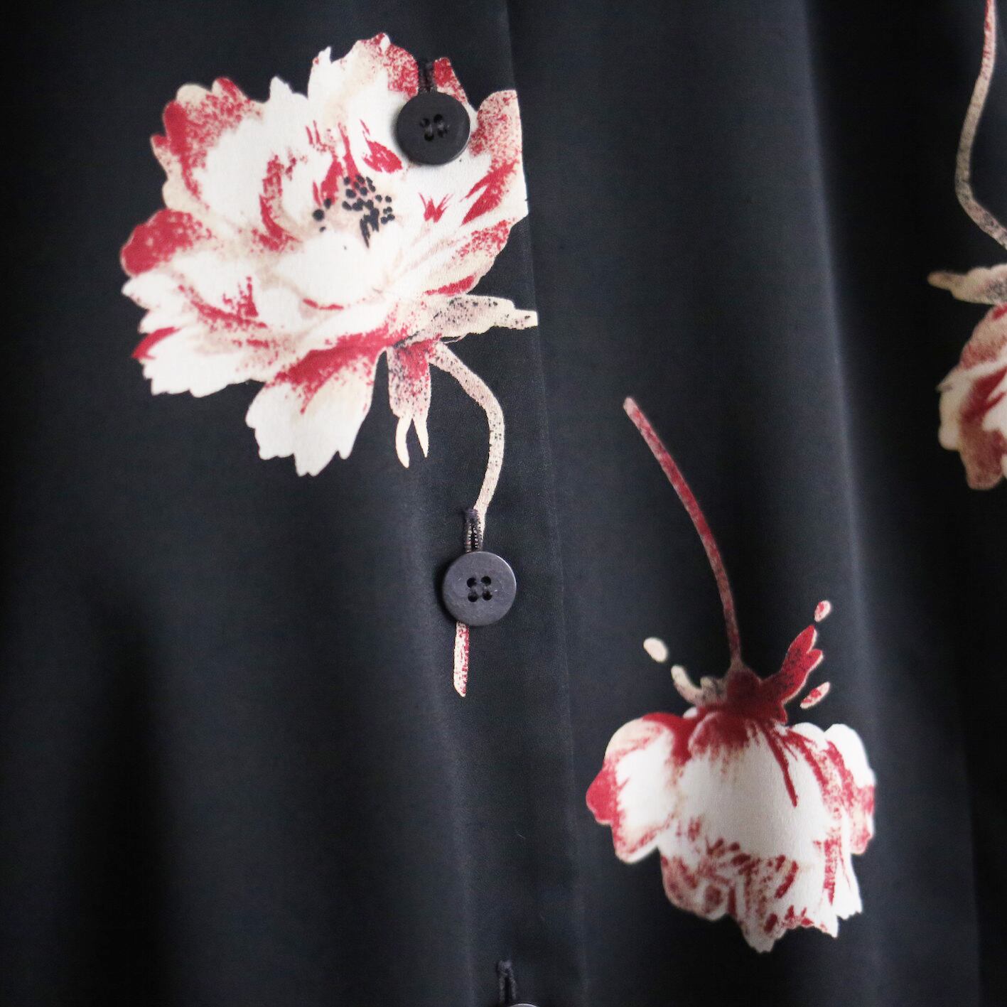 その上に凛として咲き誇る"赤×白"の大判な花柄、花びら一枚一枚まで丁寧に描かれたアート感溢れる花たちの存在感は素晴らしく、ベースの黒との相性もとにかく抜群◎