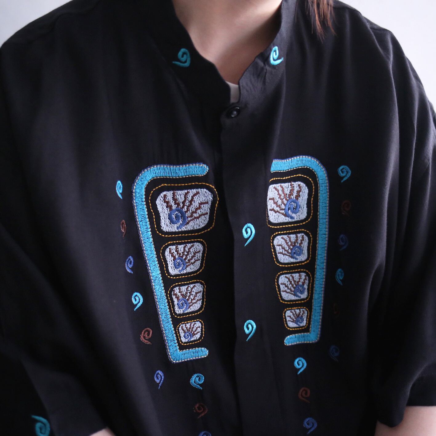 襟、袖、胸に配色抜群な刺繍を施したミニマルモードデザインシャツ