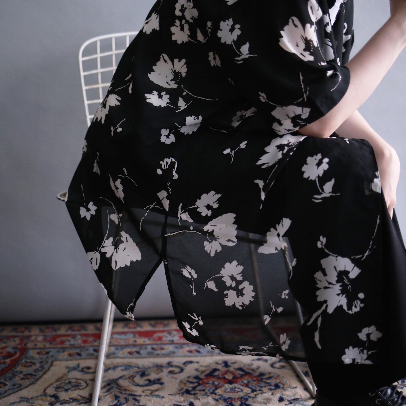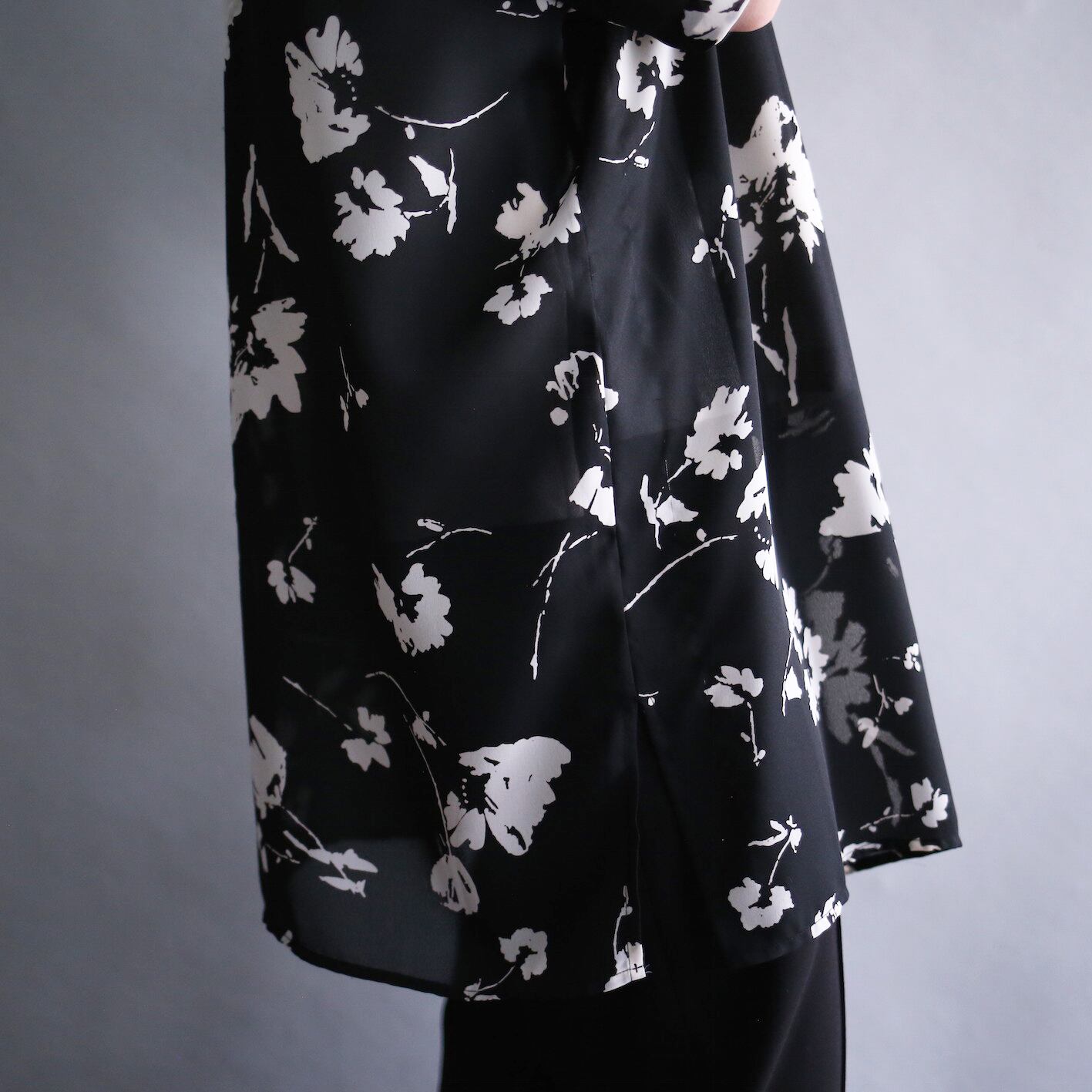 黒ベースに白の花、モード感をムンムンに放つシースルーシャツ