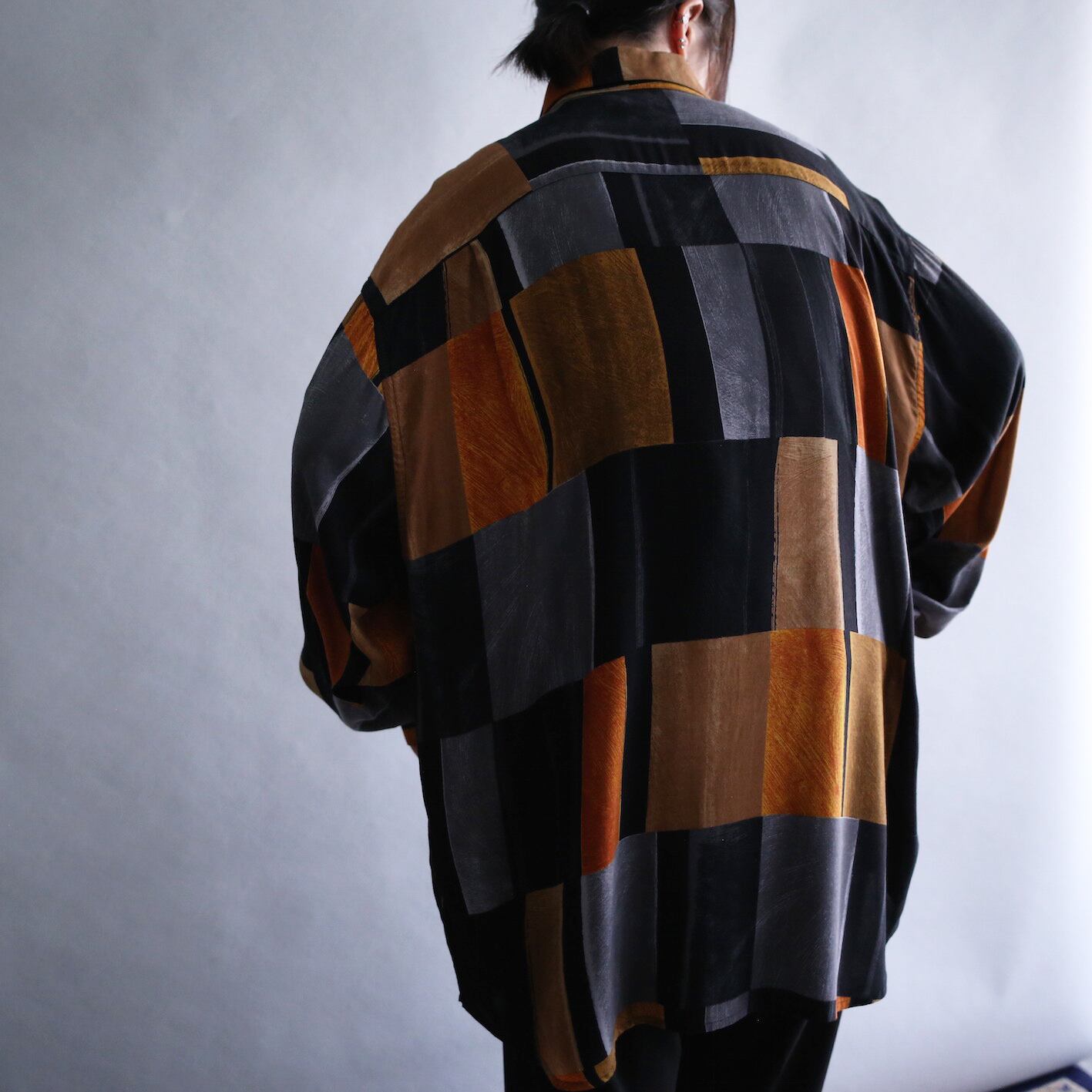モダン且つシックな雰囲気を放つ抜群の配色、大判なブロック柄が目を惹くアート柄シャツ