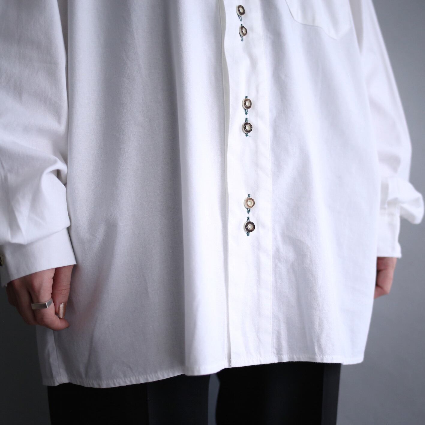 チロリアンシャツらしい鹿の角から作られたボタンや襟元の刺繍(鳥が4匹も居ます)