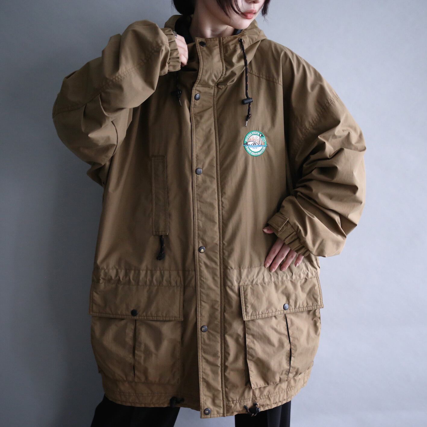 ブラウンベースの汎用性の高い色味に高い機能性を備えたオーバーサイズマウンテンパーカー