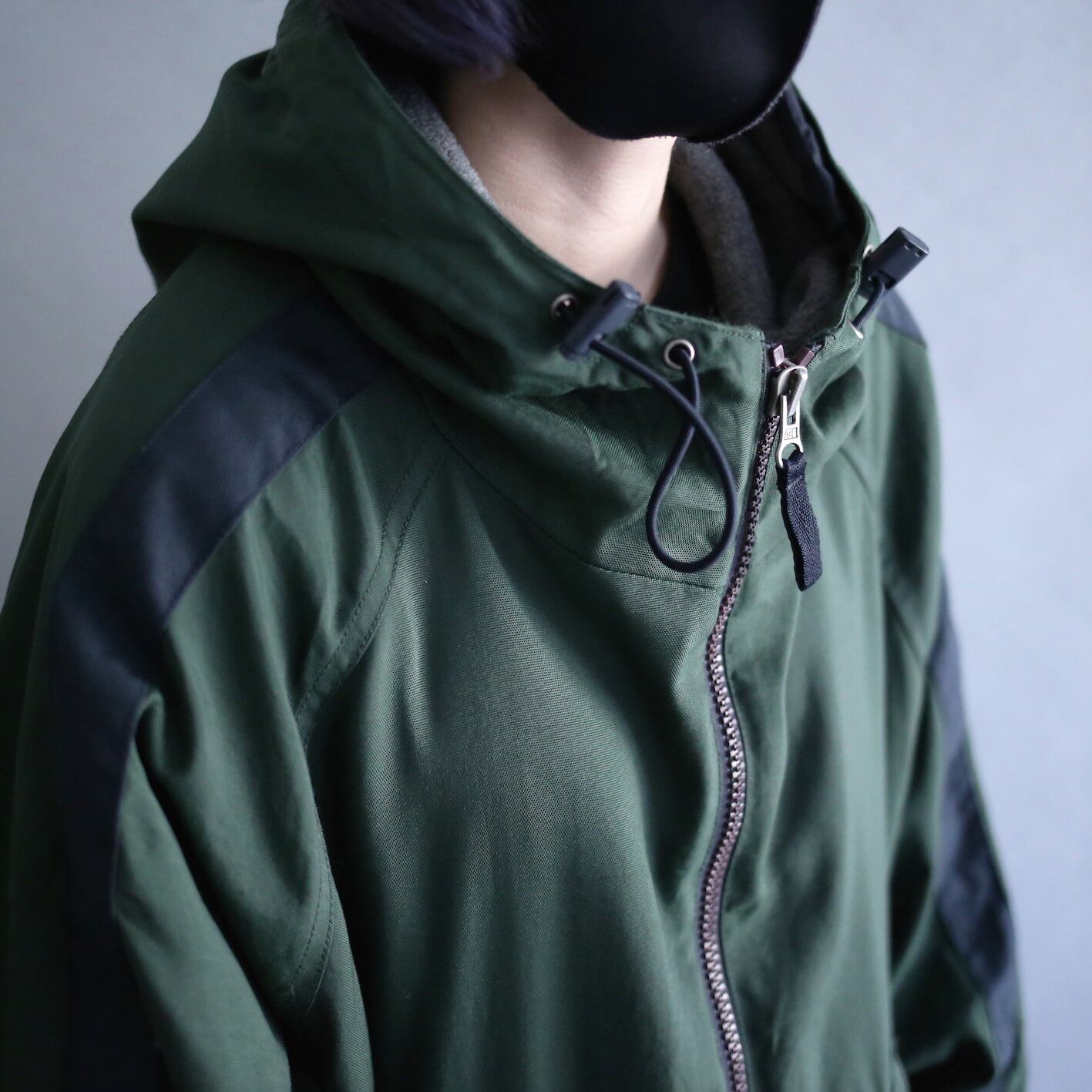 メンズ2XL相当のゆったりサイズ、色は濃い〜緑のグッドカラー、身頃部分の裏地はフリースになっており保温性も◎