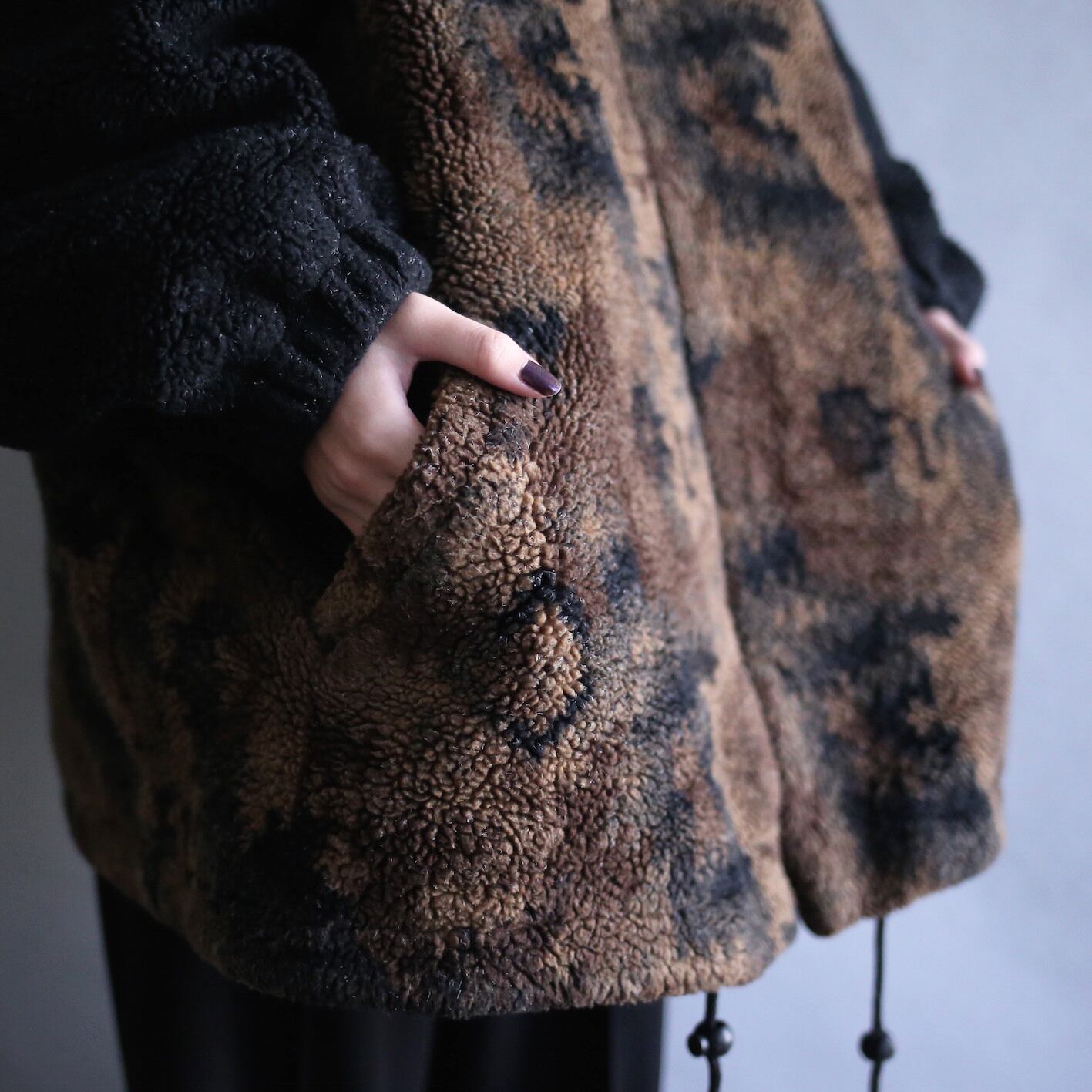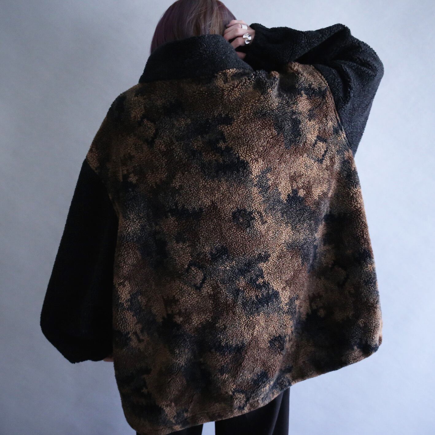 "唯一無二"なデザインも凄いですが、身幅とアームが広いワイドサイジングでアウターとしては嬉しい"ガバッと"ゆる〜く纏えますし、見頃は"柄"襟と袖のは"無地"に切り替えた絶妙〜な配色バランスもグッと来ますよね〜