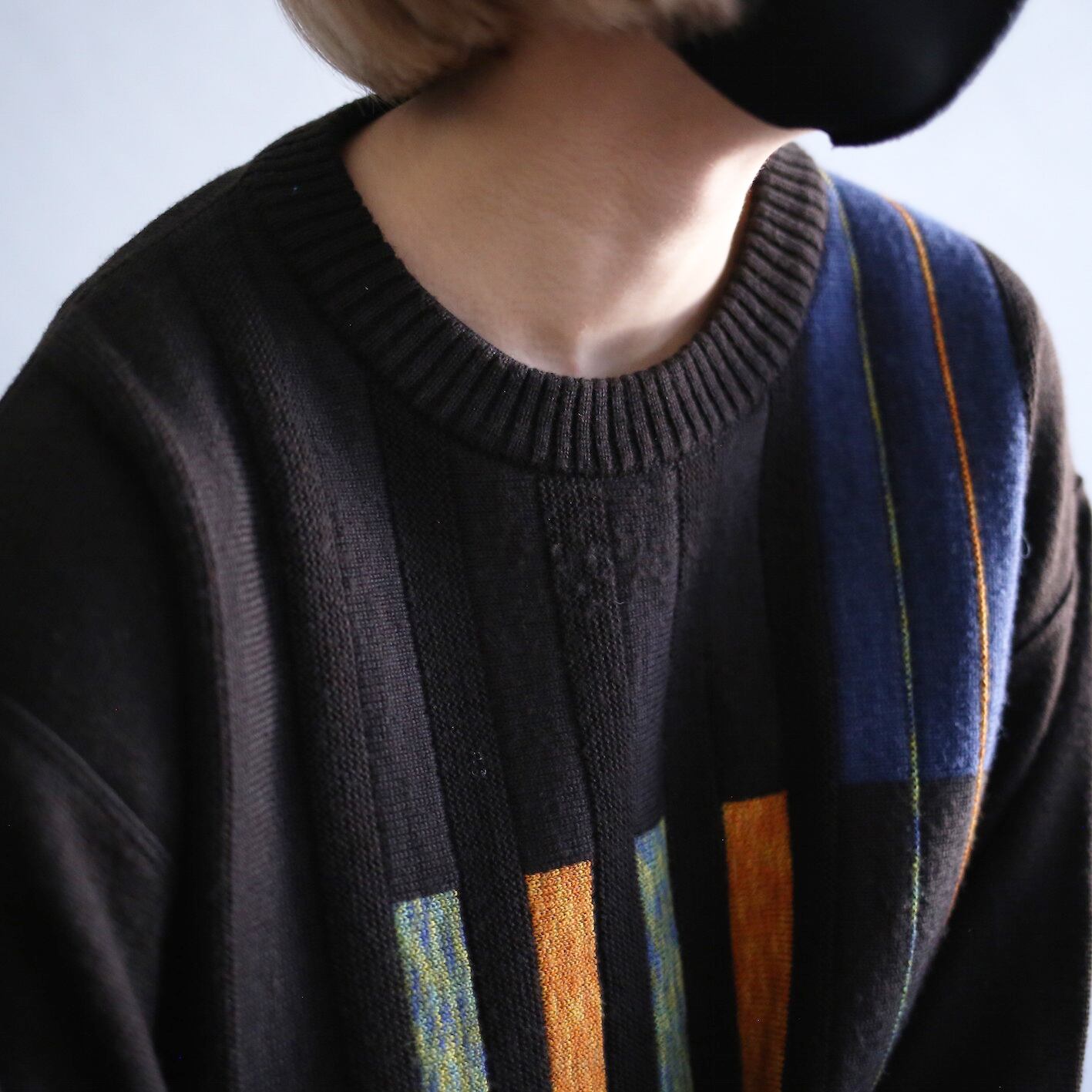 黒地に発色の良いアクセントカラーが効いたデザインニット