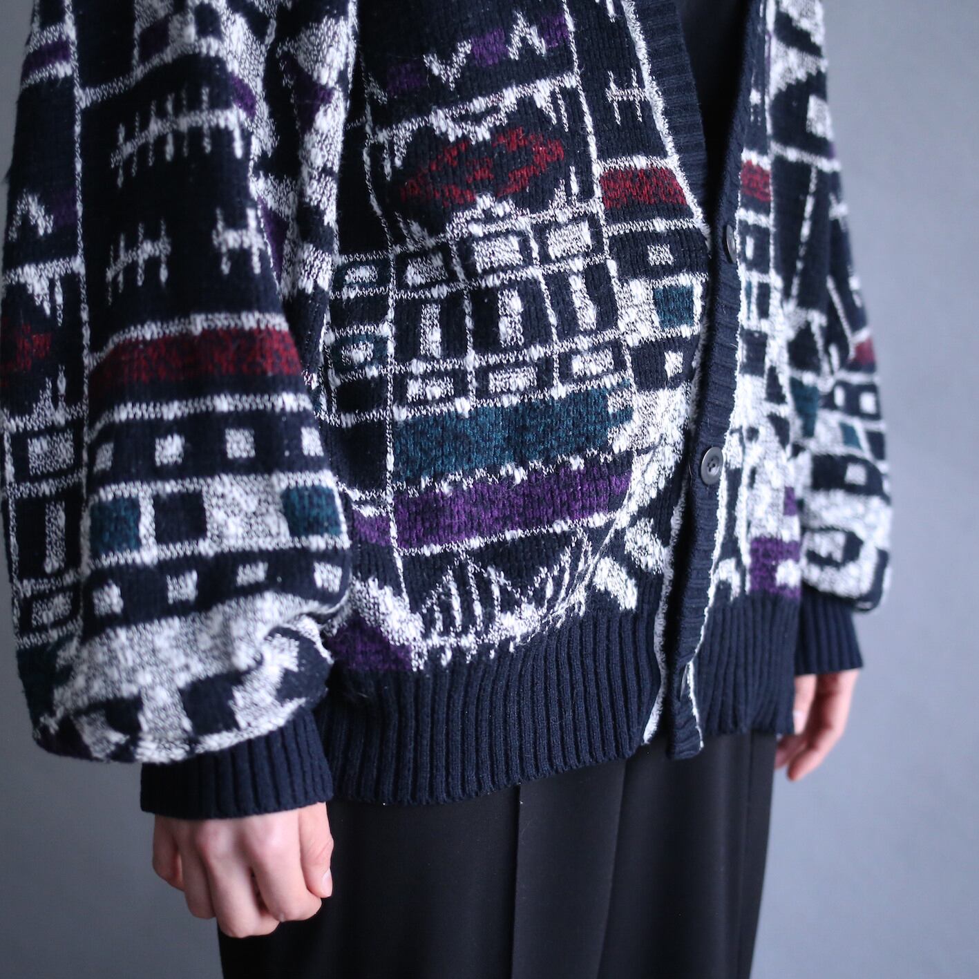 モノトーンな配色を軸に差し色を加えたダークなカラーリング、幾何学的な柄が古着らしさを演出する極上カーディガン