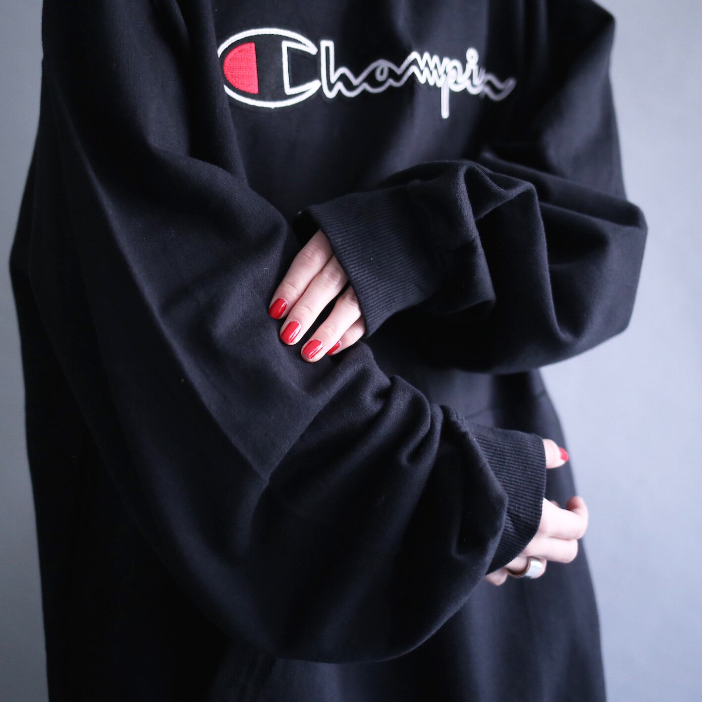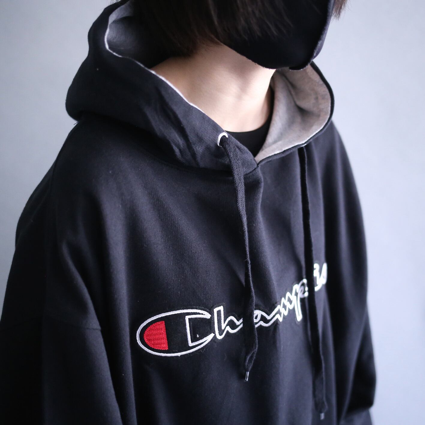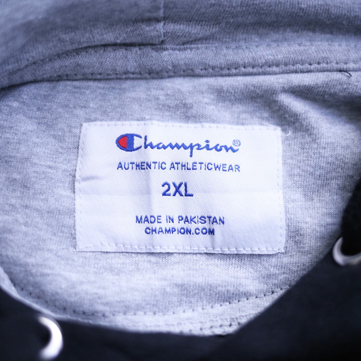 サイズは安心安全のオーバーサイズ(2XL)、ボディは鉄板にして無敵の黒、フロントには"Champion"のロゴワッペン、左袖にはチャンピオンの"目玉"付きでアクセントも抜かりなし