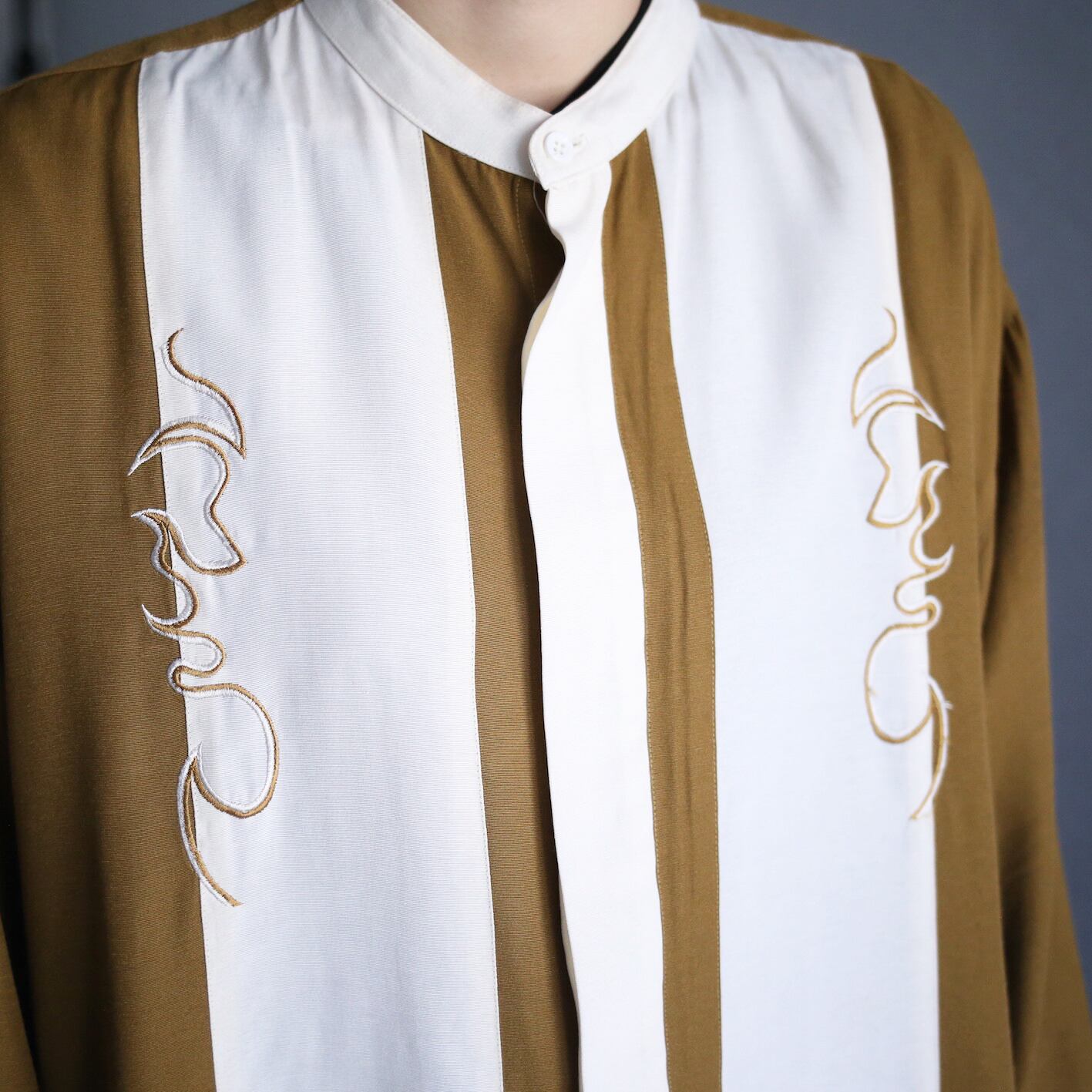 くすんだ茶色と白のバイカラー切り替え、さらに両胸に流線型の刺繍を乗せたスペシャルシャツ