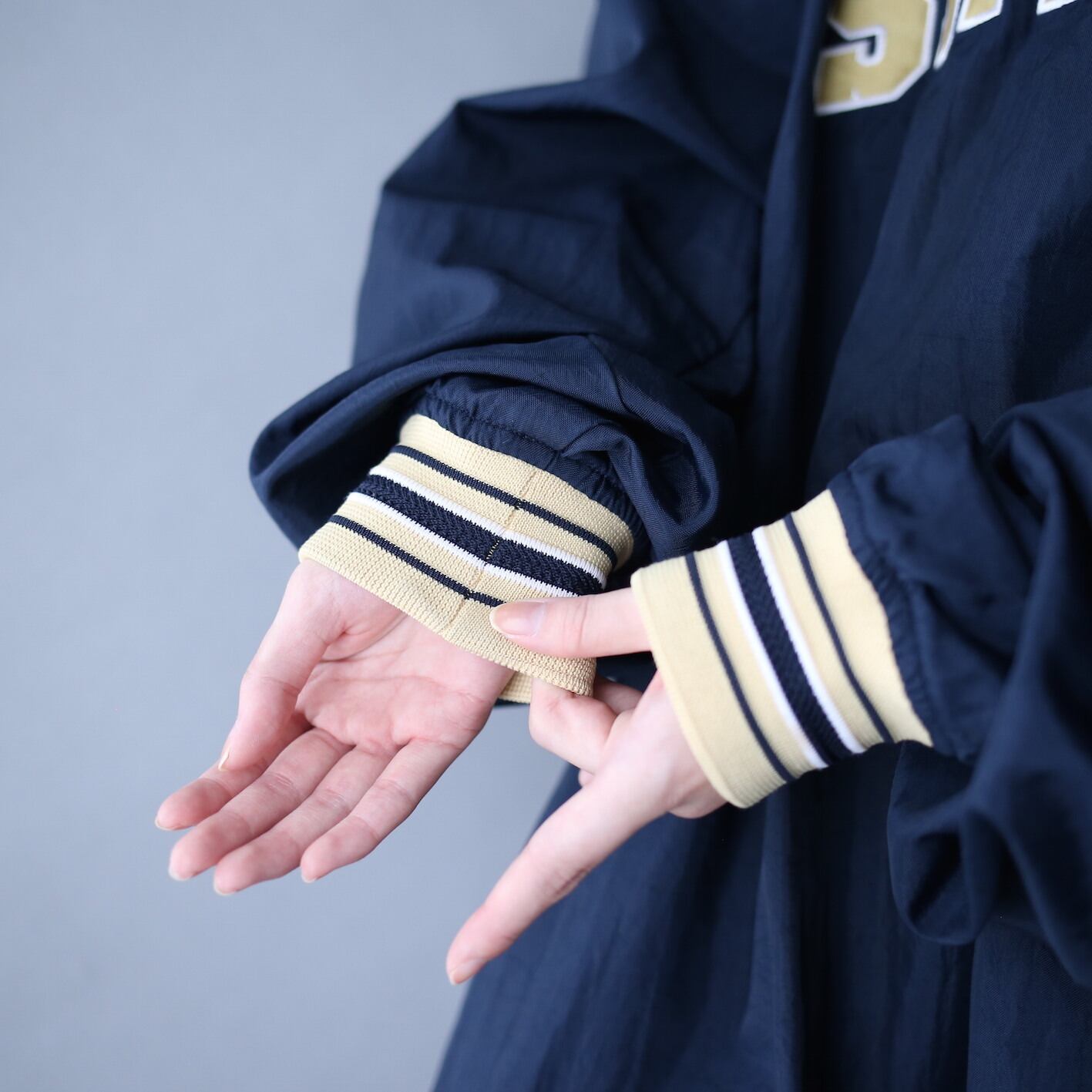 襟、袖口には肉厚のニットリブ、そして中央と左肩には"ST.PLUS X"のカレッジ名とロゴマークの刺繍ワッペン付きでアクセントも抜かりなく