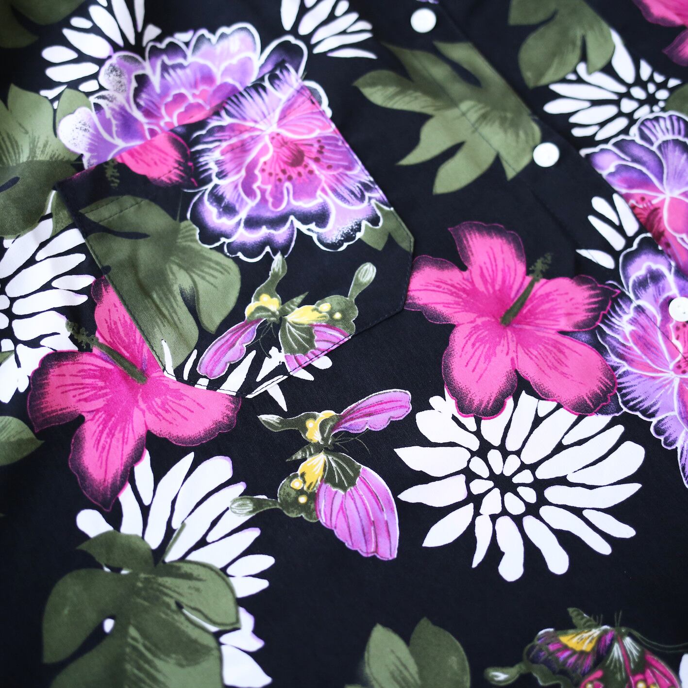 柄もピカイチでモードに映える黒をベースに色鮮やかな草花の総柄、蝶々が所々に姿を現し幻想的な世界へと導いてくれます