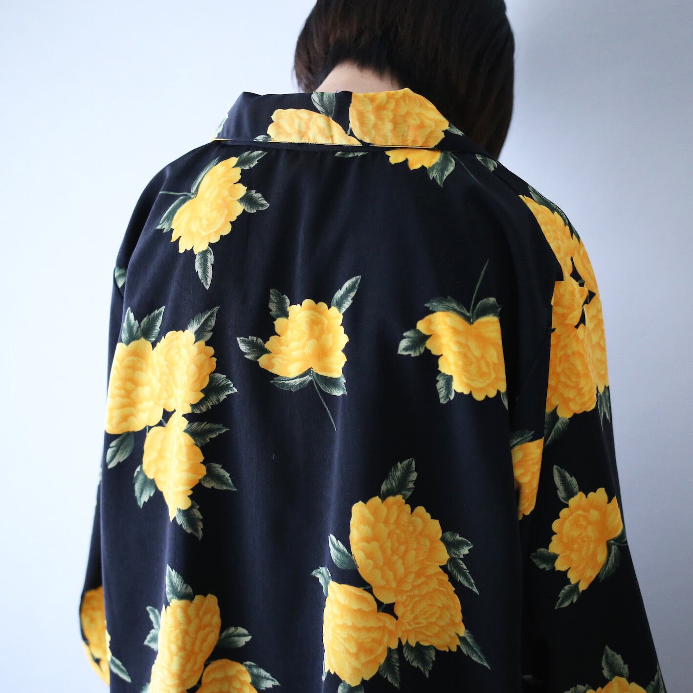 モードに映える黒に大判な黄色い薔薇を全体に散らした総柄デザインシャツ