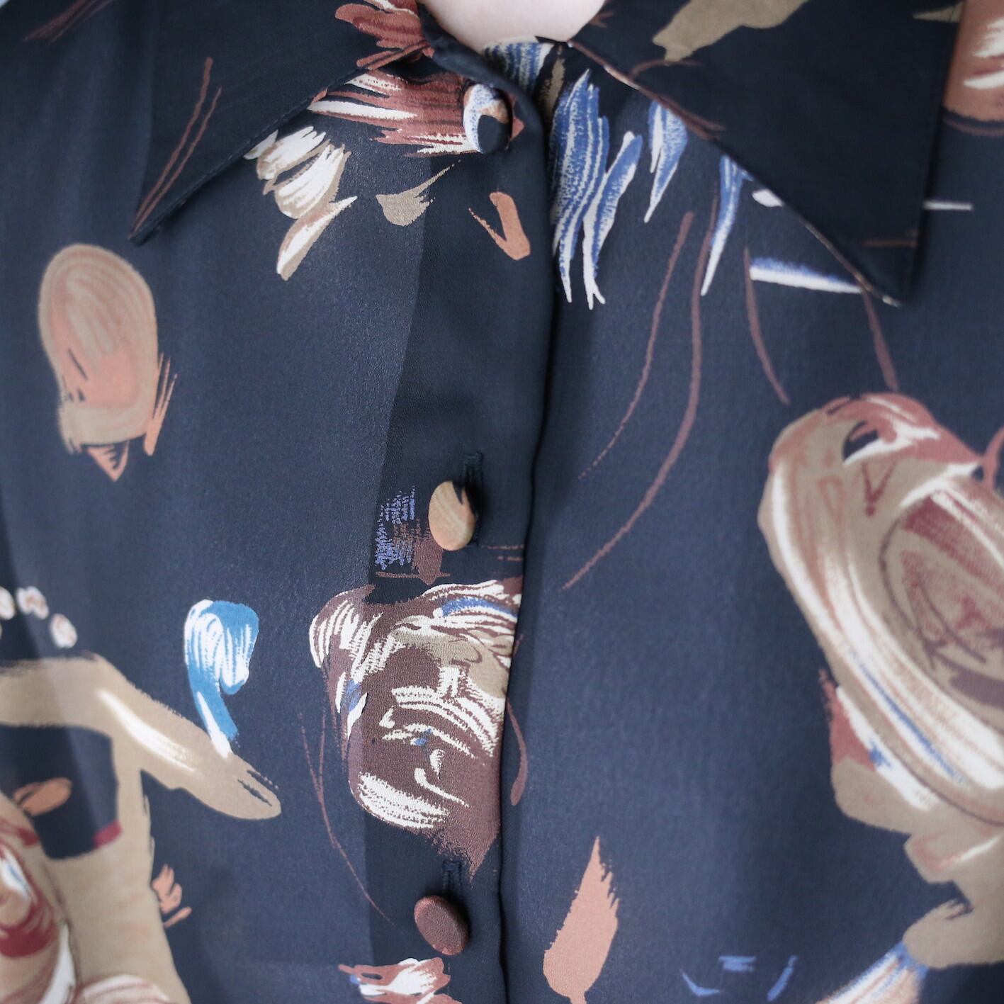 服全体に描かれたアーティスティックなペイント柄、ボタンは一つ一つが柄のテイストに合わせた包みボタン